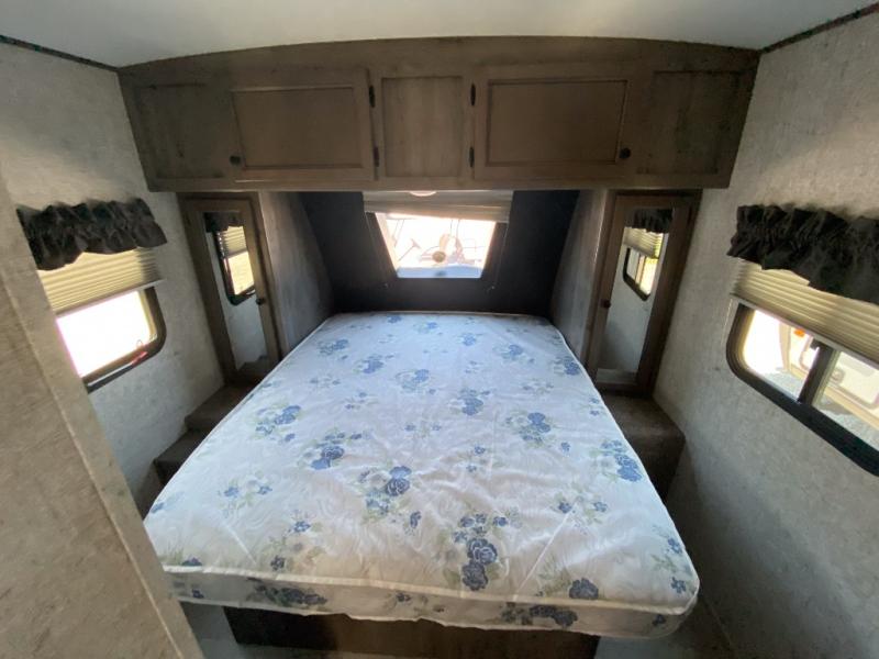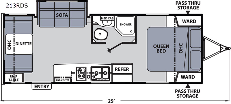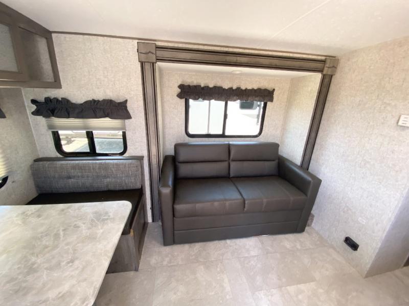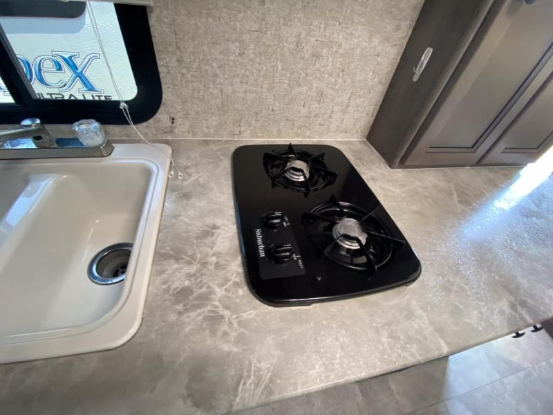 Enjoy each camping adventure with this Apex Nano as your home base! This unit features all of the necessities, plus some added space thanks to the slide out sofa. Model 213RDS offers sleeping for 4-5 with a queen bed up front and the furniture provided. You can make meals for the family with the kitchen amenities, and wash up after a fun day in the full bathroom. There is plenty of storage throughout on the interior along with a front exterior pass-through compartment for those larger items. Load up your family and gear, and start making memories!