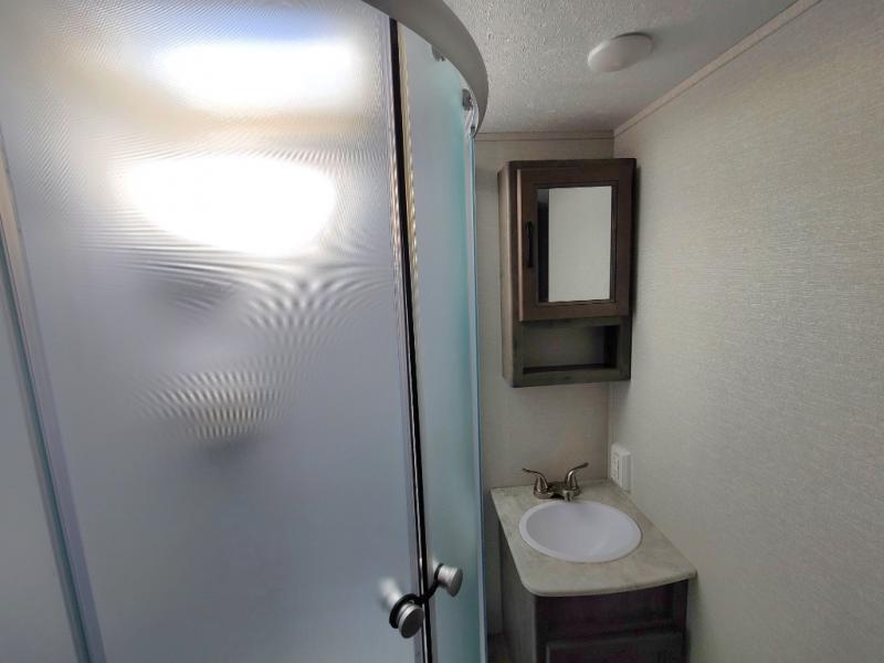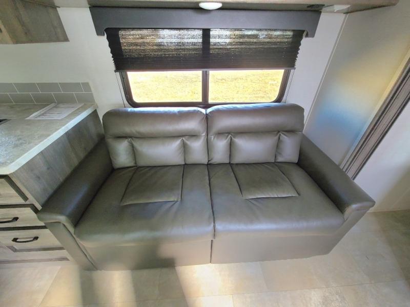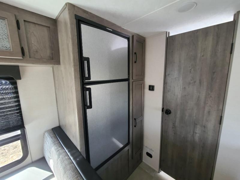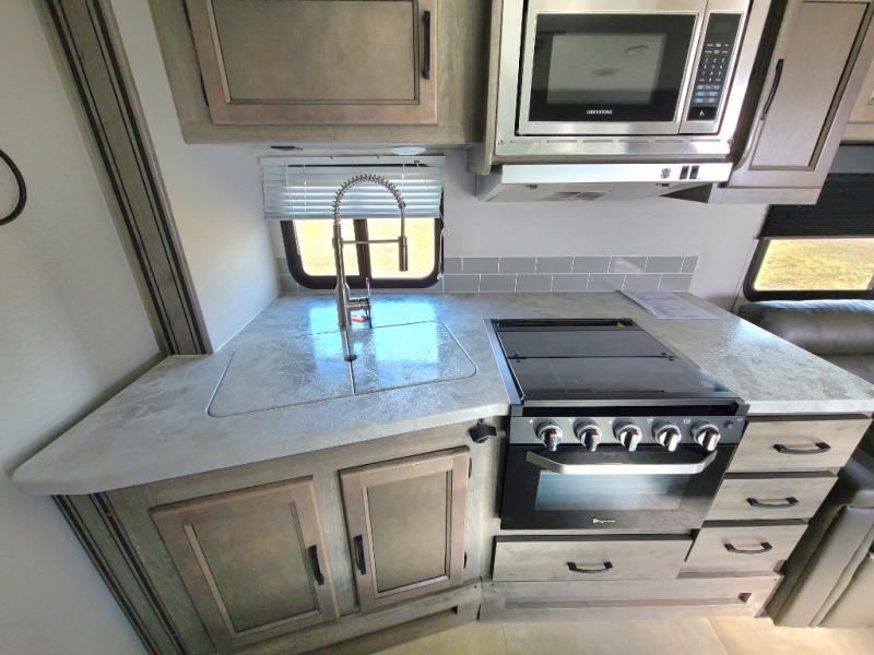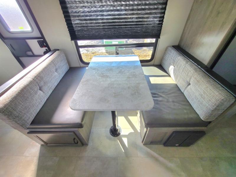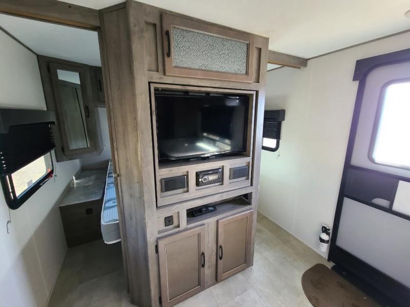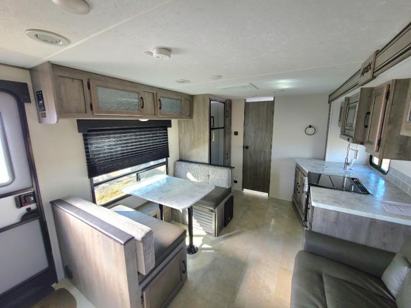 Eat, sleep, relax, and play all in this lightweight travel trailer that includes a large slide out for more interior space. After you've set up camp, have a look around the campground, then come back to prepare lunch on three burner range or use the outside kitchen. This model features a power awning with LED lights and exterior speakers with LED Lights to create an outdoor living space you are sure to love. When it's time to call it a night, the front private bedroom with a queen bed will be the perfect stop to rest your head and your guests will find sleeping space on sofa and dinette once folded down.