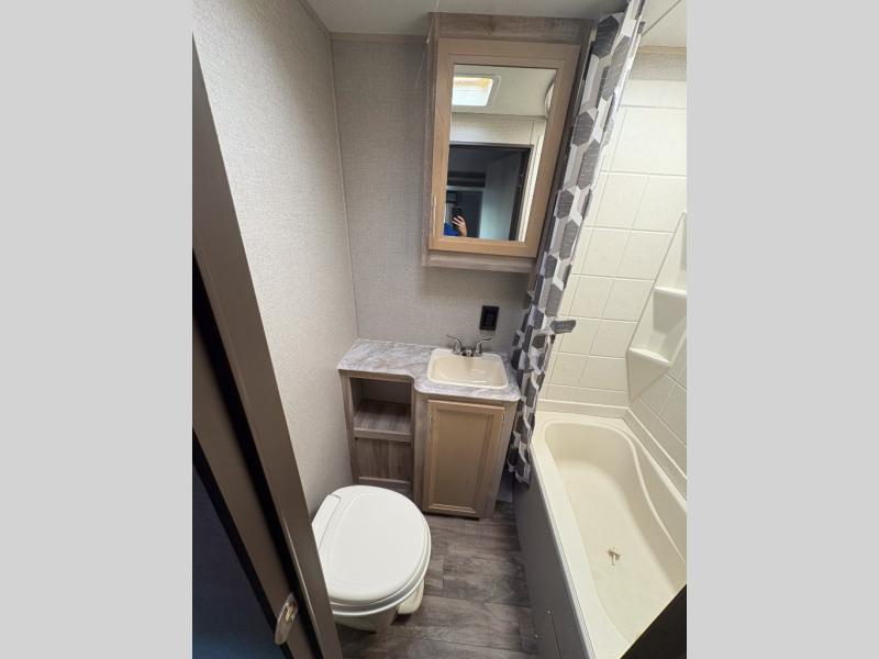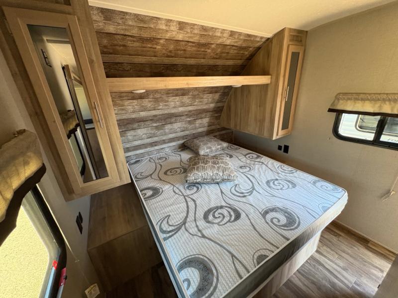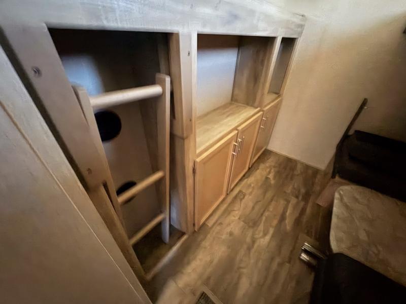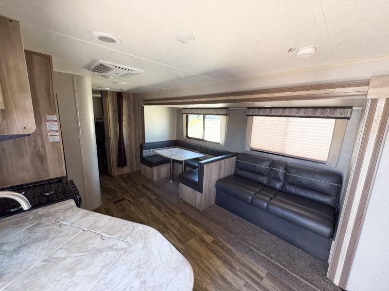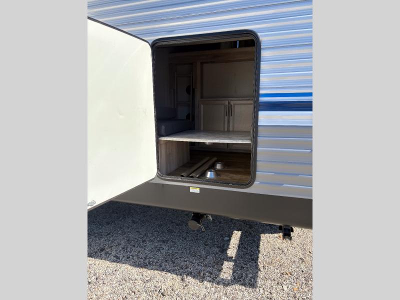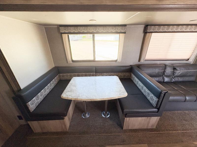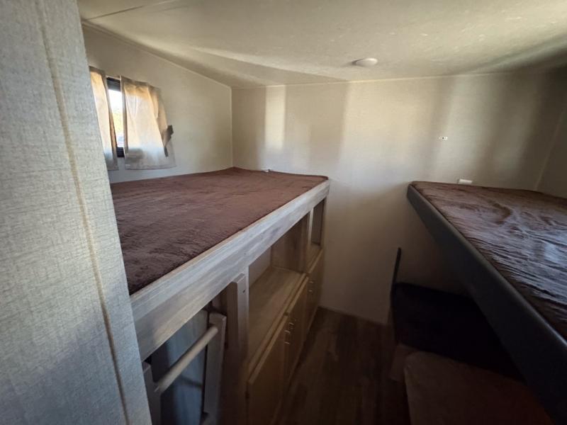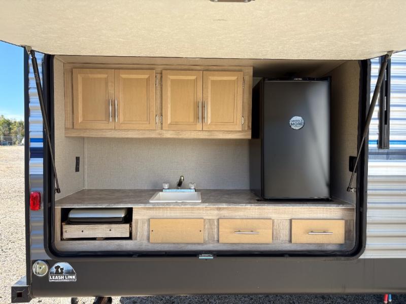 Camping just got a lot more fun with this bunkhouse model which provides your kiddos their own space at night including a kids dinette to play games at. You can enjoy your own private room on the opposite side as you fall asleep on a queen bed. Each morning everyone can meet in the middle to make breakfast and dine at the U-shaped dinette or sit on the sofa with cupholders. You might like to add the optional exterior full size camp kitchen to give you more options and space to prepare and cook meals. You will find that the easy store door allows you to load more items through the exterior to the interior, and the exterior pass-through compartment keeps your outdoor gear away from the inside items under your bed.