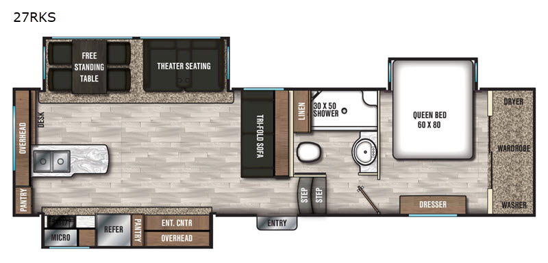 You can have your own front private bedroom with a queen bed slide for you to enjoy a good night's rest, along with a dresser, and a full-wall wardrobe, which is prepped to add an optional washer and dryer. You can also bring along all of your favorite camping goodies and easily store them inside one of the two pantries in the kitchen and enjoy them at either the free standing table and chairs, the theater seats with cup holders, or the tri-fold sofa. The desk will allow you to telecommute while camping or use as a space to keep your cell phone and such. When you want some fresh air, grab a camp chair and your favorite drink, and head underneath the 15' electric awning with LED light strip so that you can enjoy time outdoors during the day or night!