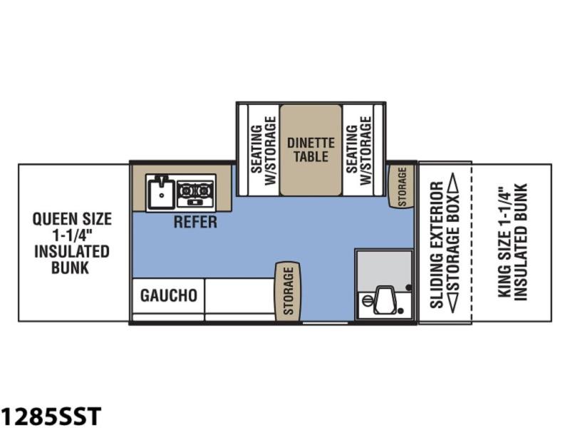 Don't miss any creature comforts with your own king and queen tent end bed, a modular cassette Potti or choose the optional Thetford Porta Potti, plus a gaucho and dinette to relax inside when the weather isn't just right outside. The slide out offers additional floor space and storage under the dinette seating, and you will find more storage throughout including bunk nets. The chef can make meals on the two burner range and you can dine inside or outside under the awning. The residential laminated countertops are easy to clean and provide extra space for preparing meals and placing your sunglasses and such. You will also find a sliding exterior storage box making it easy to stow away some of the outdoor gear.