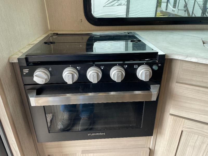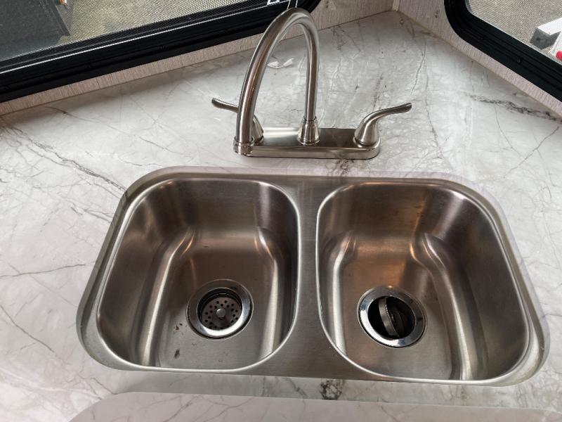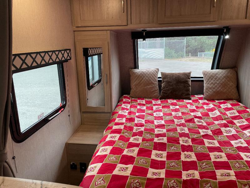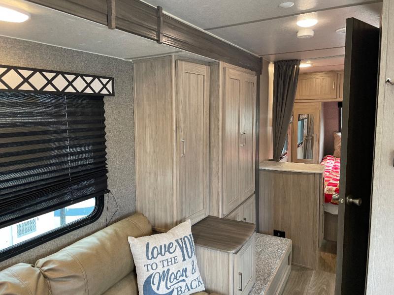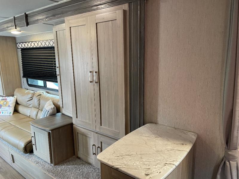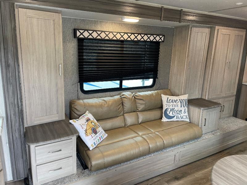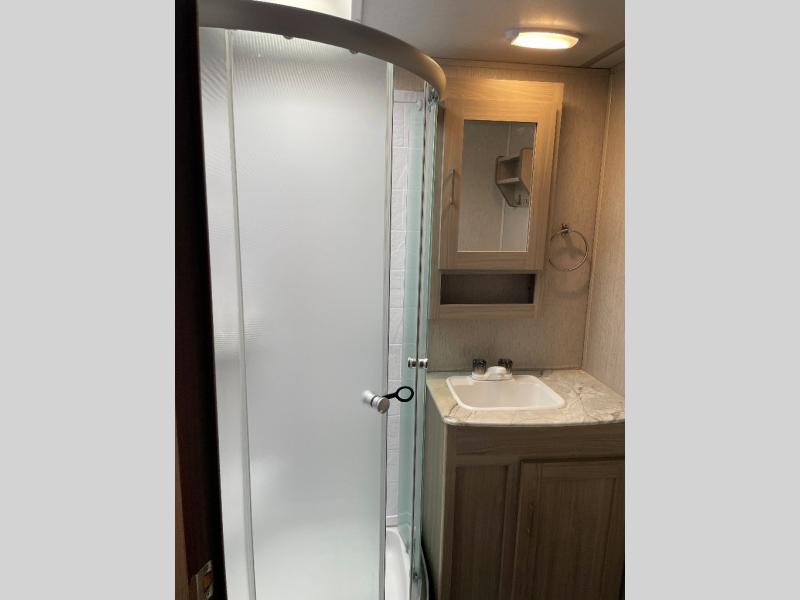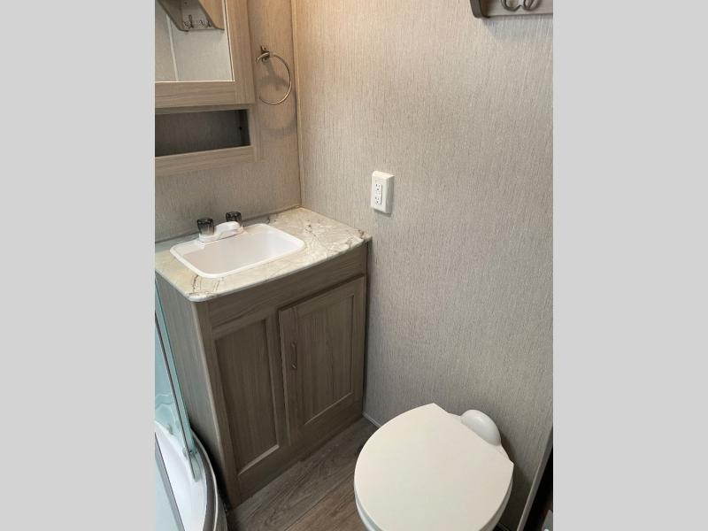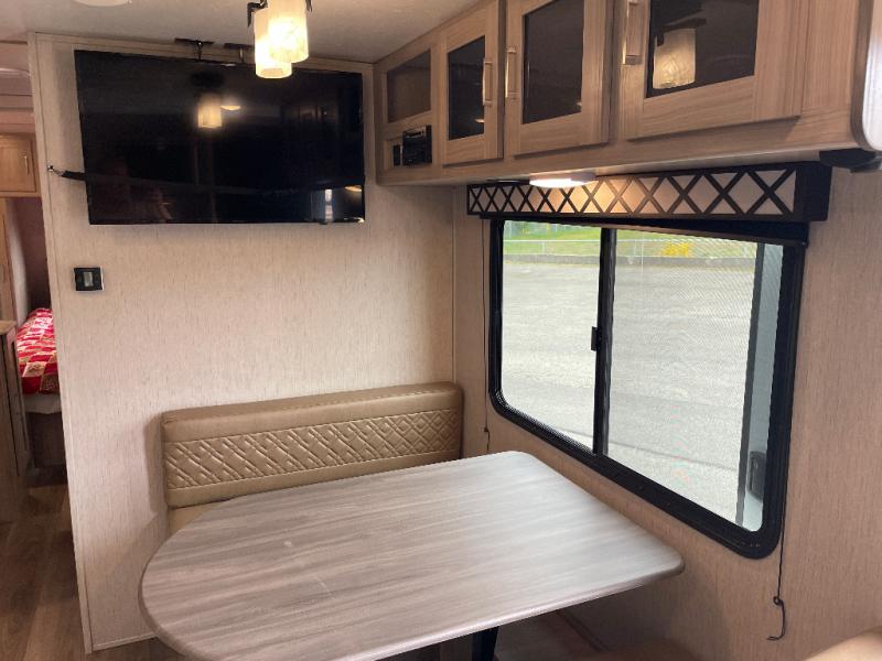 If you're looking for an RV to fit your family of five, this Freedom Express Ultra Lite travel trailer with a large slide out will be perfect for you. Within the slide out you'll find a sofa that can also be converted into additional sleeping space. There is a wardrobe with bench so that you can store your shoes and jackets and have a place to sit down in order to put on those hiking boots! The dinette includes a removable resin outdoor table, and the rear kitchen has all the amenities you need to prepare a home-cooked meal. This unit features a front bedroom with a queen bed and privacy curtains so that you can enjoy your own space.