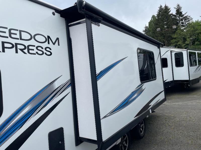 With any Freedom Express Ultra Lite travel trailer by Coachmen, you will appreciate the ease of towing behind your family vehicle. All the tanks are located under the floor to lower the center of gravity for increased storage capacity and improved handling down the road. Inside of each trailer, you'll enjoy features such as LED lighting throughout, Congoleum Designer Carefree flooring, an LED TV, plus a double-door refrigerator, just to name a few. The pass-through storage with an LED light strip allows you to easily bring along those larger camping items, plus there is an electric awning with LED lights outdoors, as well as an exterior shower station to wash off your hiking boots. Come see how you have the freedom to explore in a Freedom Express Ultra Lite travel trailer today!