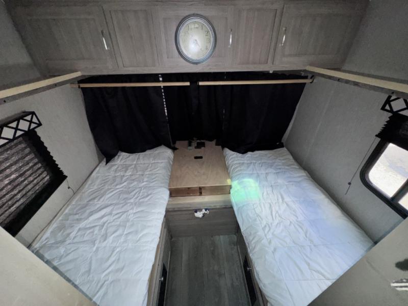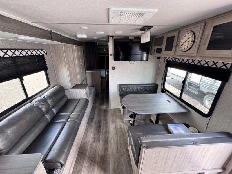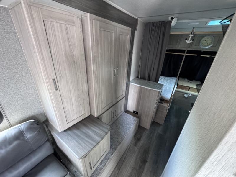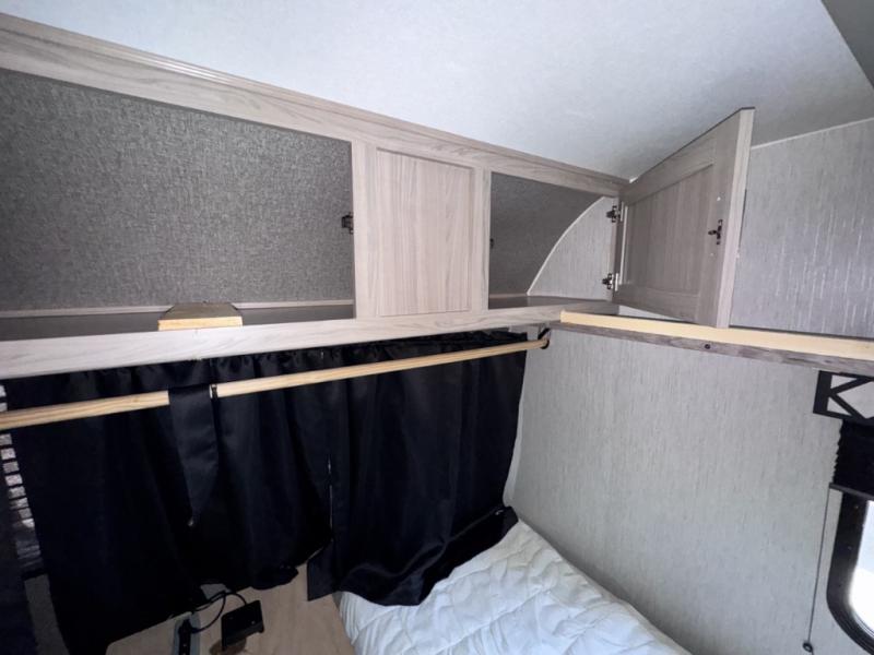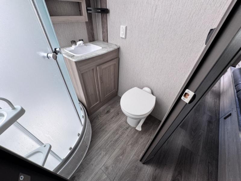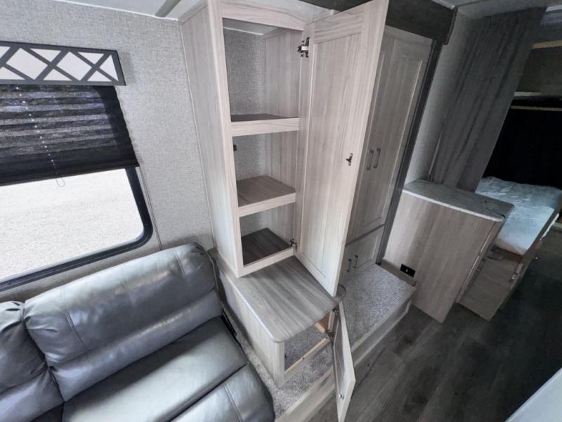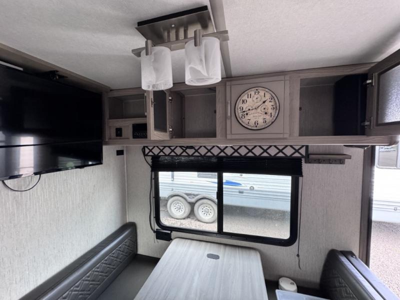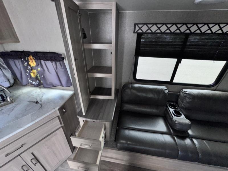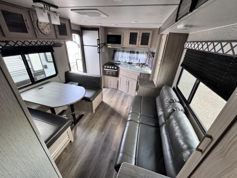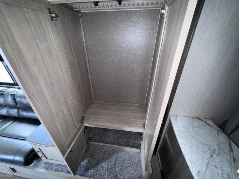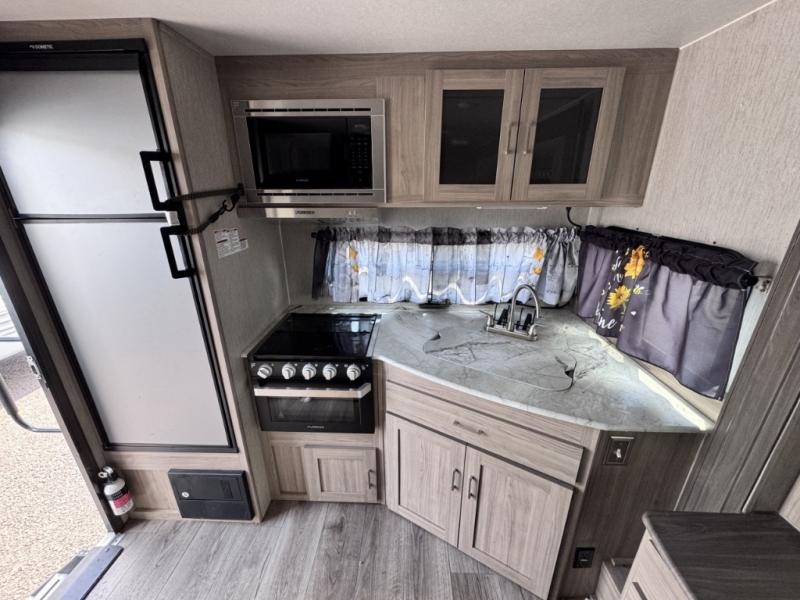 If you're looking for an RV to fit your family of five, this Freedom Express Ultra Lite travel trailer with a large slide out will be perfect for you. Within the slide out you'll find a sofa that can also be converted into additional sleeping space. There is a wardrobe with bench so that you can store your shoes and jackets and have a place to sit down in order to put on those hiking boots! The dinette includes a removable resin outdoor table, and the rear kitchen has all the amenities you need to prepare a home-cooked meal. This unit features a front bedroom with a queen bed and privacy curtains so that you can enjoy your own space.