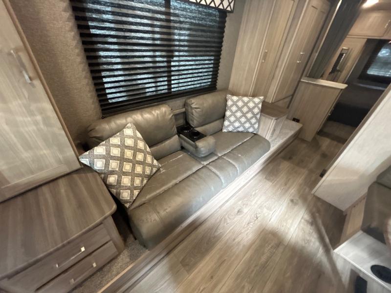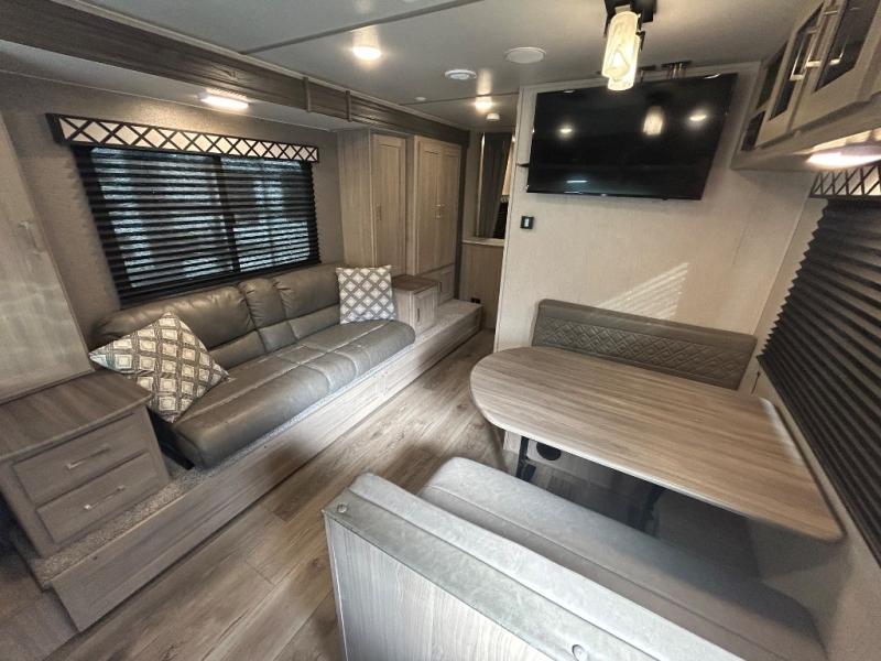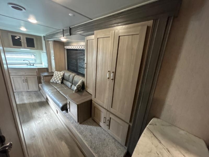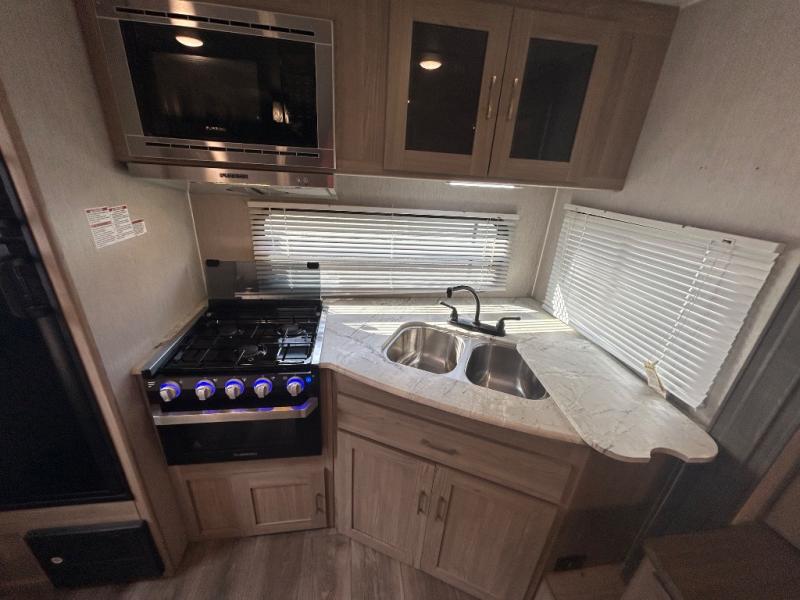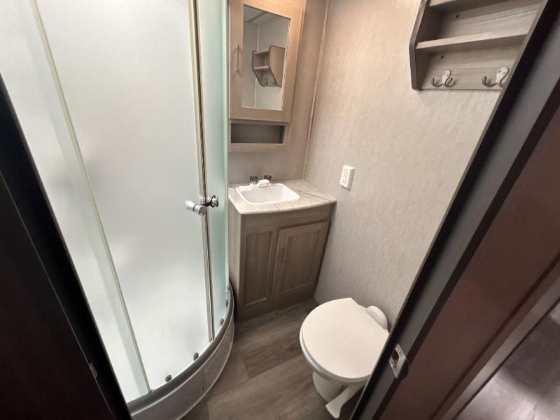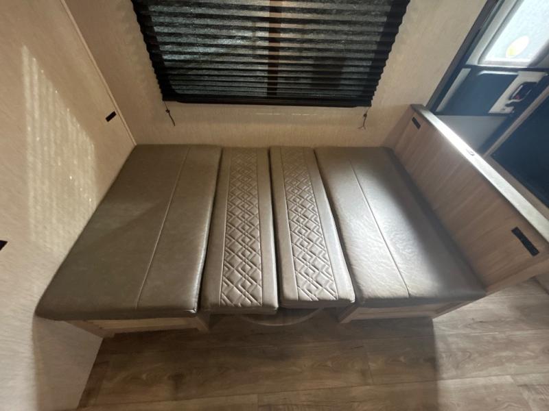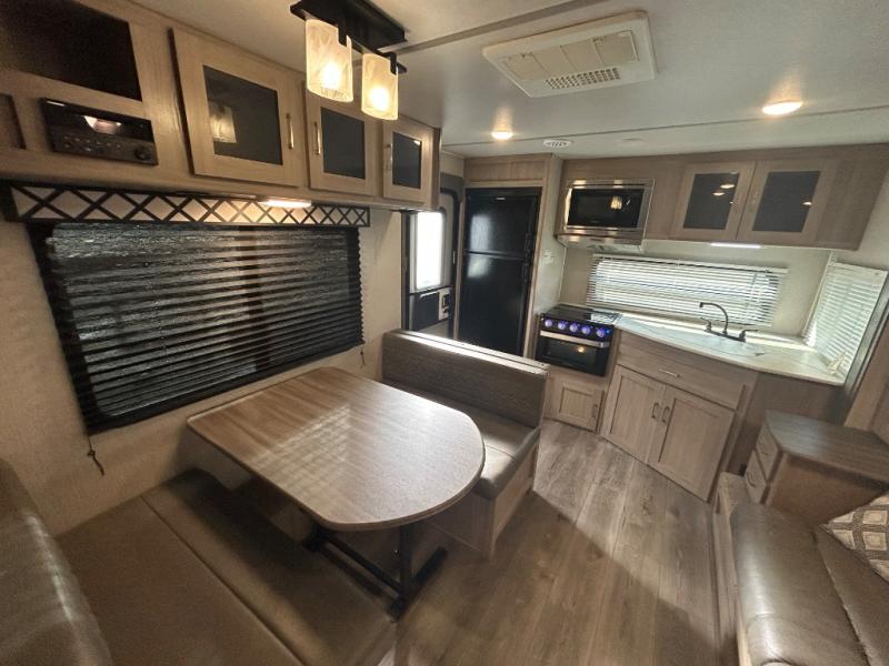 If you're looking for an RV to fit your family of five, this Freedom Express Ultra Lite travel trailer with a large slide out will be perfect for you. Within the slide out you'll find a sofa that can also be converted into additional sleeping space. There is a wardrobe with bench so that you can store your shoes and jackets and have a place to sit down in order to put on those hiking boots! The dinette includes a removable resin outdoor table, and the rear kitchen has all the amenities you need to prepare a home-cooked meal. This unit features a front bedroom with a queen bed and privacy curtains so that you can enjoy your own space.