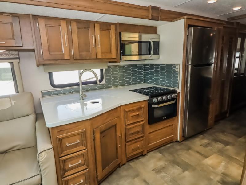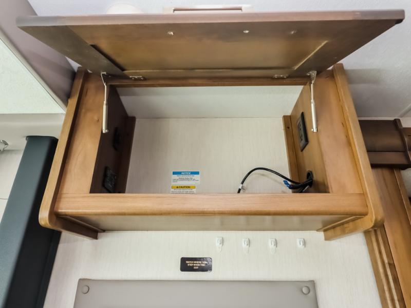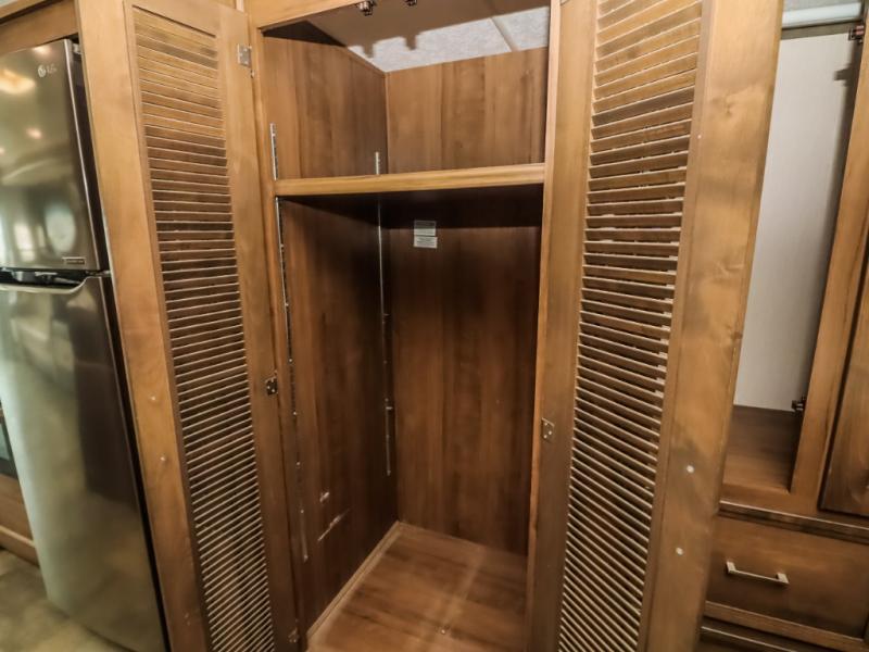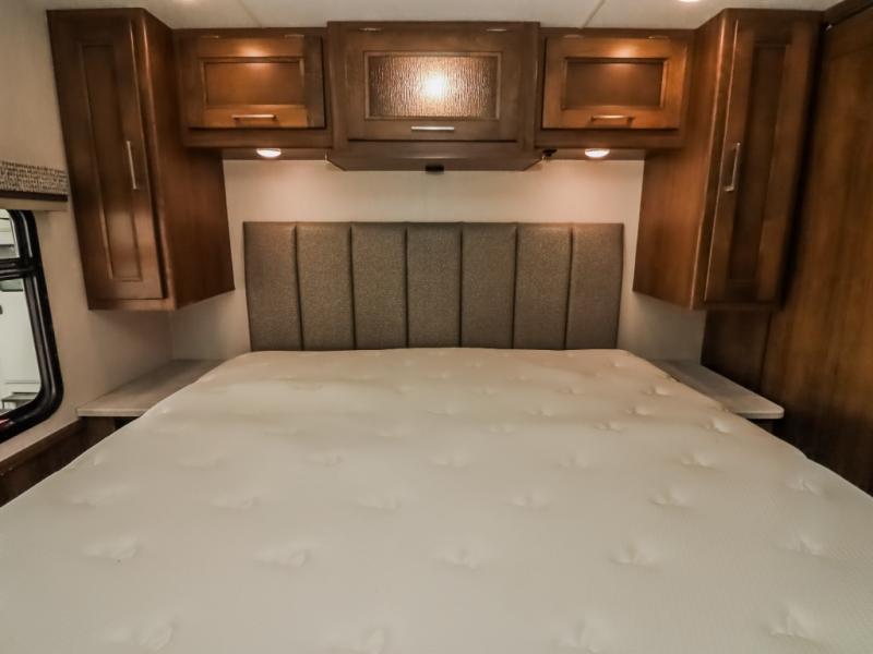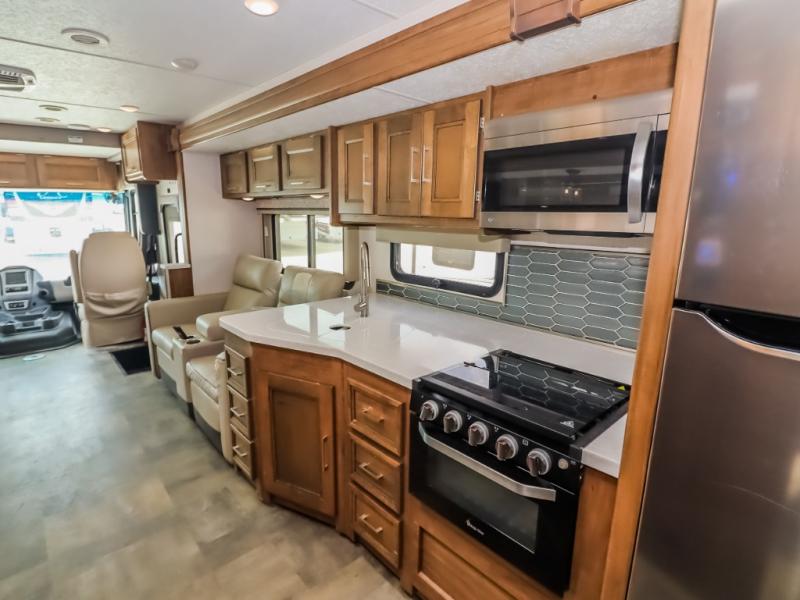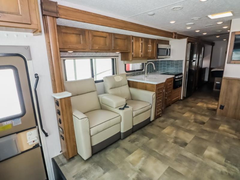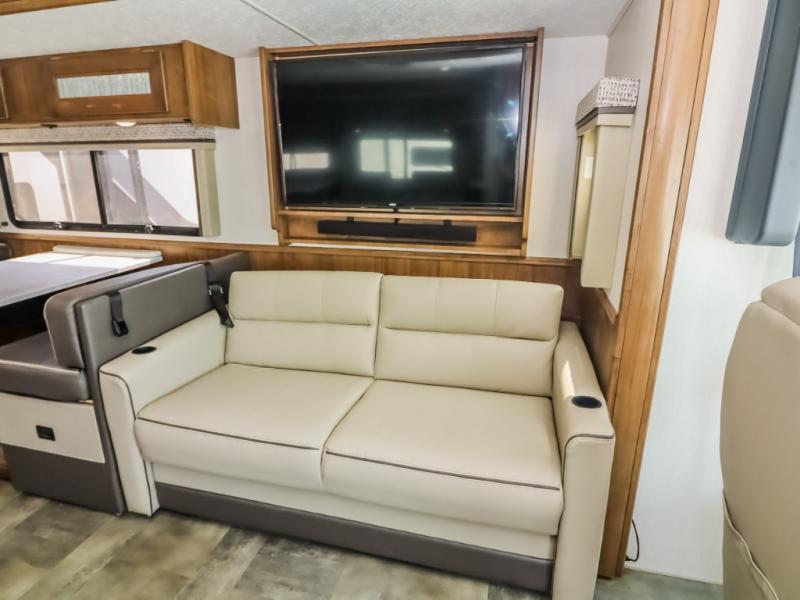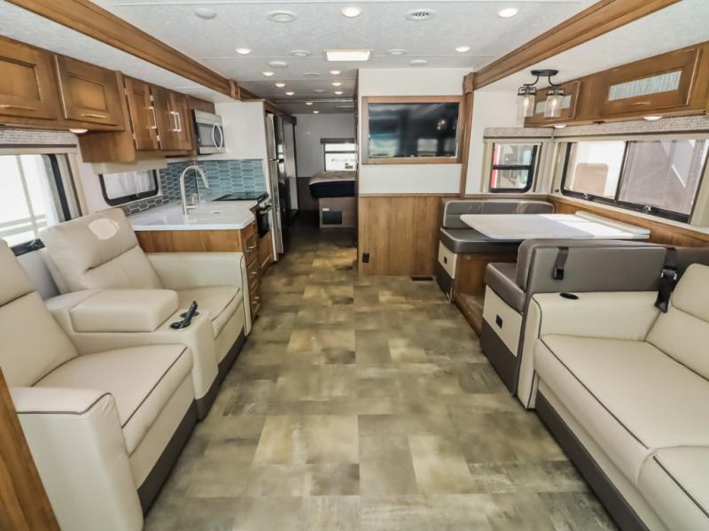 With a full-wall slide out in this 35OS motorhome, you will enjoy plenty of walking around room! There is also a booth dinette and 68" sofa bed slide out with a 50" TV for even more room, and across from it is the 68" theater seating for more comfortable seating. The drop down overhead bunk is the perfect place for a couple of kiddos or one adult to sleep. The rear private bedroom welcomes you to a peaceful night's sleep on the king-size bed with a CPAP station above it, and just outside the bedroom is a pantry area that is prepped for you to add the optional washer and dryer so that you can extend your vacation even longer with clean clothes!
