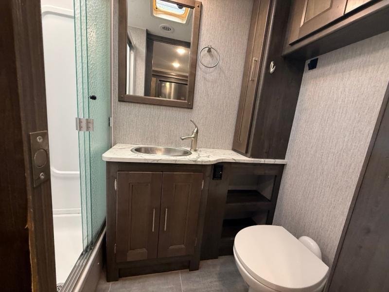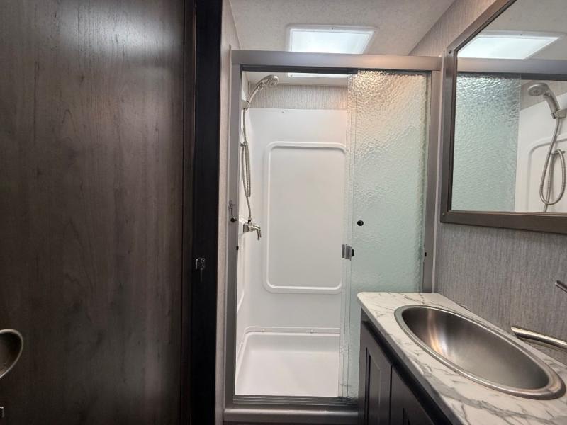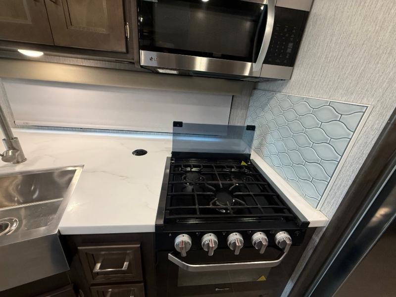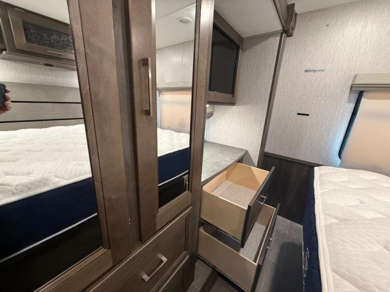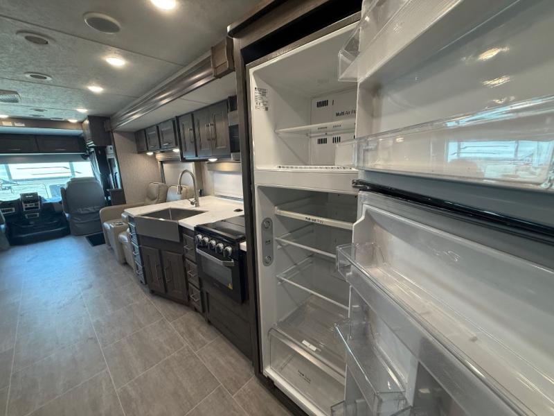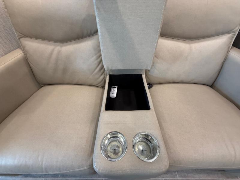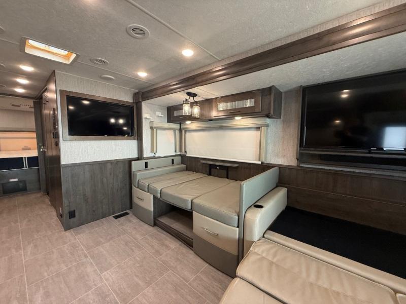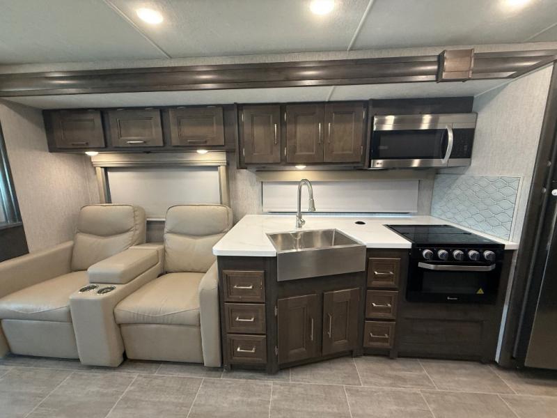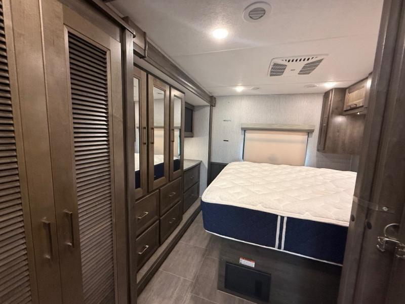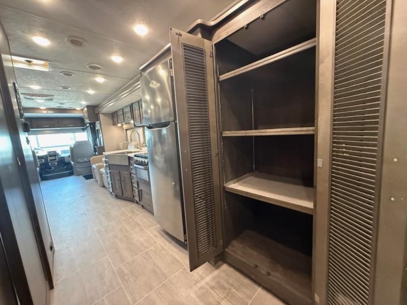 With a full-wall slide out in this 35OS motorhome, you will enjoy plenty of walking around room! There is also a booth dinette and 68" sofa bed slide out with a 50" TV for even more room, and across from it is the 68" theater seating for more comfortable seating. The drop down overhead bunk is the perfect place for a couple of kiddos or one adult to sleep. The rear private bedroom welcomes you to a peaceful night's sleep on the king-size bed with a CPAP station above it, and just outside the bedroom is a pantry area that is prepped for you to add the optional washer and dryer so that you can extend your vacation even longer with clean clothes!
