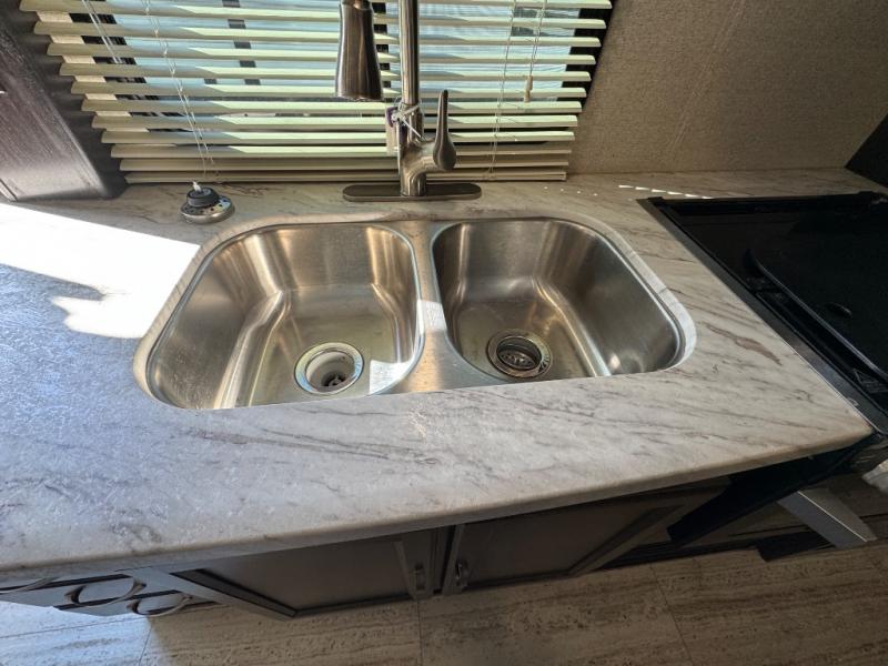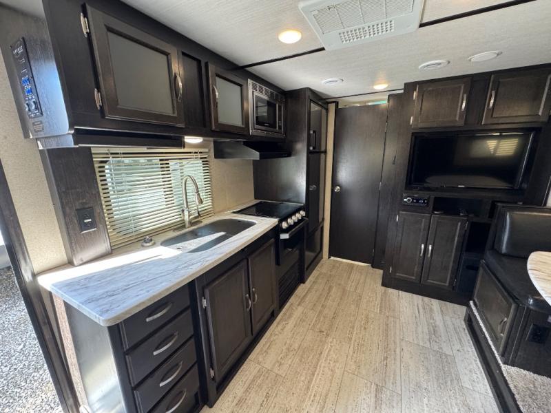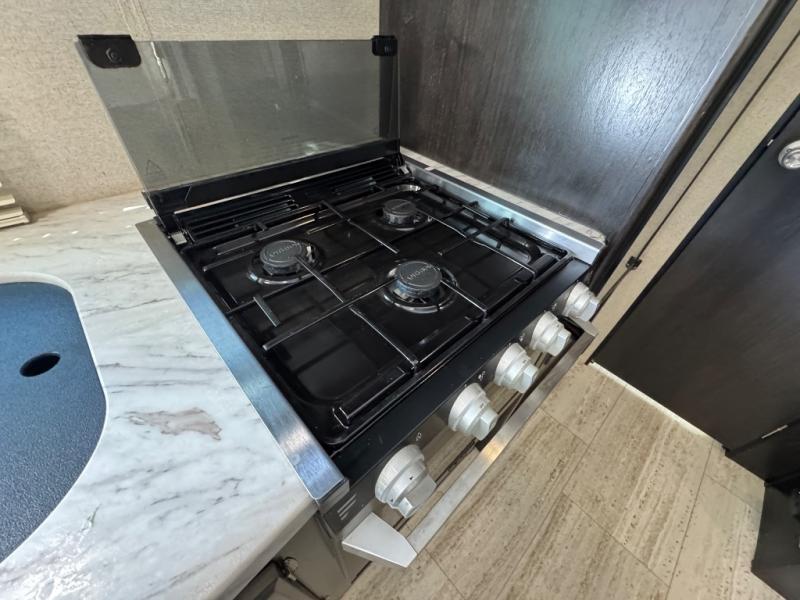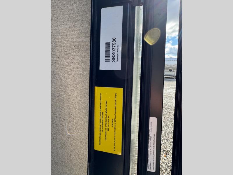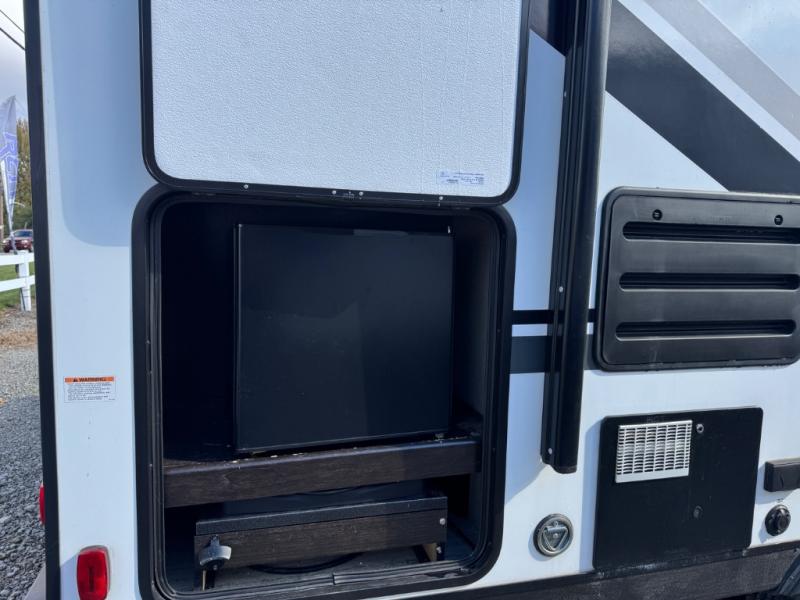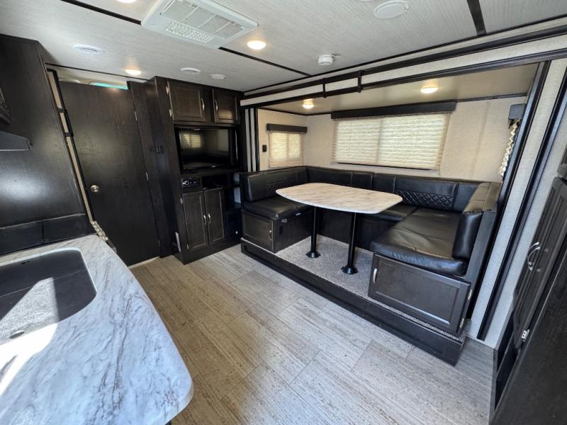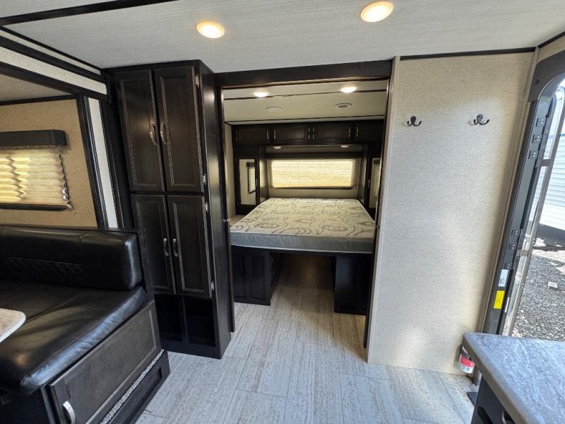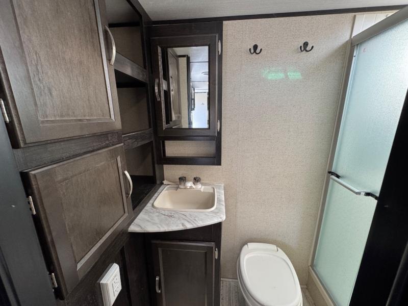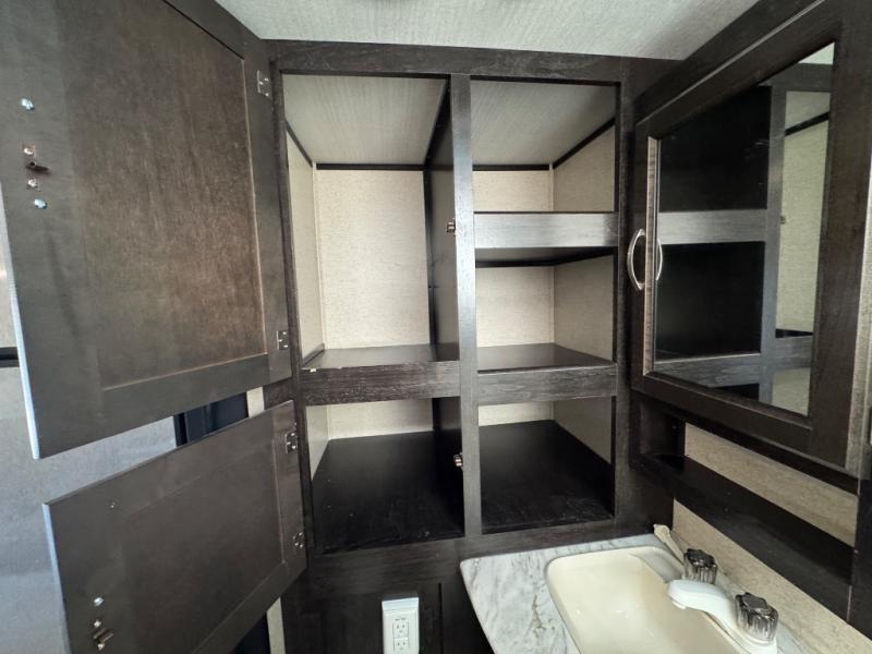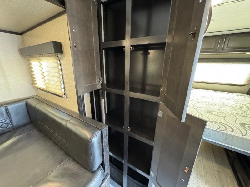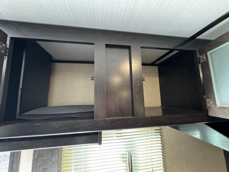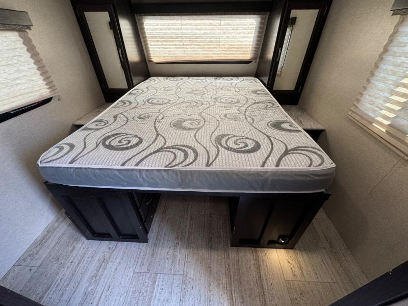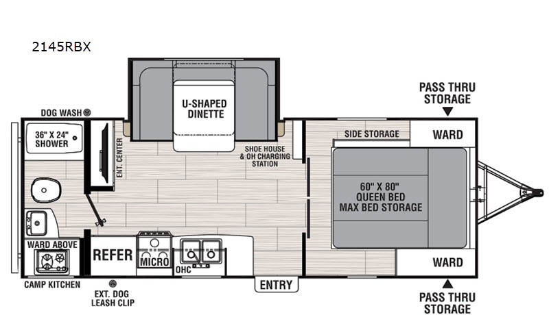 This travel trailer is the perfect unit for a family of four. Mom and dad will appreciate their own private bedroom and the queen-sized bed with max bed storage can hold extra blankets or the luggage. Each morning, the kids can enjoy their breakfast around the U-shaped dinette and watch their morning cartoons on the LED TV. This area at night can also be converted into convenient sleeping space. This model features plenty of storage space, including a shoe house to store all the shoes, an exterior pass-through storage for larger camp gear, and dual wardrobes in the bedroom.