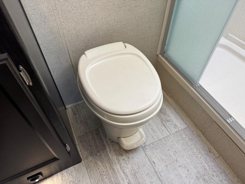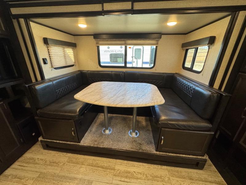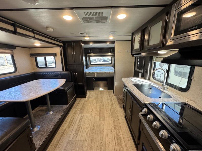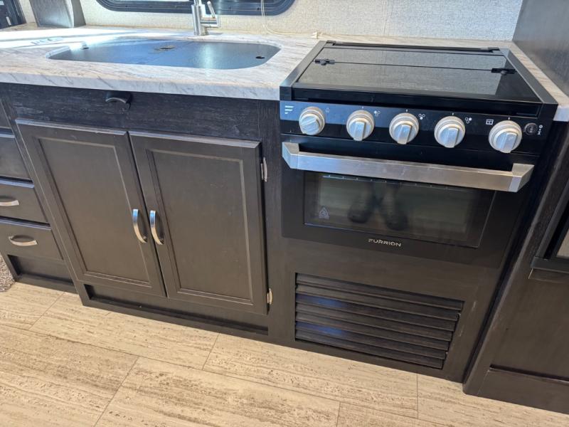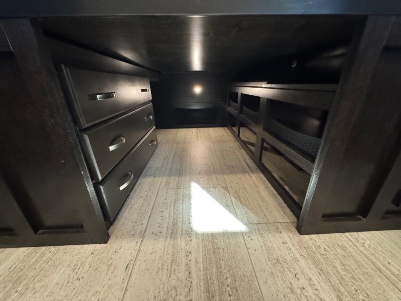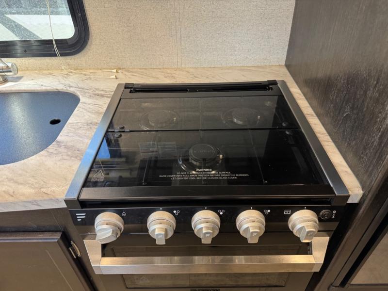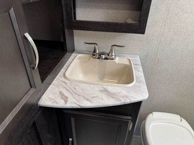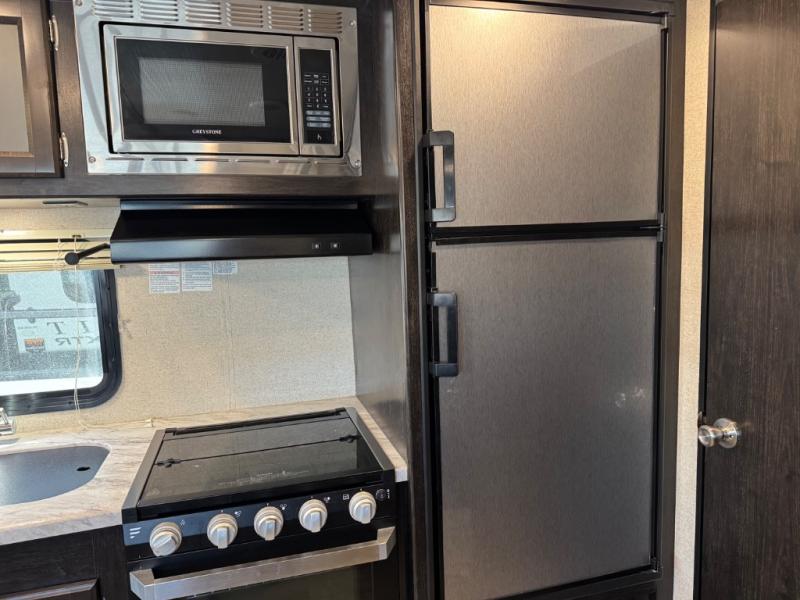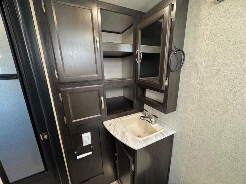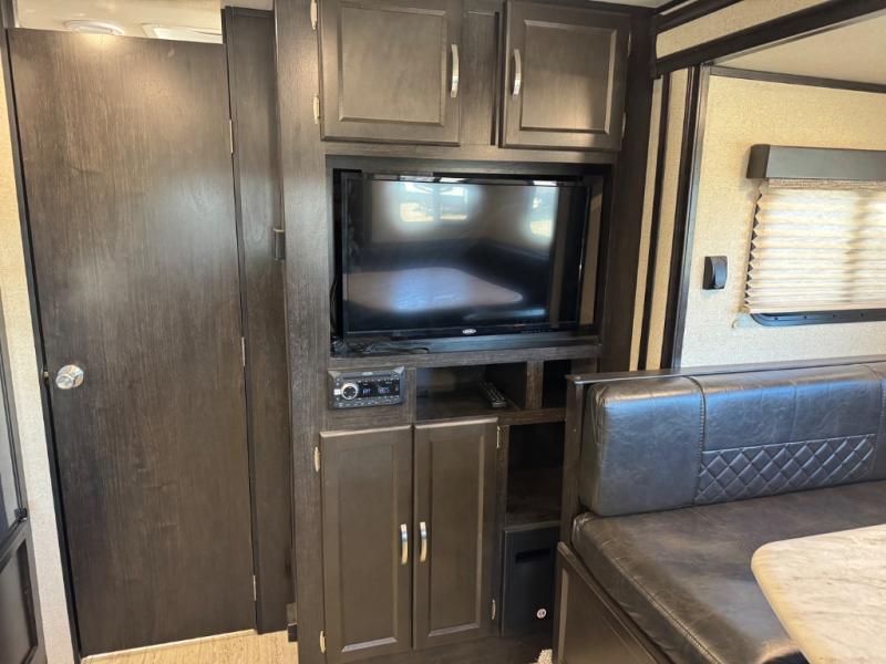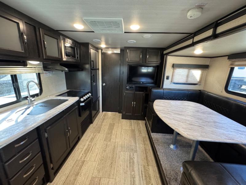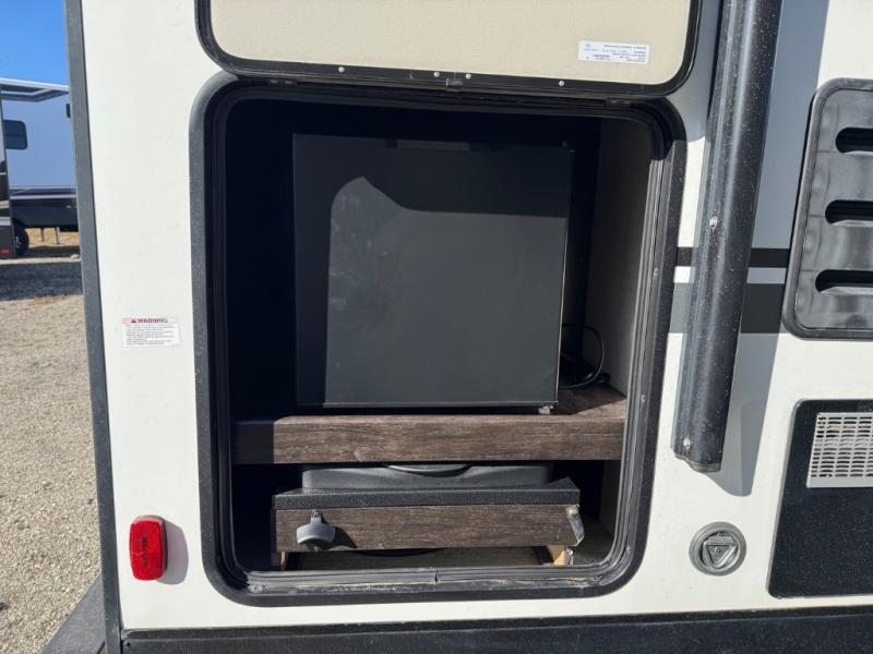 This travel trailer is the perfect unit for a family of four. Mom and dad will appreciate their own private bedroom and the queen-sized bed with max bed storage can hold extra blankets or the luggage. Each morning, the kids can enjoy their breakfast around the U-shaped dinette and watch their morning cartoons on the LED TV. This area at night can also be converted into convenient sleeping space. This model features plenty of storage space, including a shoe house to store all the shoes, an exterior pass-through storage for larger camp gear, and dual wardrobes in the bedroom.