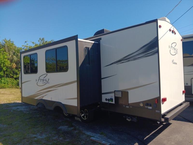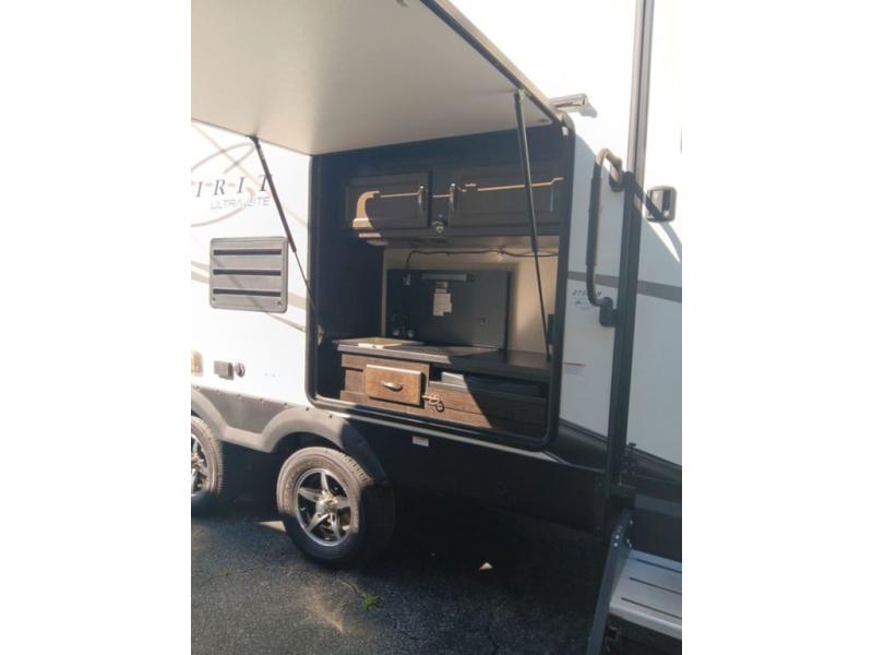 Don't just experience nature: experience nature at its fullest with this Spirit Ultra Lite travel trailer! All of your needs will be met with the features that have been included in this model, like the two kitchens, one indoor and one outdoor, and the large rear bathroom that will aid in your privacy as you get ready for the day. You will also be able to come back and relax effortlessly on the U-shaped dinette, the sofa, and the queen-size bed after a long day of tiresome adventures. Be sure to place your sandals in the shoe storage, kick up your feet, and watch a show on the LED TV in the living area as you close out the night.