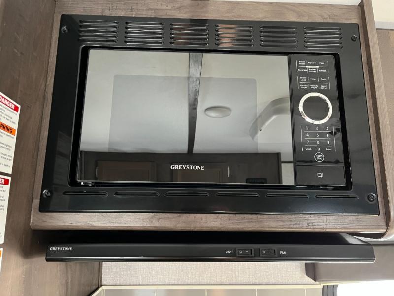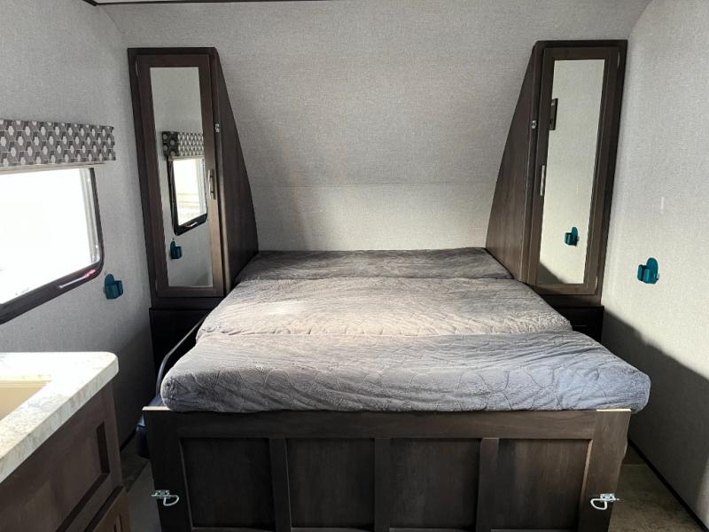 The kitchen in the 2125BH is both practical and user-friendly, featuring a stove, oven, microwave, refrigerator, and generous cabinet space. From simple breakfasts to full campsite dinners, this setup makes meal prep easy and enjoyable. Plenty of counter space and storage keep everything organized and within reach.