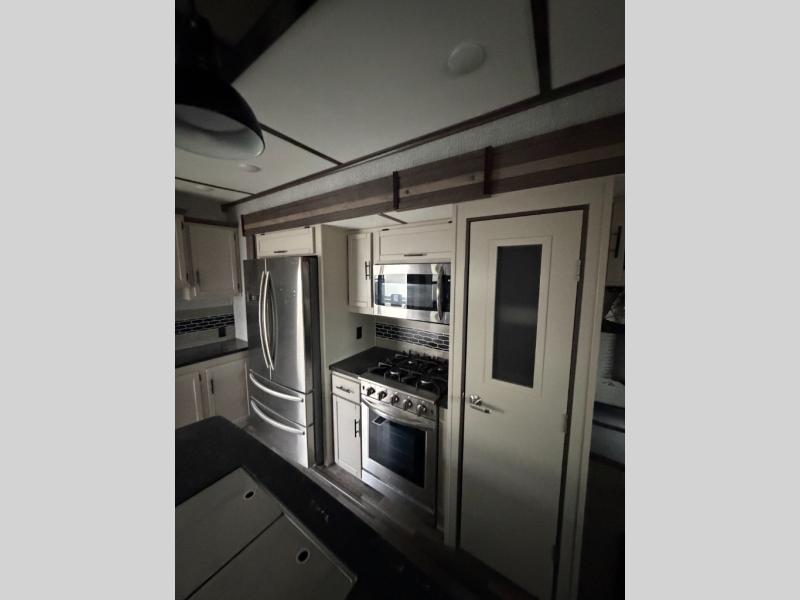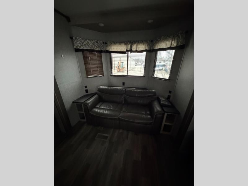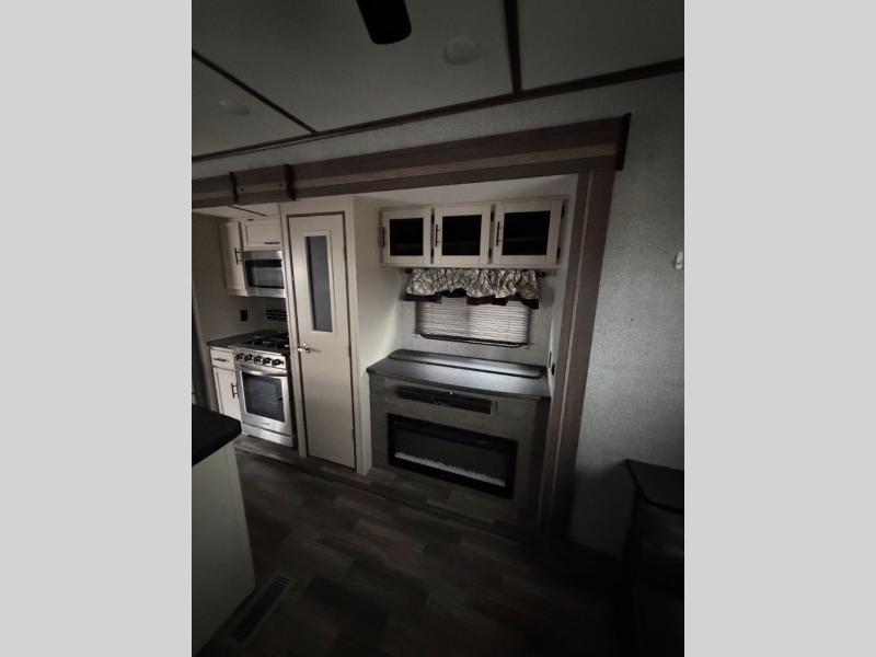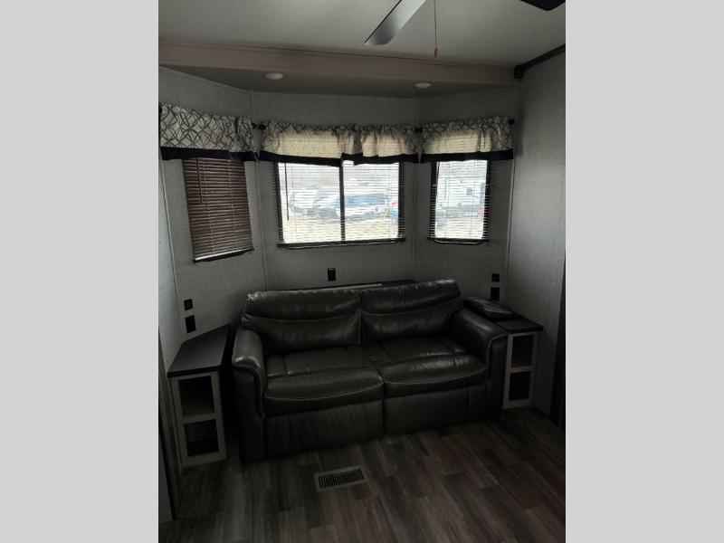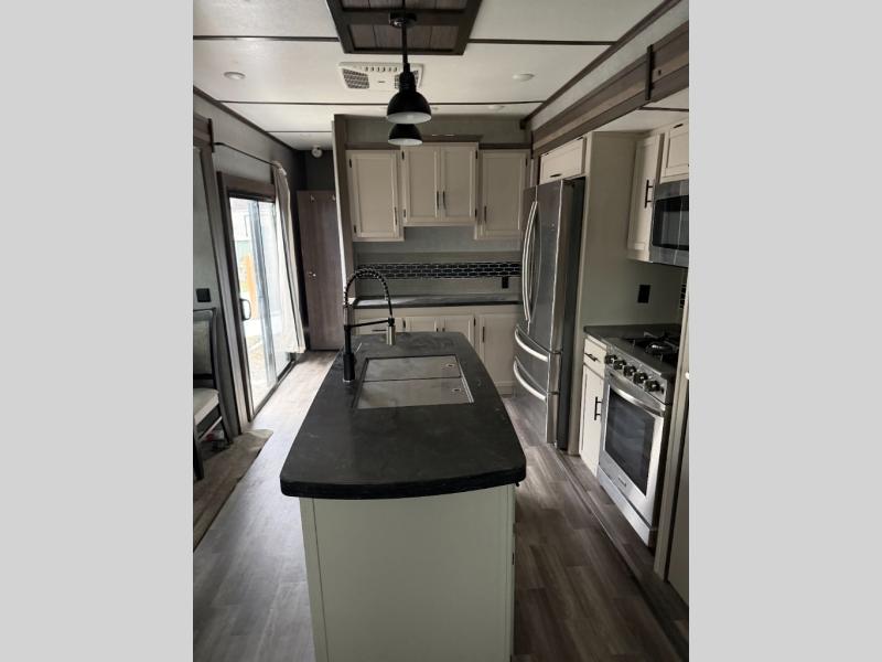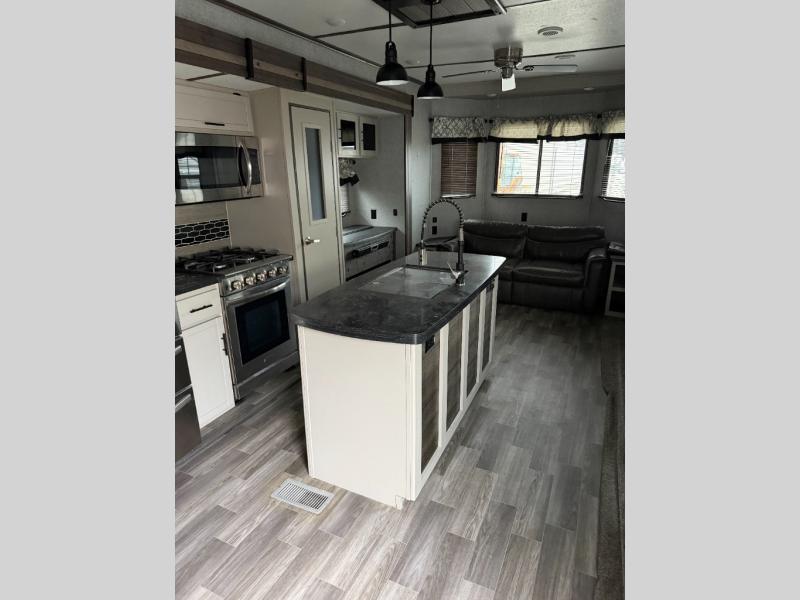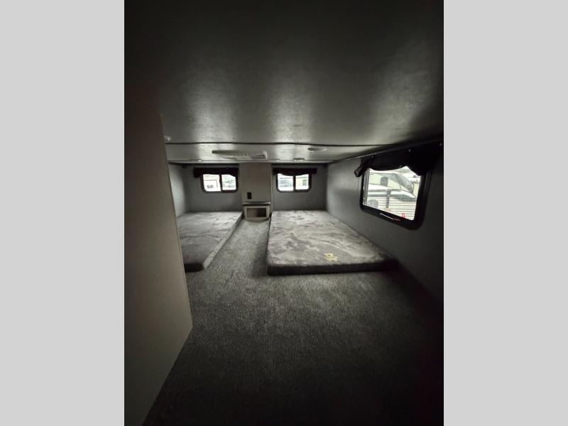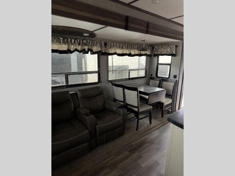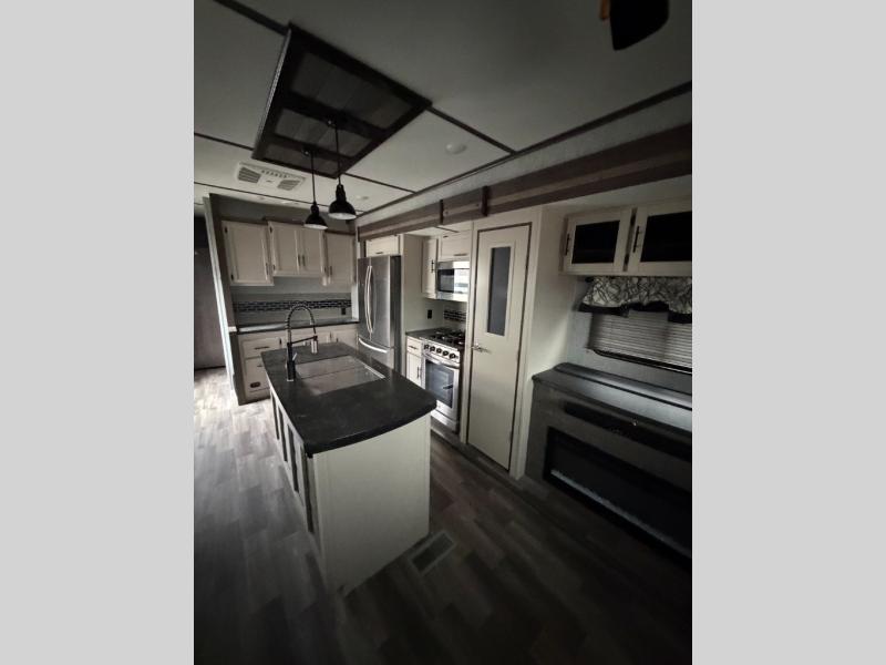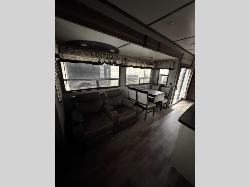 Your whole family will enjoy this getaway retreat every time you stay. The kids will surely claim the loft area with two bunk mats as their own space, and you can enjoy the rear private bedroom with a king-size bed and second entry into the trailer. The dual opposing slides in the combined living and kitchen area will provide more floor space for the cook to prepare and serve meals, for everyone to gather together around the kitchen island to visit, and to watch the LED HDTV. You will also find plenty of seating for everyone on the theater seats, the front sofa, and the free-standing table with four chairs.