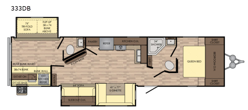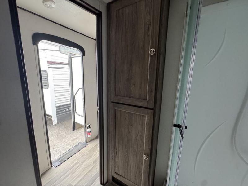 Your RV search is over! Just imagine having your own private bedroom with dual access to the full bathroom while your kids have their own privacy in the rear bunkhouse which includes a handy half bath and a tri-fold sofa. Each morning you might like to relax on the 64" sofa or U-shaped dinette slide before heading outside to enjoy the views from under the electric awning. Once you are ready for breakfast, the full kitchen offers everything you will need, plus you can make your meals outside if you like.