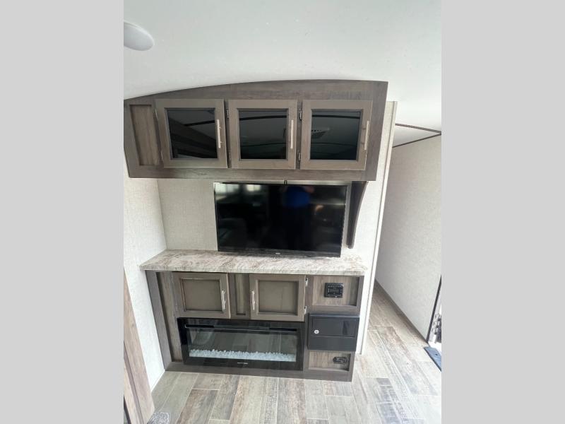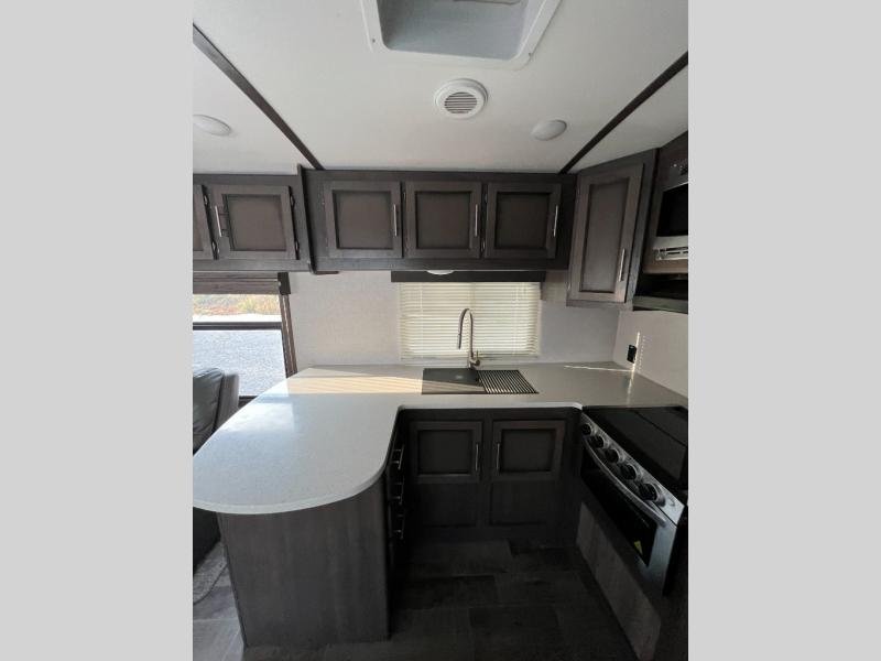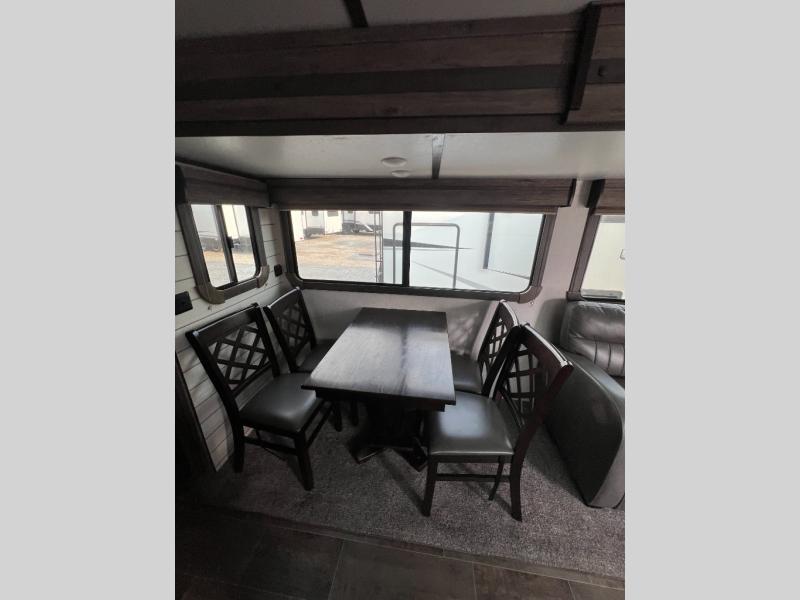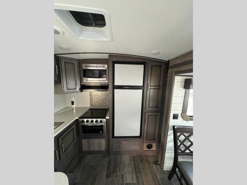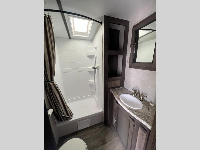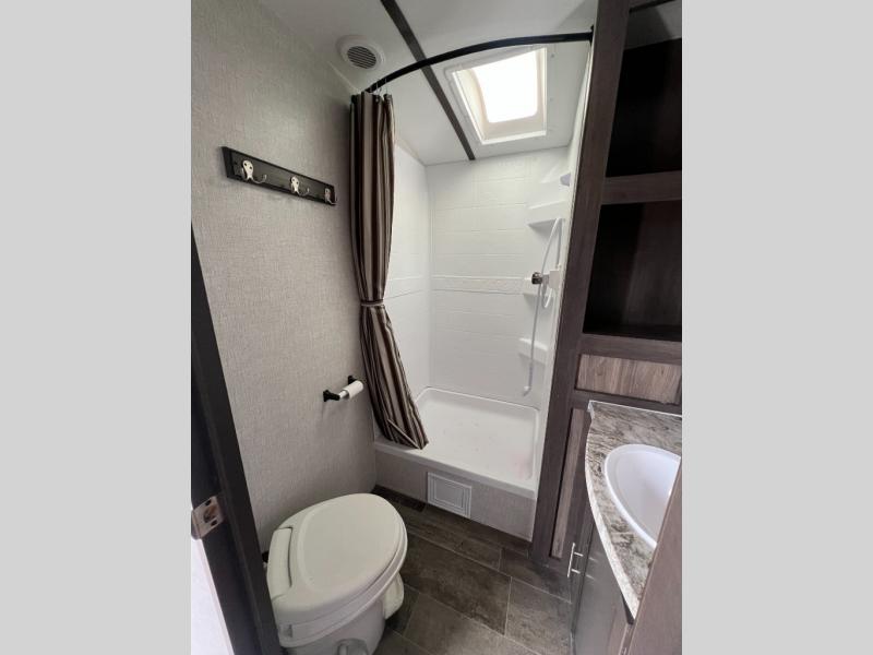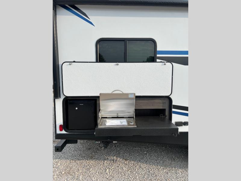 Eat, sleep, relax, and play all in this travel trailer features a large slide out for added interior space. There is plenty of seating choices, including dual lounge chairs, a tri-fold sofa or choose the optional theater seating, and an XL booth dinette. After you've worked up your appetite on a long bike ride, get cleaned up in the 30" x 36" shower then head outdoors to cook dinner on the outside camp kitchen. This model also includes a power awning with LED lights and outside speakers. So grab your camp chair and a cold drink from the outdoor refrigerator and enjoy some great company!