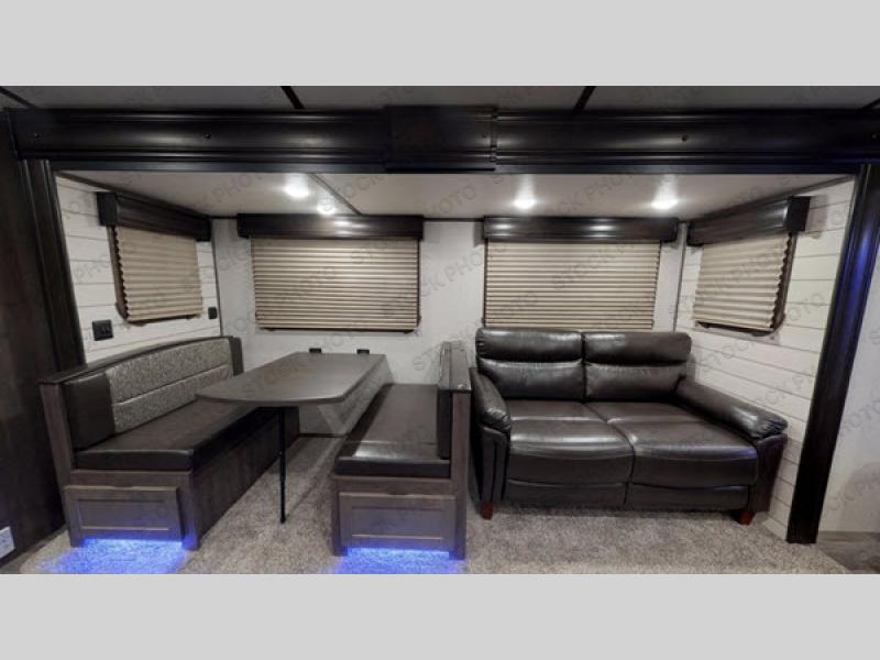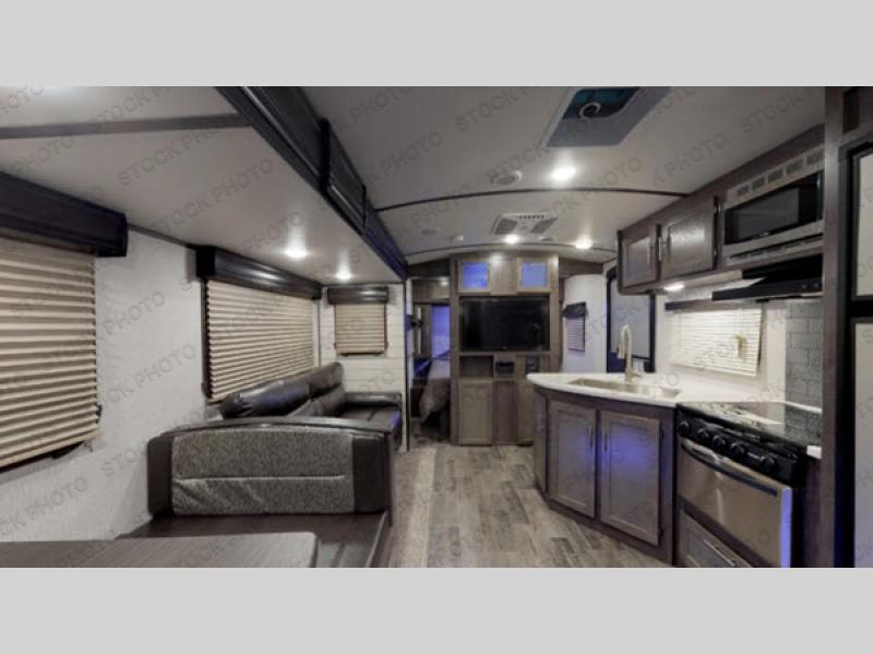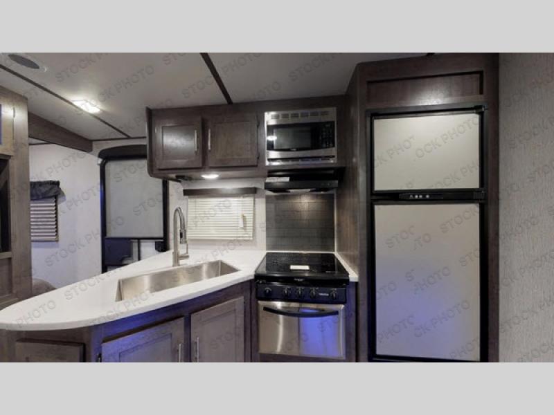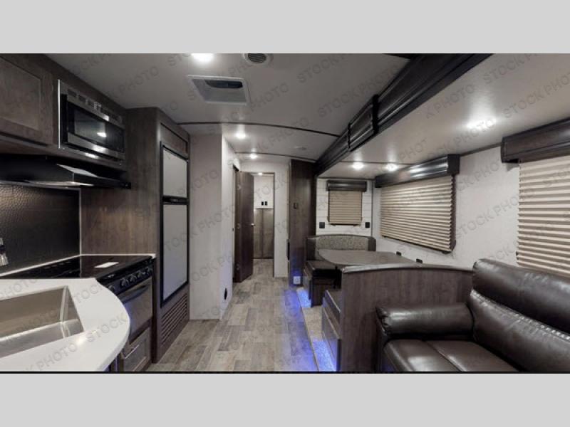 It'll feel just like home in this travel trailer with a private bedroom up front for you and a private bunkhouse for the kids! The bunkhouse includes three bunks and a junior dinette that is perfect for a board game, plus there is a wardrobe for their clothes. Your crew can spend the day swimming at the lake and in the evening enjoy some time sitting under the power awning with LED lights. This model also includes an outside kitchen with an outdoor refrigerator and outside speakers so you can be the life of the party.