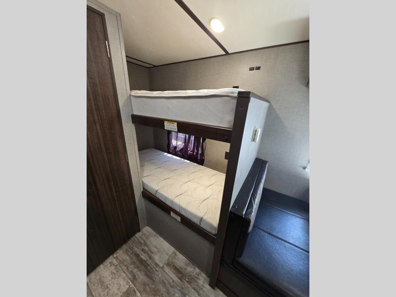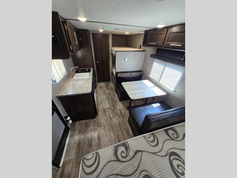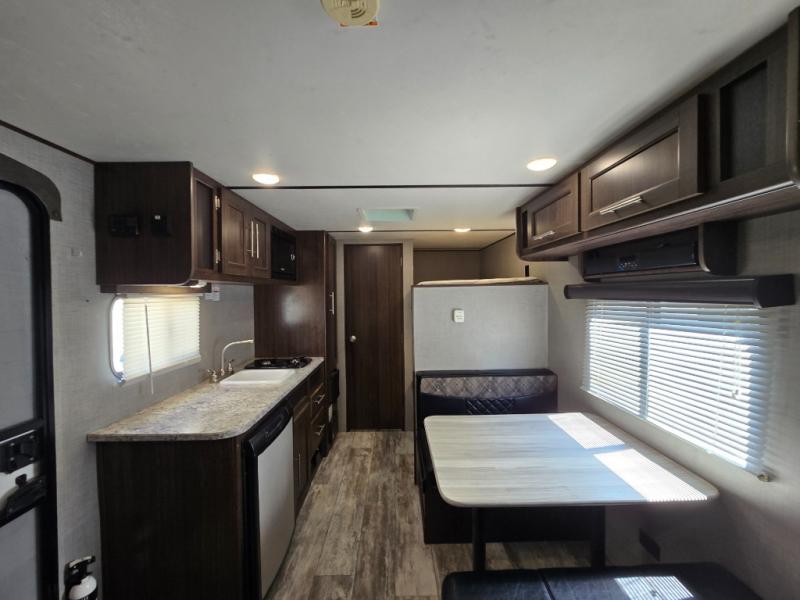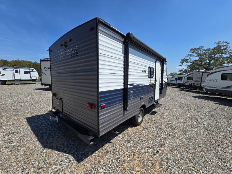 This Zinger Lite travel trailer is perfect for your next family vacation. With room for five, this unit gives you the space you need to pack up the kids and the dog and get ready to hit the road! With an RV queen bed and bunk beds, everyone will have a place to sleep. The 38" booth dinette can comfortably hold one to two little ones. Use the stainless steel oven to make a home-cooked meal and easily store your dry goods in the kitchen pantry. Enjoy extra privacy with a rear corner bath that includes a 36" tub. This unit features multiple overhead compartments, so bring along the board games and other valuables from home.