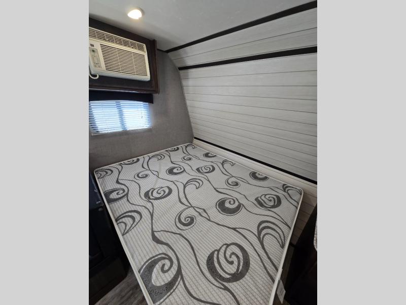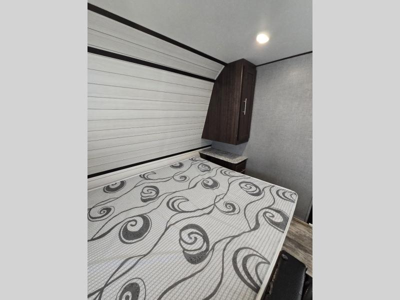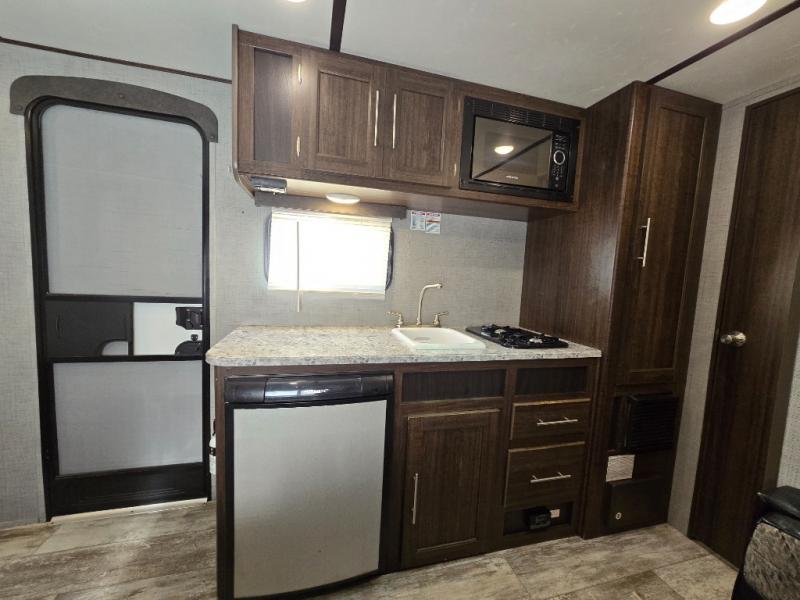 In each Zinger Lite travel trailer, you will find generous storage compartments for all your valuables and comfortable features to make each camping trip enjoyable. You'll enjoy the AM/FM Stereo with Bluetooth and the LED lighting and designer valances will make you feel right at home. The chef of the family will love the Zinger Lite kitchen with its Maple cabinet drawers, stainless steel sink and high rise faucet. Each model includes a mirrored medicine cabinet to store all your necessities, and the bedspread in the bedroom will provide a comfortable night's rest!