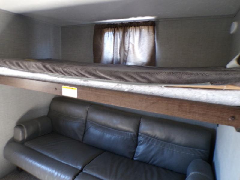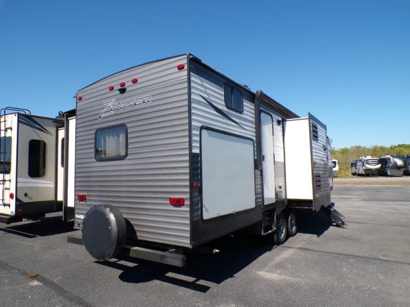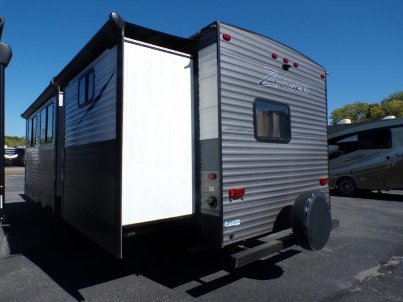 Don't wait another moment to take the family out to the campground in this accommodating and comfortable Zinger travel trailer! With its three slides, the interior has plenty of space to house a front private bedroom, a kitchen island, a full and half bathroom, and a rear bunkhouse suite. Plus, this unit also comes with two entry doors so that you don't have to worry about waking other campers when you sneak out for an early morning jog.
