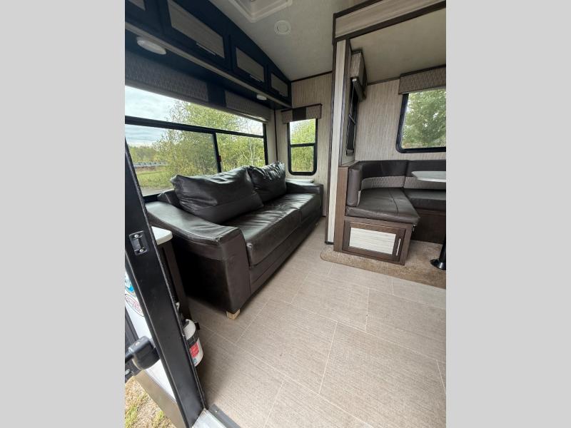 It's time to enjoy the weekend away from home without leaving your own accommodations behind. You can cook with the three burner cooktop to avoid eating fast food and you can store leftovers in the double door refrigerator. The power awning offers an outdoor living space protected from the sun and lighted for the night, and it provides a great place to visit with other RVers as they walk by. The private bedroom includes a queen bed, storage, access to the walk-through bathroom and the second exterior entry. This is quite convenient when you need to get to the restroom or would like to sneak out to see the sun rise and the kids are still sleeping on the U-shaped dinette.