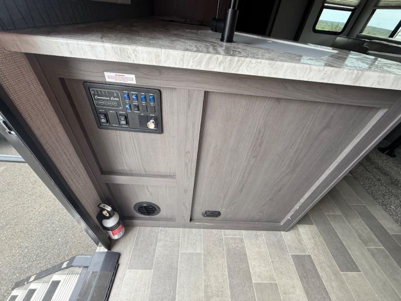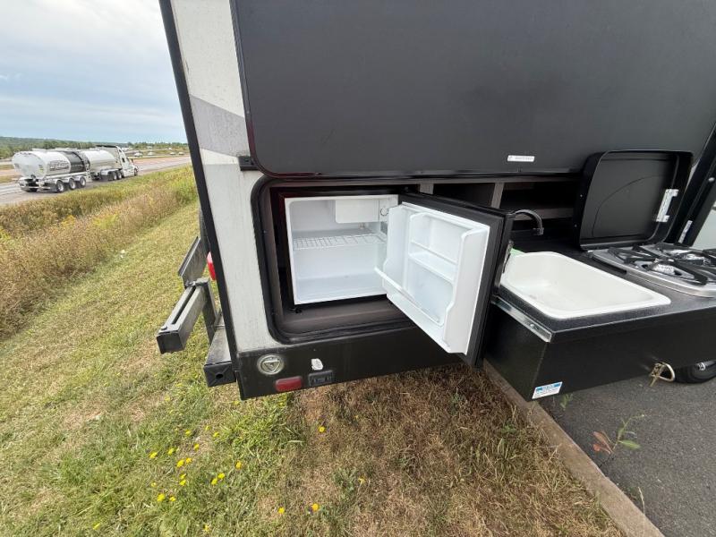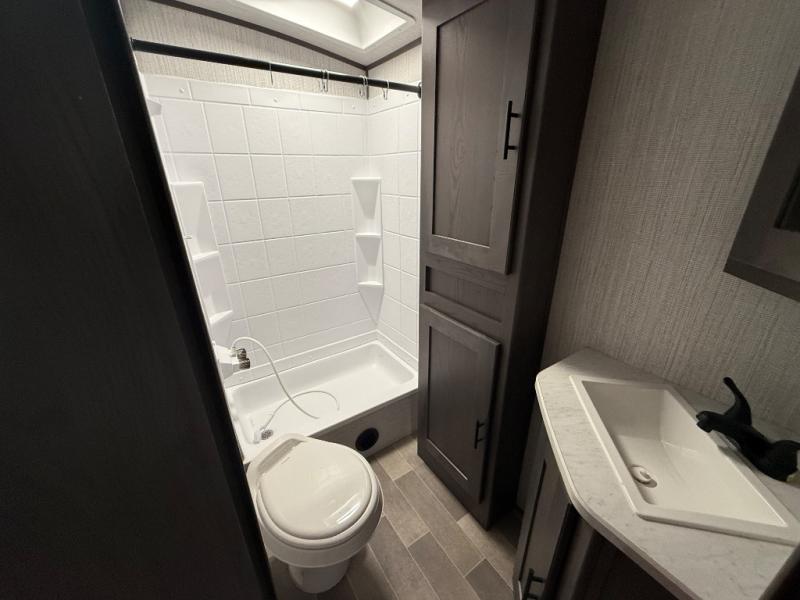 When you are daydreaming about camping with your family, stop and imagine yourself in this MPG travel trailer. Your kids will surely be sleeping on the double-size bunks with their friends while you lie on the king-size bed in the private bedroom. The kids will probably like the fact that your bedroom is on the opposite side of the trailer when they stay up late giggling. The convenience of a full bath next to the bunks allows you to pass on using the public facilities and the kiddos to be close to the bathroom at night. You can make meals on the outside kitchen while visiting with your camping friends around the campsite or inside with full kitchen appliances.
