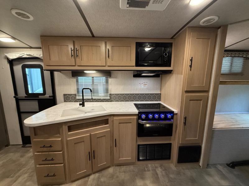 The grandkids will beg you to take them along on your next camping trip in this travel trailer that includes double bunk beds! The rear corner bath is right next to the bunks, making it easy for the little ones at night to use the restroom. After a day in the sun, come relax around the U-shaped dinette as the chef of the family whips up some dinner on the three burner range. The front private bedroom features a king bed that you are sure to appreciate. This unit also includes an outside kitchen, so clean off the catch of the day and get ready for a fish fry!