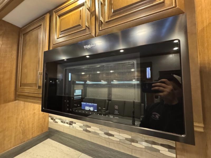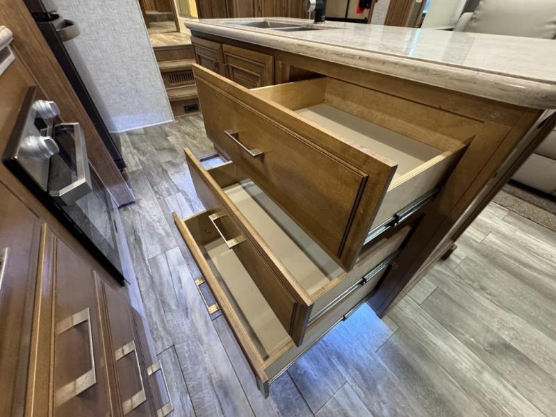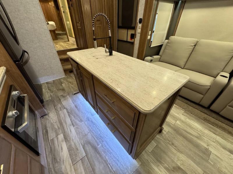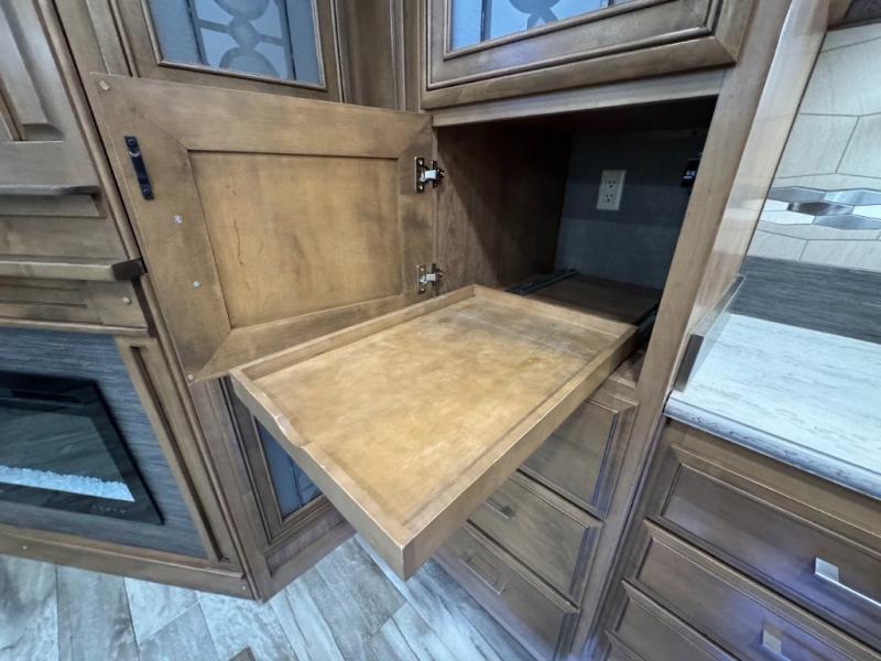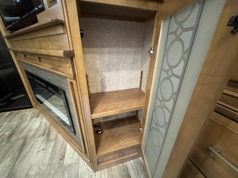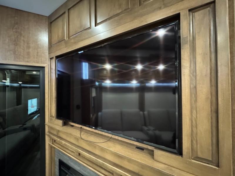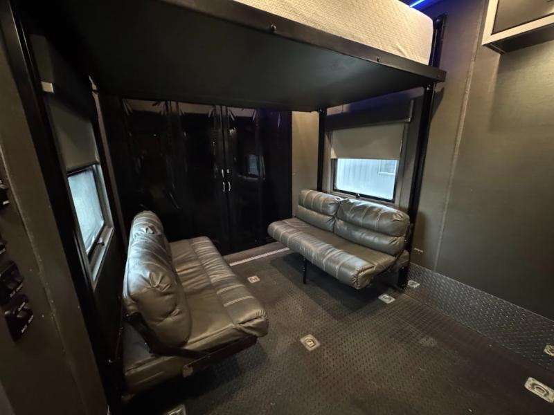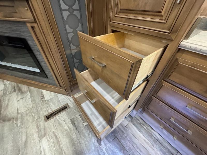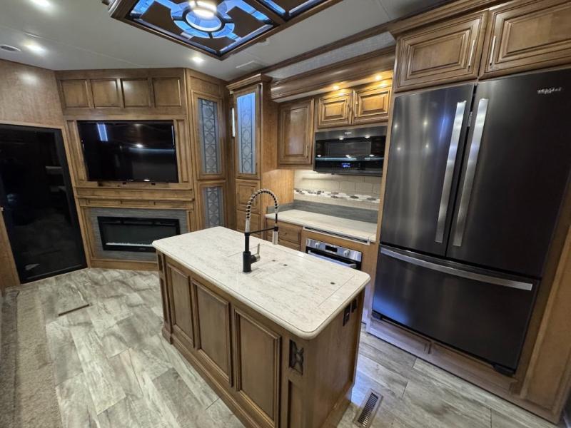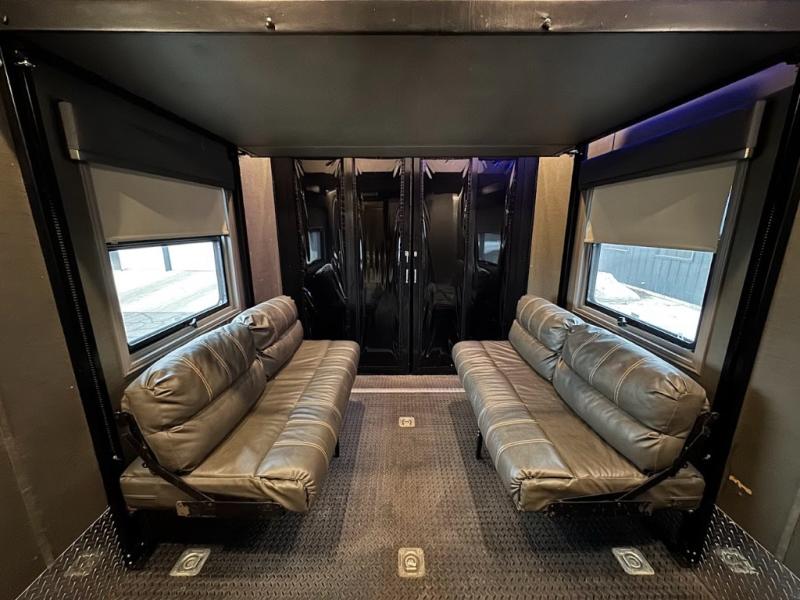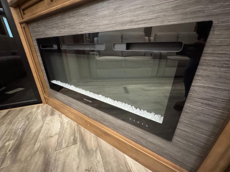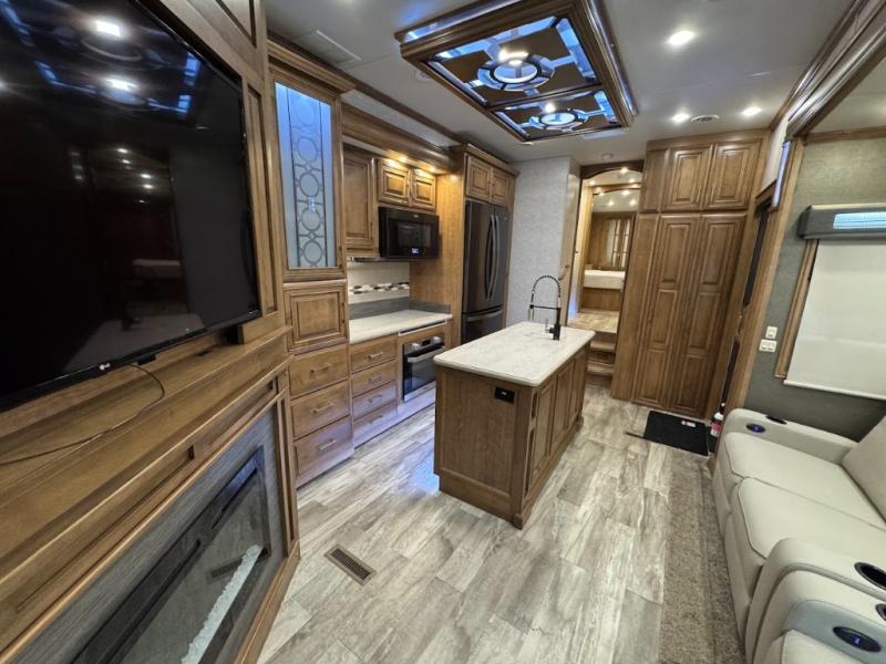 No need to return home right away when you have this DRV Luxury Suites FullHouse toy hauler fifth wheel. This model features four slides which give you plenty of space throughout for all of your belongings, and there is a 12' separate garage for a few dirt bikes or an ATV! Not many models feature a bath and a half, but when you choose to camp with this model, you will now have the convenience of choosing which bathroom to use! Meal prep is even easier with the kitchen island, and after dinner, you can relax on the theater seating while watching TV and enjoying a fire in the fireplace!