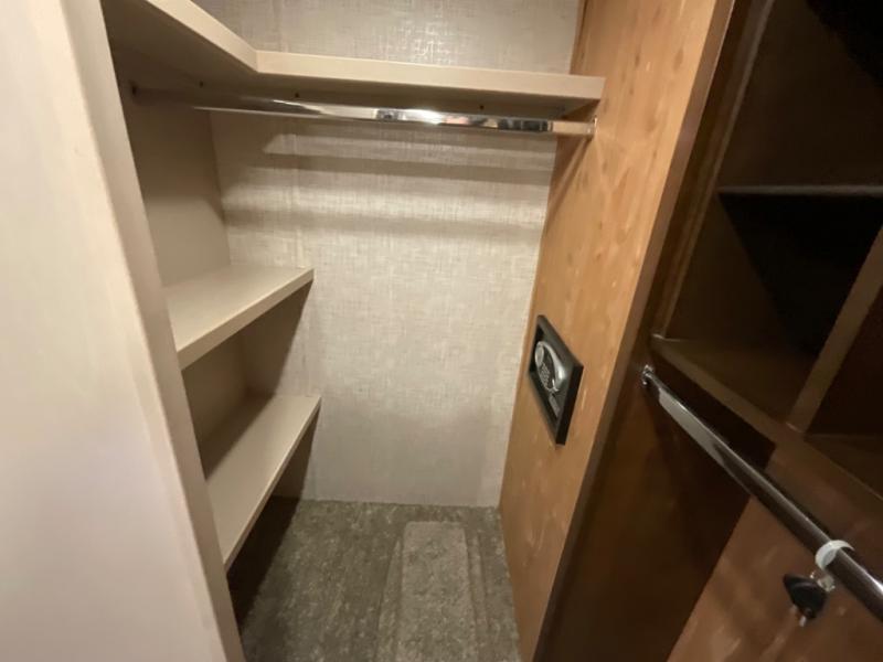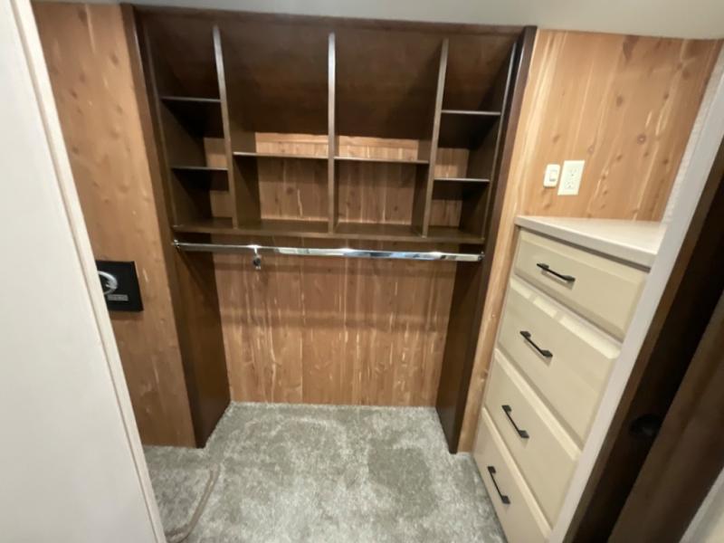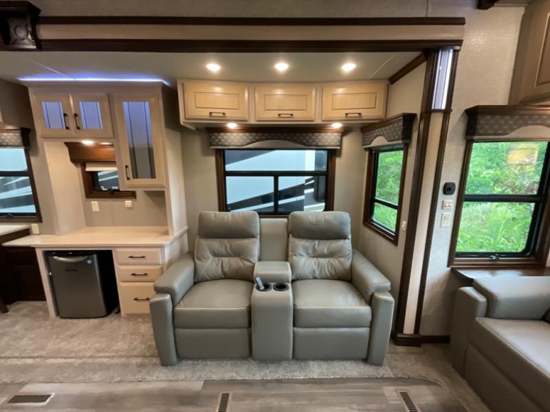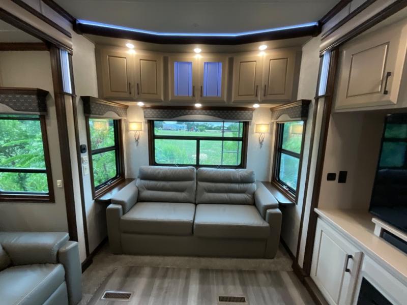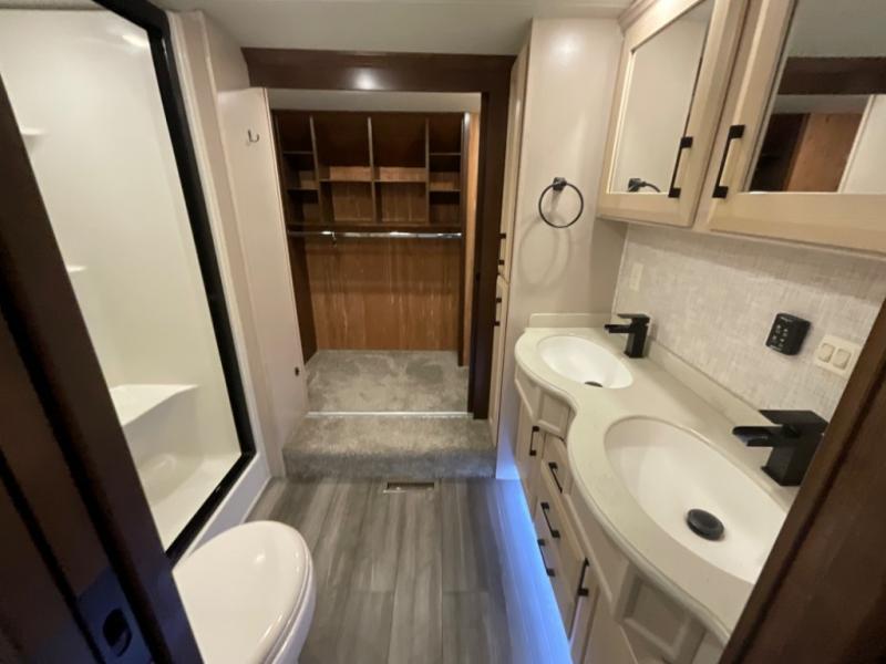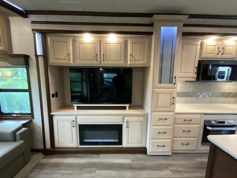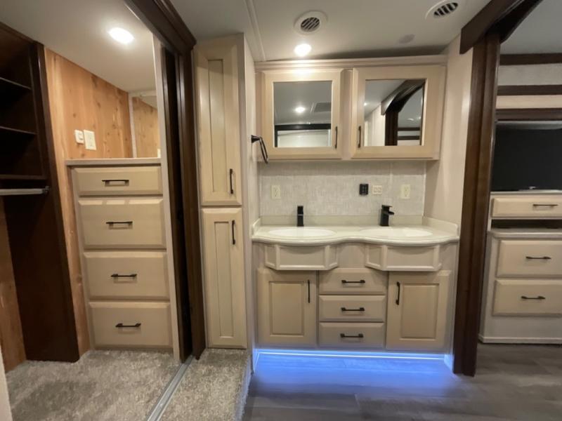 It's time for you to take your camping experience to the next level with this Mobile Suites luxury fifth wheel. You won't be able to ignore the quality and class that this unit portrays as you spend your mornings getting ready in your private master suite. From the double-sink vanity and king-size bed to the walk-in closet and 32" LED TV, this bedroom has everything you need to keep yourself relaxed and rejuvenated for days. When you do venture out into the main living area, you will be pleasantly surprised to find a spacious atmosphere because of the opposing slides.