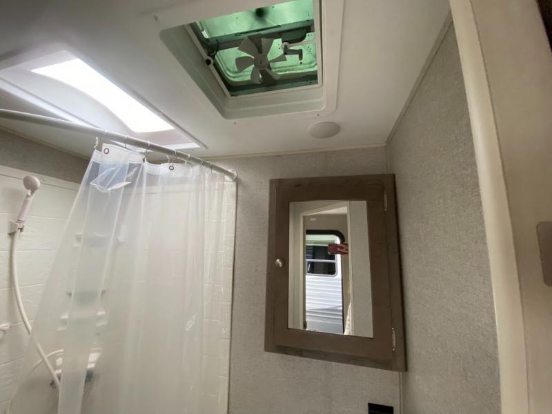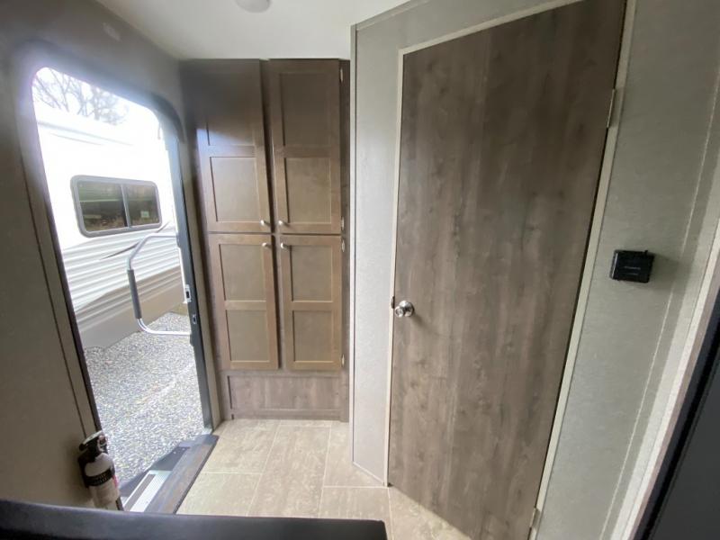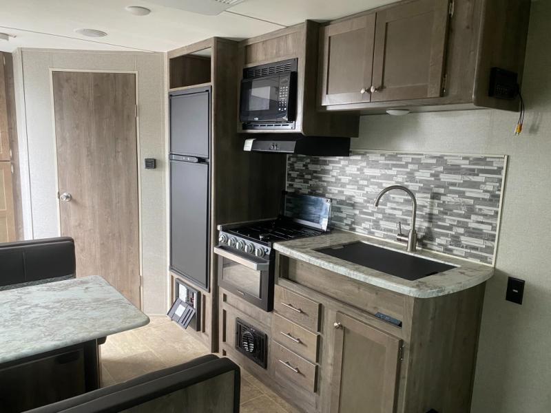 This Aspen Trail travel trailer is the perfect couple's getaway! With a queen-size bed up front that has wardrobes on either side and overhead cabinets above and a rear corner bathroom, you can start each day clean and relaxed. Plus, the bathroom even features a skylight above the neo-angled shower for added natural lighting. Just outside the bathroom is a closet for you to use how you please, and across from it is the booth dinette where you can enjoy your meals, play a card game, or even transform into an extra sleeping space if needed!