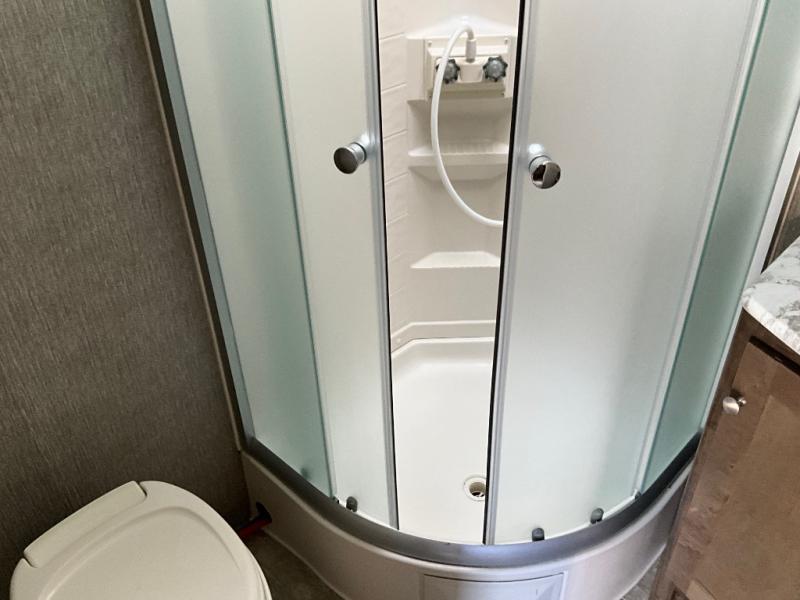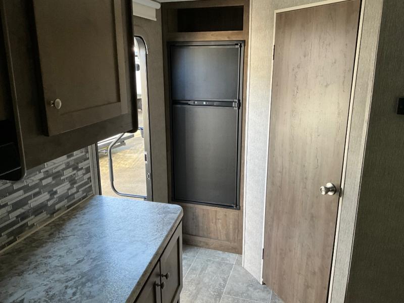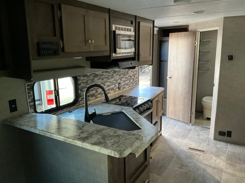 This Aspen Trail travel trailer with a rear corner bathroom is ready to go whenever you are! Inside the bathroom there is even a skylight above the radius shower for you to enjoy natural lighting as you get ready. Just outside the bathroom and next to the main entry door is the 7 cu. ft. refrigerator for you to grab your favorite beverage before heading outside. Up front, you will enjoy sleeping on the queen-size bed, and if you can't fall asleep, just head back out to the kitchen and heat up a snack in the stainless steel microwave!