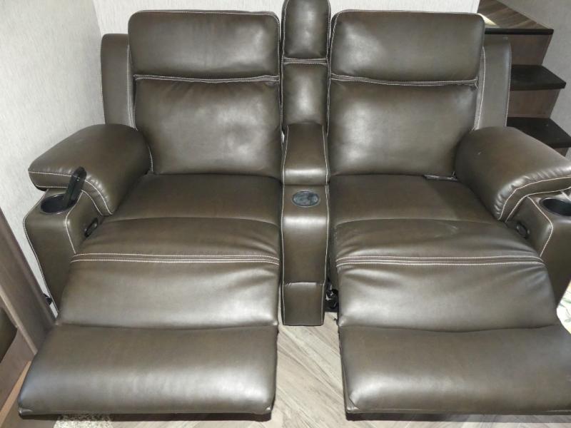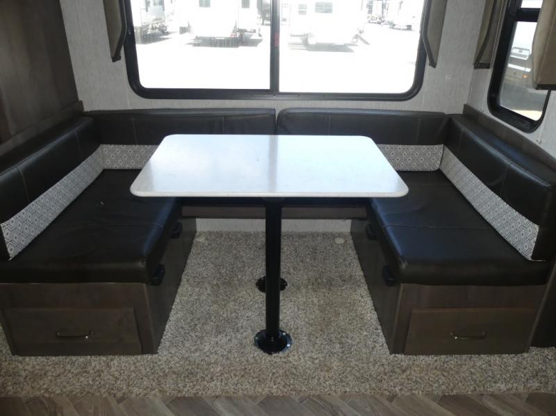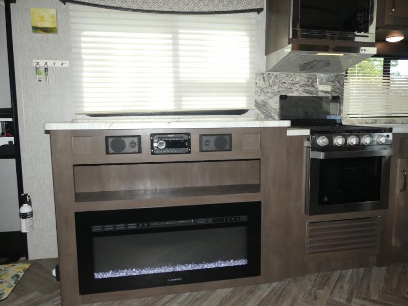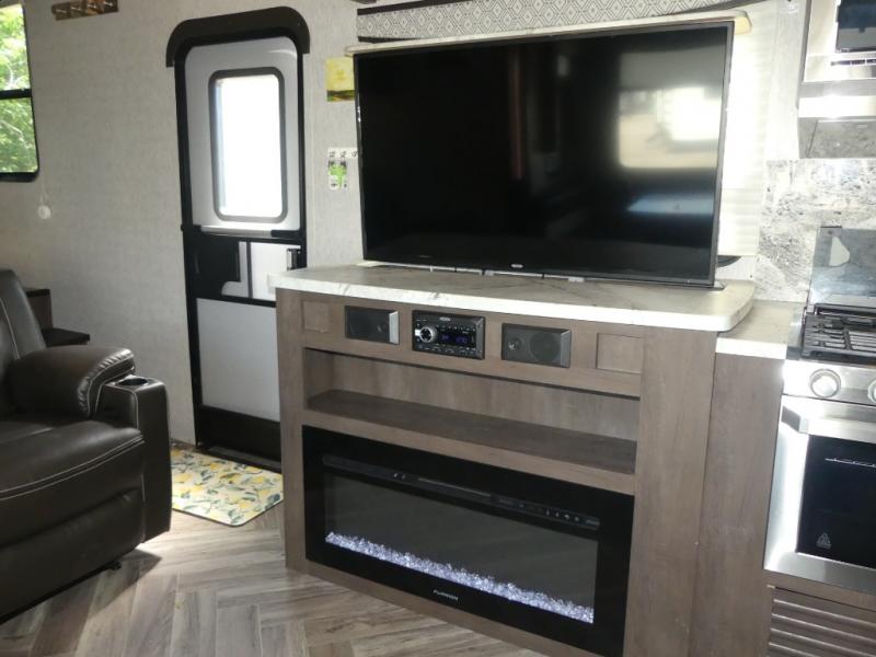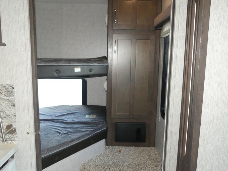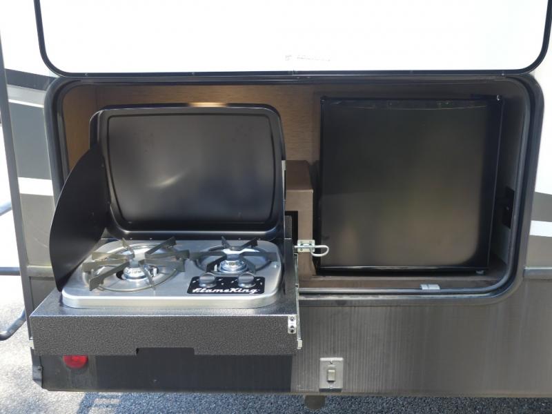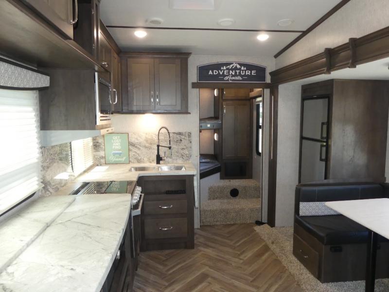 This Astoria fifth wheel is packed with comfortable at-home features your family is sure to love each time you camp. The slide out provides more interior space and also holds a U-shaped dinette that is great for a game of cards in the evening. After you've traveled all day to your destination, relax on the theater seating before heading out to find a trail or two. This unit includes a three-burner cooktop and a microwave to prepare all your meals, and the chef of the family will love the outdoor kitchen for some fresh air. The front private bedroom features a bed, dual nightstands, and a wardrobe slide that mom and dad are sure to love, and the kids will crash on the double-size bunks after a day of playing and exploring!