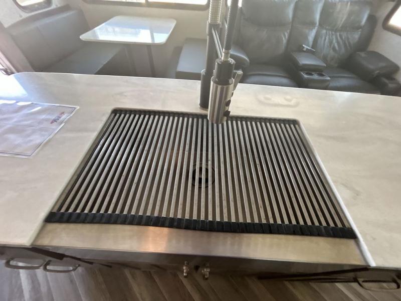 For complete comfort and luxury when you are away from home, choose this Astoria fifth wheel that features four slides for ample interior space. You can prepare breakfast each morning on the three-burner cooktop, and the kitchen island will provide extra counter space. This model features a rear living area with a tri-fold sofa, theater seating, and an HDTV with a fireplace below for those chilly evenings. When it's time to call it a night, the front private bedroom with a king bed will be a sweet oasis. The kids will call the middle private bedroom their own with its tri-fold sofa slide, a loft above, and storage space for their clothes and knickknacks.
