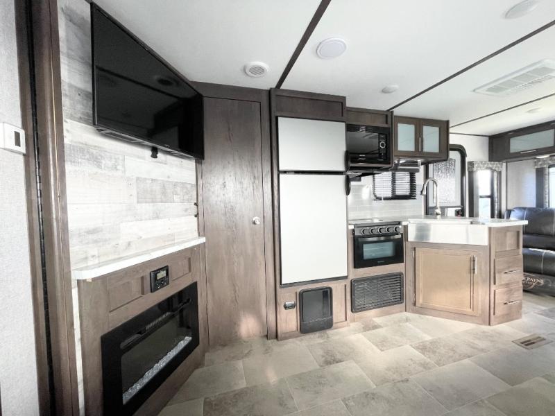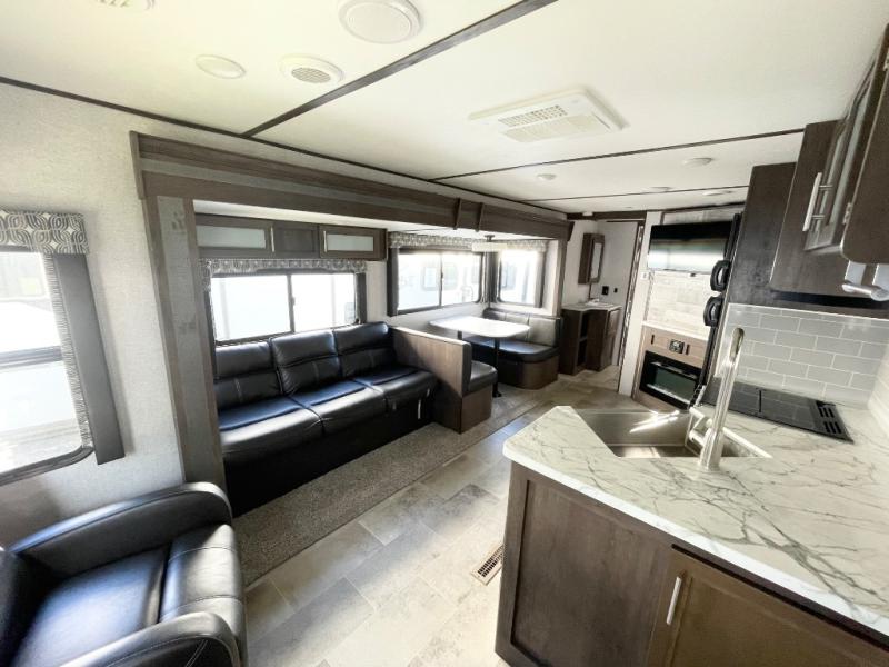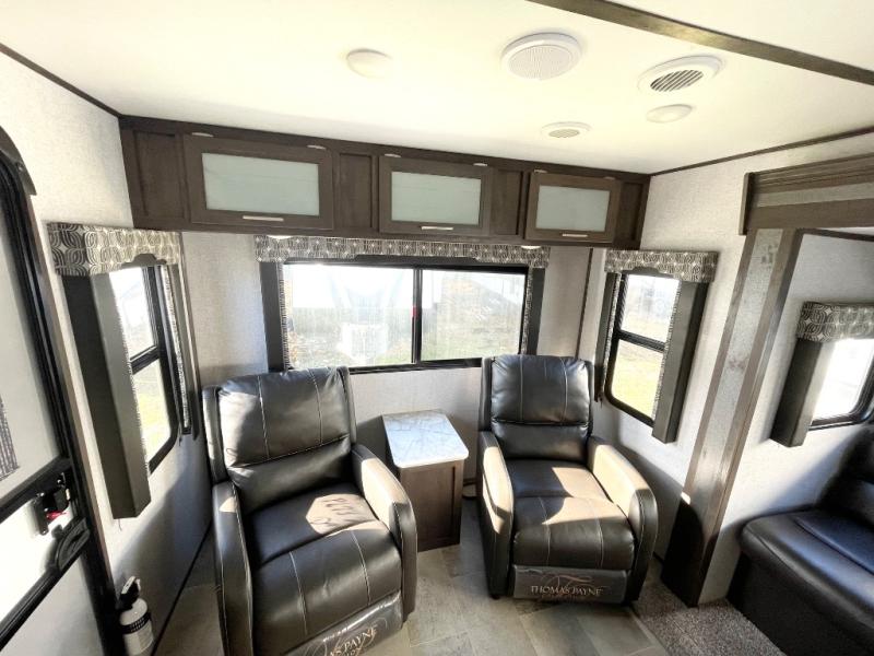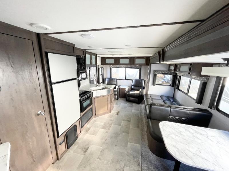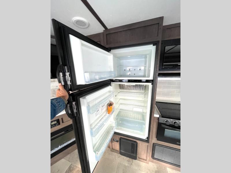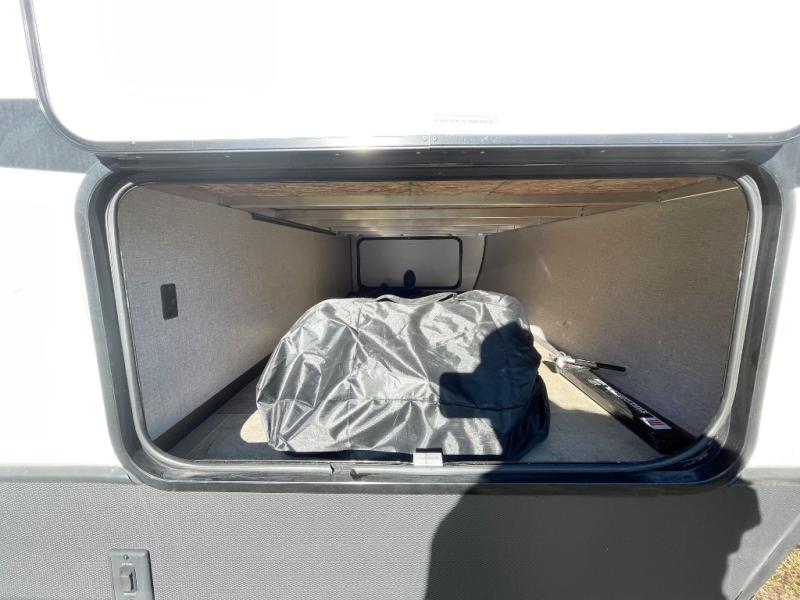 With this Coleman Light travel trailer, you will be so excited to plan your next trip to the campground! Two entry doors make it easy to load up your luggage in the front private bedroom or in the kitchen cabinets through the main living room entrance. You can even keep some of your gear outside in the pass-through storage compartment so that it doesn't clutter up the interior. Once you've done all of the hard work of getting this trailer ready to go, you can set your sights on a fun weekend ahead. When you make it to your destination, simply pull out the large slide to reveal more interior living space and set up the 18' power awning for an extra party space outdoors.