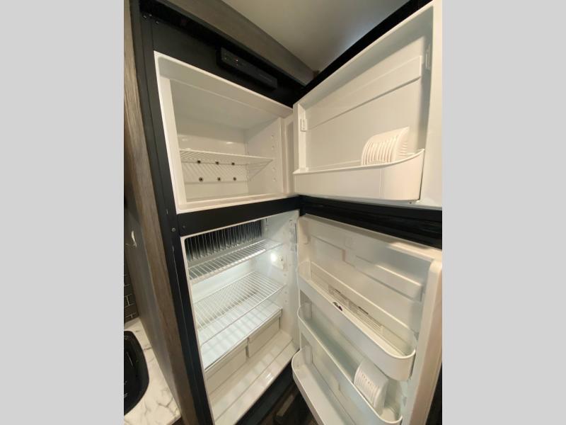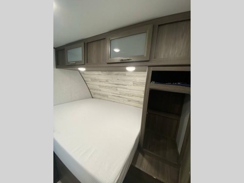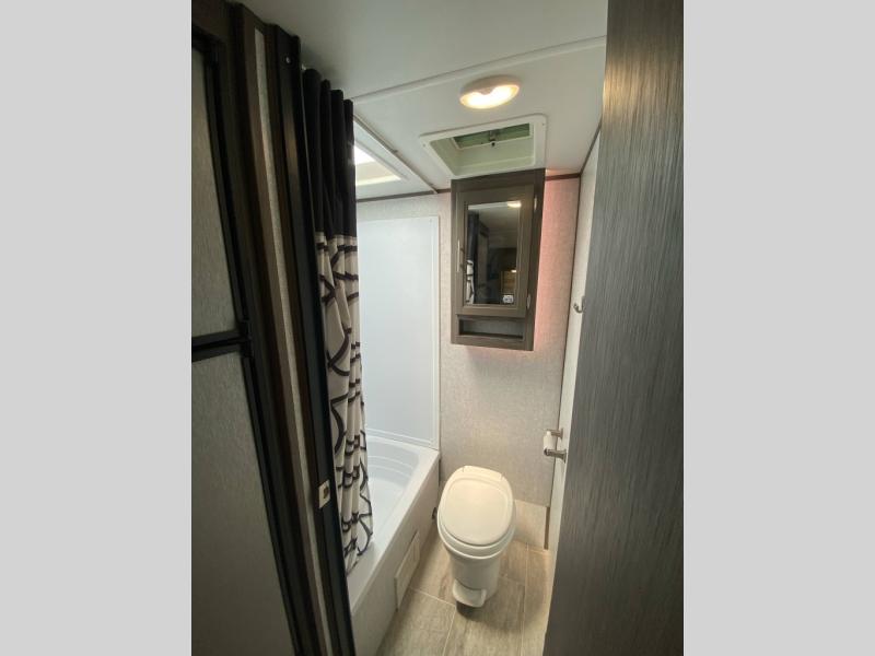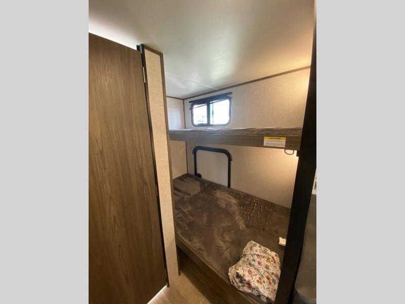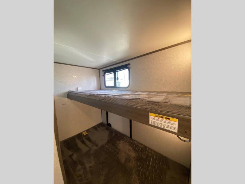 If you have been dreaming about exploring state parks and viewing majestic mountains, but you wish you could take the comforts of home with you, then you need this travel trailer. You will enjoy having enough sleeping space for five people, and you will certainly appreciate having your own private toilet and shower room so that you don't have to search around for a clean facility while on the road. The queen bed will provide plenty of comfort and relaxation each night, and the bunk beds will be an exciting place for the kids to drift off to sleep. The Pack-n-Play door is a handy addition to this trailer, and it allows you to pack your bikes or larger camping essentials more easily.