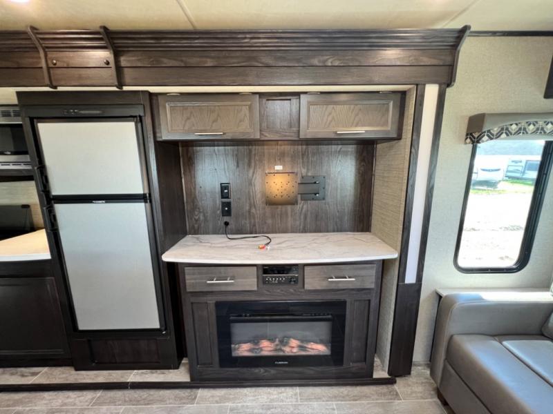 For your next summer vacation, you'll want this Kodiak Ultimate travel trailer that can comfortably sleep six each night. The rear living area with a sofa and a fireplace is cozy and inviting. For an even more relaxing evening, choose to add theater seats. The walk-through bath leads to the front private bedroom that includes a queen bed and wardrobes for all your clothes and shoes. You will love cooking in this kitchen that features a three burner range, a kitchen island, plus a walk-in pantry to hold all your dry goods! For an evening outdoors, cook up some hamburgers on the outdoor kitchen and enjoy the LED awning lights.