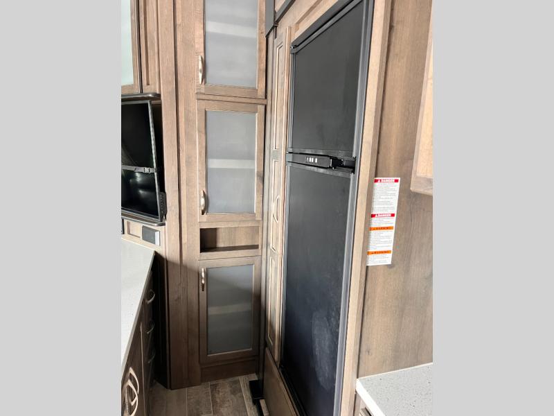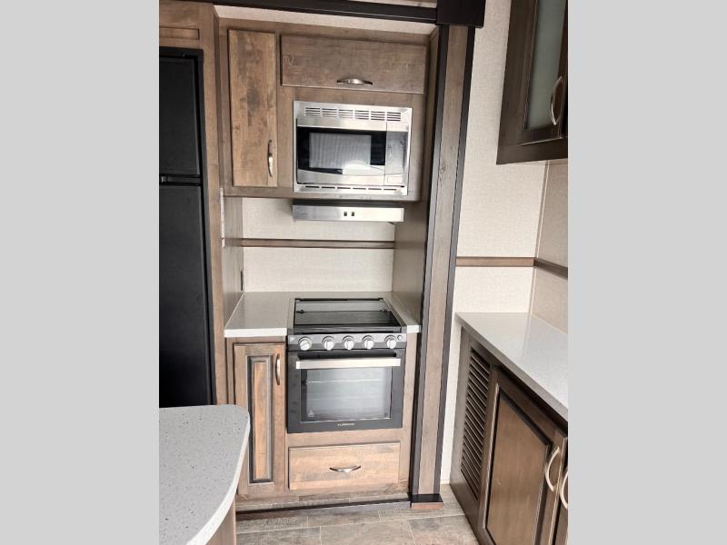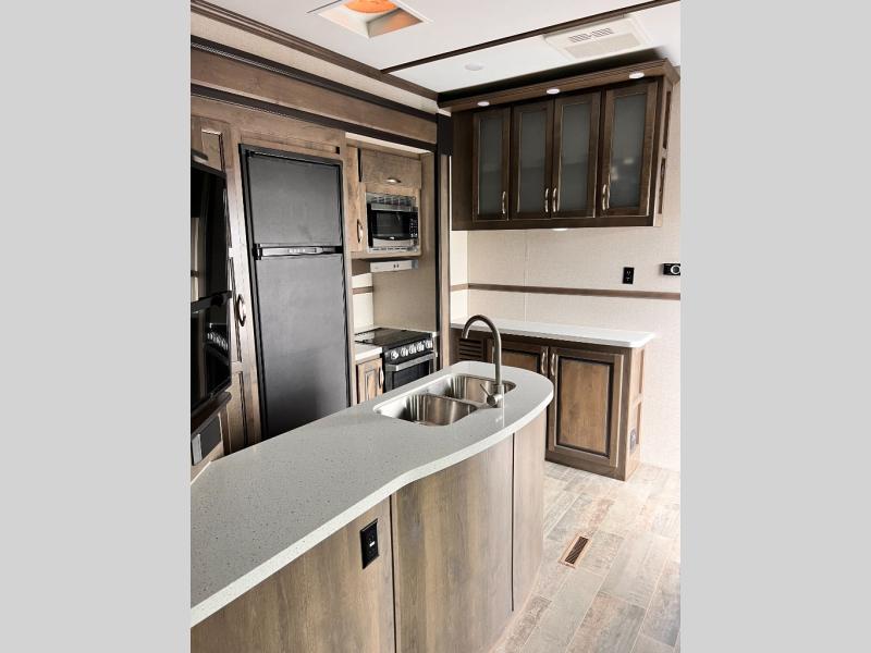 If you have been imagining how to get your toys and family away for fun and adventure, the answer is this Voltage Triton fifth wheel toy hauler! Your toys will have their very own separate area in the 11' garage, and you can relax on the large sofa in the living/kitchen area while the kids hang out in the garage space once the toys are removed. There is a Happi-Jack power bunk above the two fold-up sofas as well as a table that can be used for dining or sleeping, and the twin-size loft provides an extra sleeping space as well. Just imagine moving around the spacious kitchen and main living area thanks to the two opposing slides.