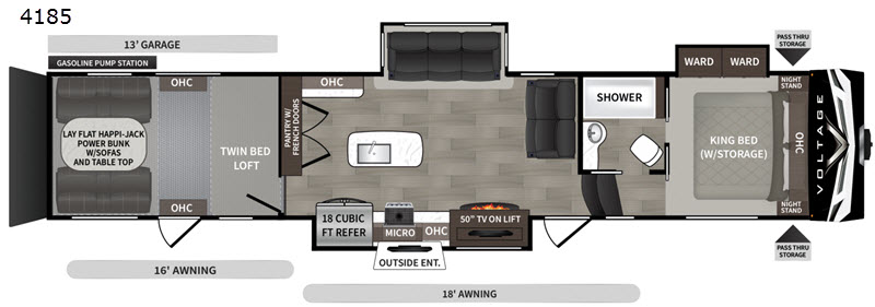 Not all toy haulers are created equal! The Voltage fifth wheel toy hauler by Dutchmen RV offers luxury living and a separate toy box giving you the ultimate experience every time! The interior offers hardwood cabinet doors, upgraded Beauflor linoleum, a heated and massaging residential sofa, and a stainless steel farmer's sink in the kitchen. The garage includes Tuff Ply flooring, 2,500-lb. tie downs secured to the frame, a 12" diamond plate along the garage wall, a Zero-G ramp door, and outside there is a 20-gallon fuel station and a 30-gallon fuel tank to supply your generator. You might get the mobile app to add to the iN-Command remote panel that gives you access to the lights, the generator, the climate systems, and more!