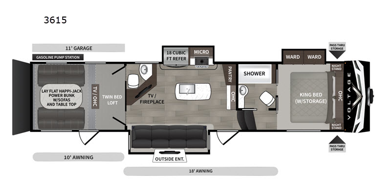 Load up and head out to the off-road park of your dreams where you can easily set up this Voltage toy hauler to relax in comfortably after hitting the trails. You will have a master suite with a king bed and plenty of storage, plus a private entry into the full bathroom. You can relax in the main living and kitchen area on the large sofa slide while watching the 50" TV and staying cozy from the fireplace, or you can sit on the opposing sofas with a table top in the 11' separate garage after the toys have been removed. There is a half bath and a lay-flat Happi-Jack power bunk as well, plus a patio system with zero stack up and a manual awning for an additional outdoor living space above ground.