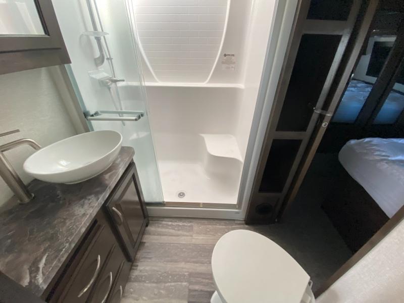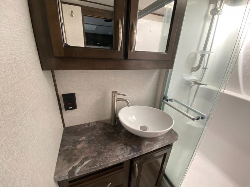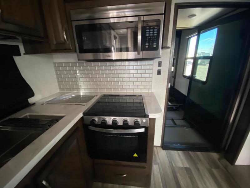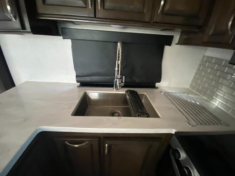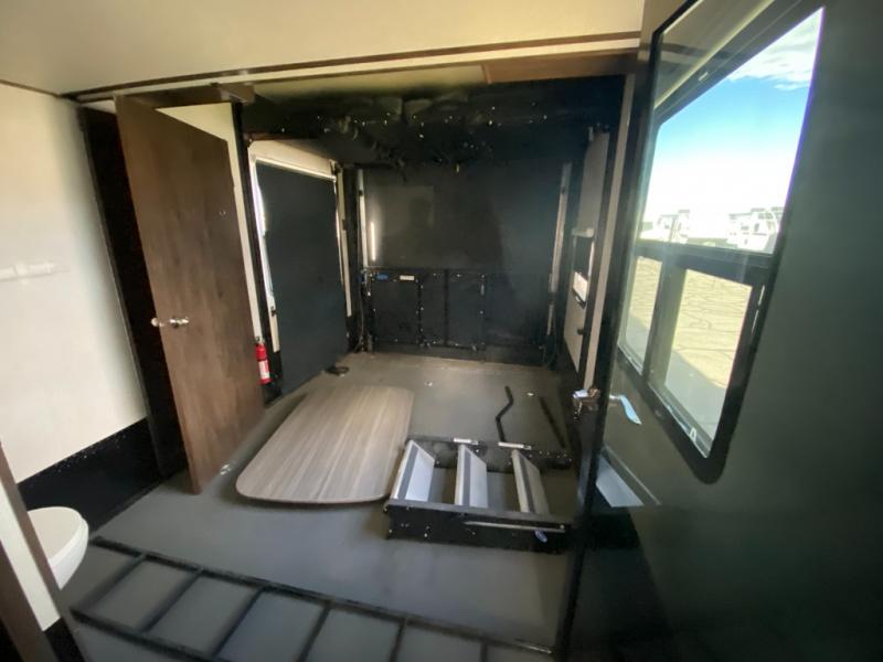 Not all toy haulers are created equal! The Voltage fifth wheel toy hauler by Dutchmen RV offers luxury living and a separate toy box giving you the ultimate experience every time! The interior offers hardwood cabinet doors, upgraded Beauflor linoleum, a heated and massaging residential sofa, and a stainless steel farmer's sink in the kitchen. The garage includes Tuff Ply flooring, 2,500-lb. tie downs secured to the frame, a 12" diamond plate along the garage wall, a Zero-G ramp door, and outside there is a 20-gallon fuel station and a 30-gallon fuel tank to supply your generator. You might get the mobile app to add to the iN-Command remote panel that gives you access to the lights, the generator, the climate systems, and more!