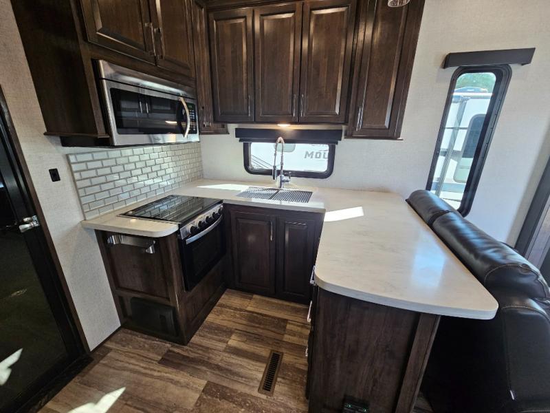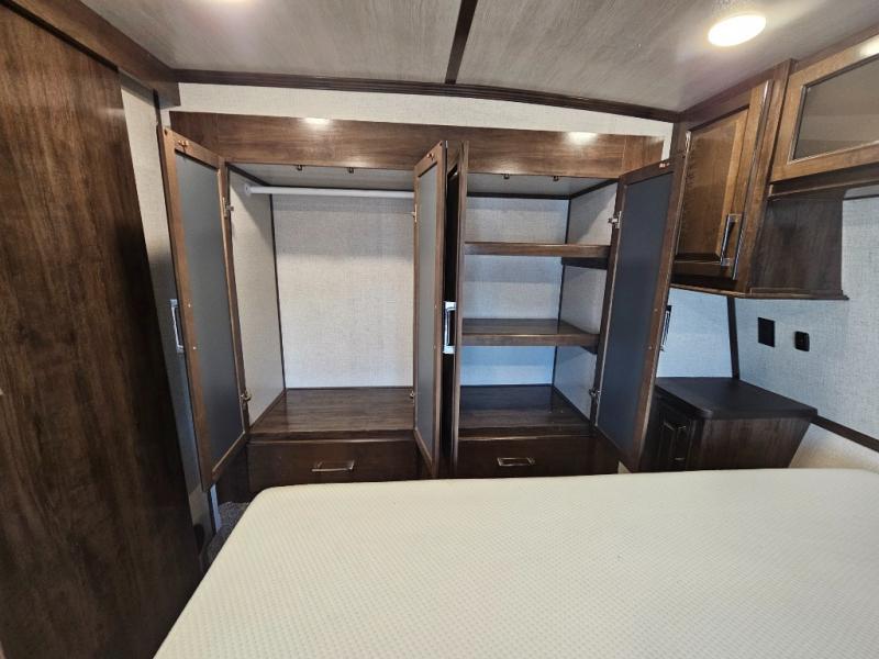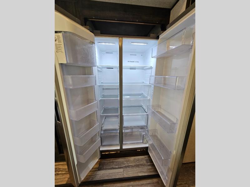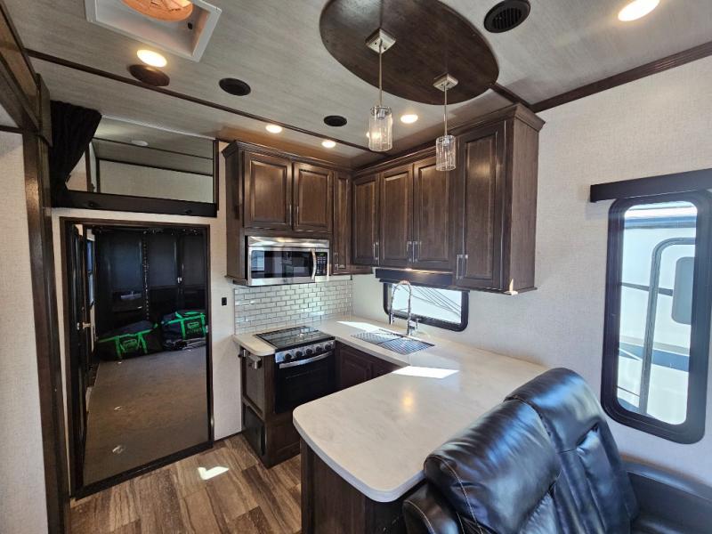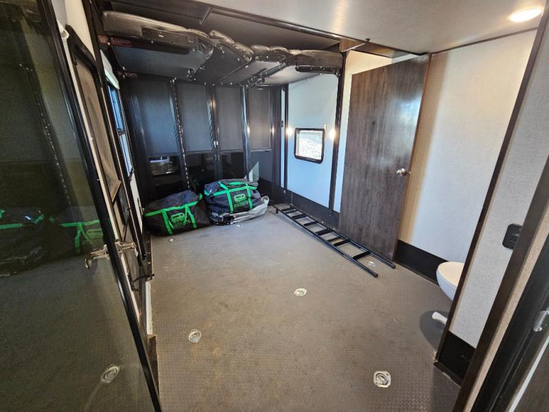 Take this Voltage toy hauler to the lake for some trail-riding fun and don't forget to bring along the family! The 13' separate garage includes a lay-flat Happi-Jack power bunk with two sofas underneath for comfortable sleeping space, and your guests will appreciate their own half bath and their own exterior entry door. You'll find a second entry door leading into the main living area and three sofas for tons of seating space. The chef of the family will love the U-shaped kitchen with plenty of counter space, an 18 cu. ft refrigerator, and an oversized convection microwave. This model also features a dual-entry bath which creates a front master suite that you are sure to love. Here, you will enjoy a king bed with storage underneath, a wardrobe slide, plus dual nightstands for all your things.