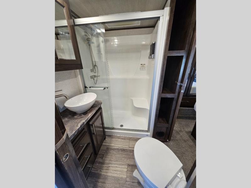 Not all toy haulers are created equal! The Voltage fifth wheel toy hauler by Dutchmen RV offers luxury living and a separate toy box giving you the ultimate experience every time! The interior offers hardwood cabinet doors, upgraded Beauflor linoleum, a heated and massaging residential sofa, and a stainless steel farmer's sink in the kitchen. The garage includes Tuff Ply flooring, 2,500-lb. tie downs secured to the frame, a 12" diamond plate along the garage wall, a Zero-G ramp door, and outside there is a 20-gallon fuel station and a 30-gallon fuel tank to supply your generator. You might get the mobile app to add to the iN-Command remote panel that gives you access to the lights, the generator, the climate systems, and more!