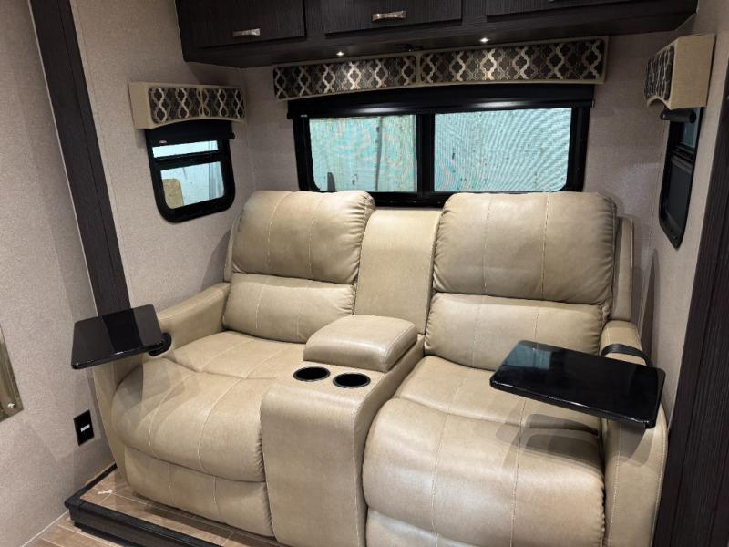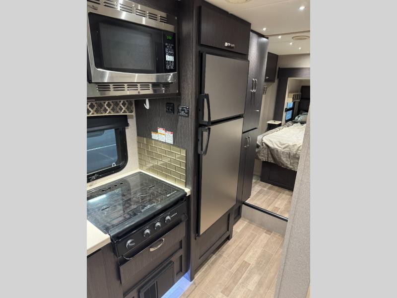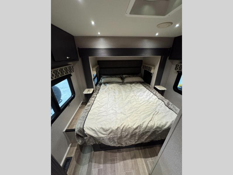 You won't want to pass up your chance to travel luxuriously inside this 24RW Class C diesel motorhome! It features a rear semi-private bedroom with a gel-infused memory foam queen-size bed, a 32" LED TV, and even USB charging ports. The booth dinette is the perfect place for you to enjoy your meals at, play some games, or transform into an extra sleeping space, and if you need even more sleeping space then you can choose to add the optional cab over bunk. When you're ready to wind down your nights, pop a bag of popcorn into the convection microwave oven and then head outdoors to relax underneath the 16' armless awning with LED lights!