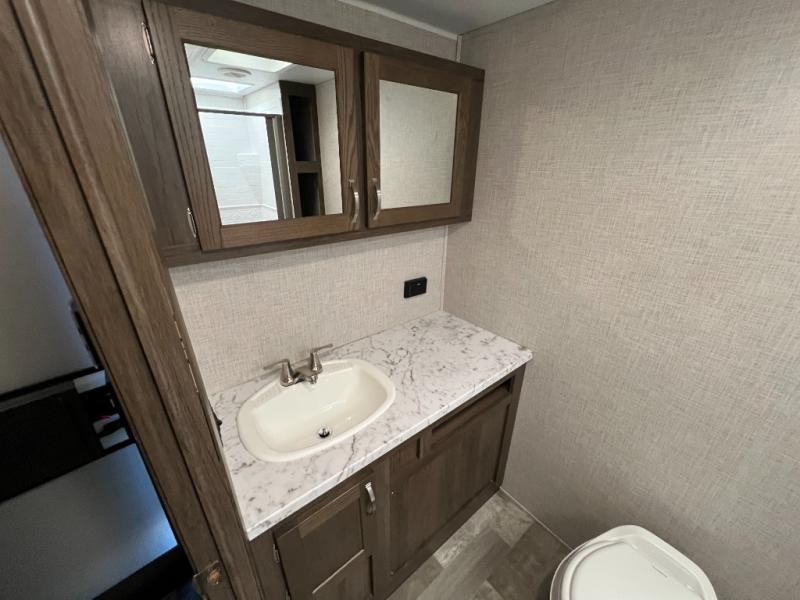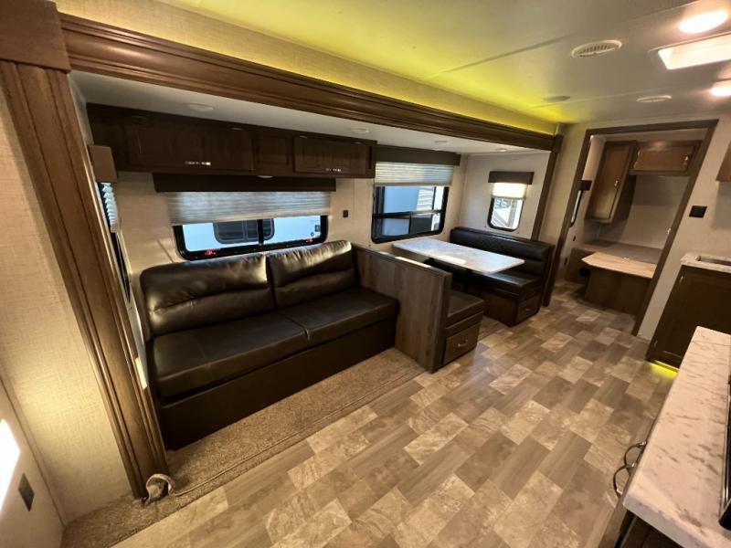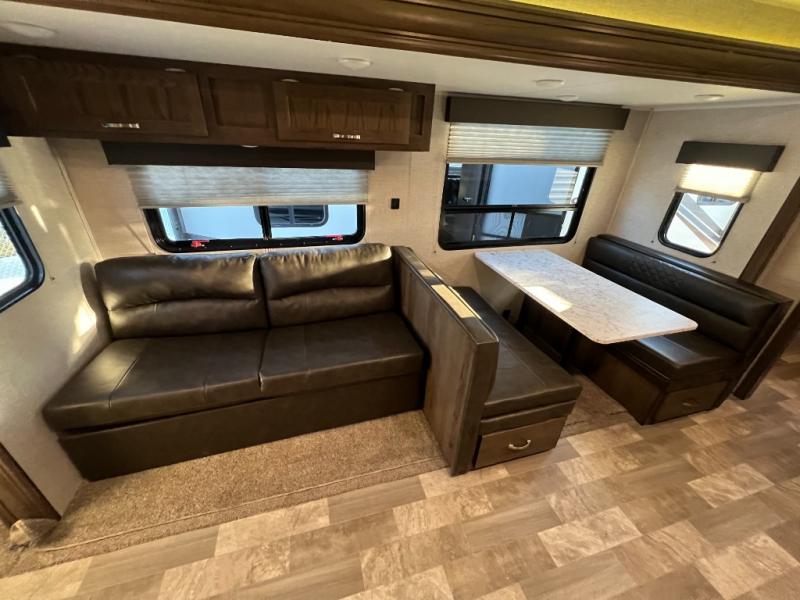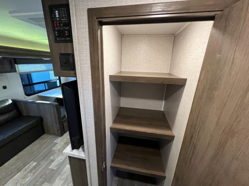 From its full rear bathroom with a 30" x 36" shower and linen closet to its front private bedroom with a king-size bed, under-bed storage, and bedside wardrobes, this Della Terra travel trailer allows you to live just as comfortably as you do at home! The large slide creates extra floor space in the main living area so that you can gather together on the sofa and booth dinette without feeling cramped, and you will be able to grab your favorite snacks from the walk-in pantry before sitting down for a night full of games. And the kitchen offers everything you will need to keep your bellies full including a 10 cu. ft. stainless steel refrigerator.
