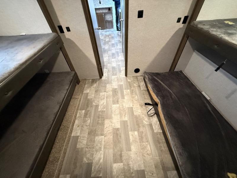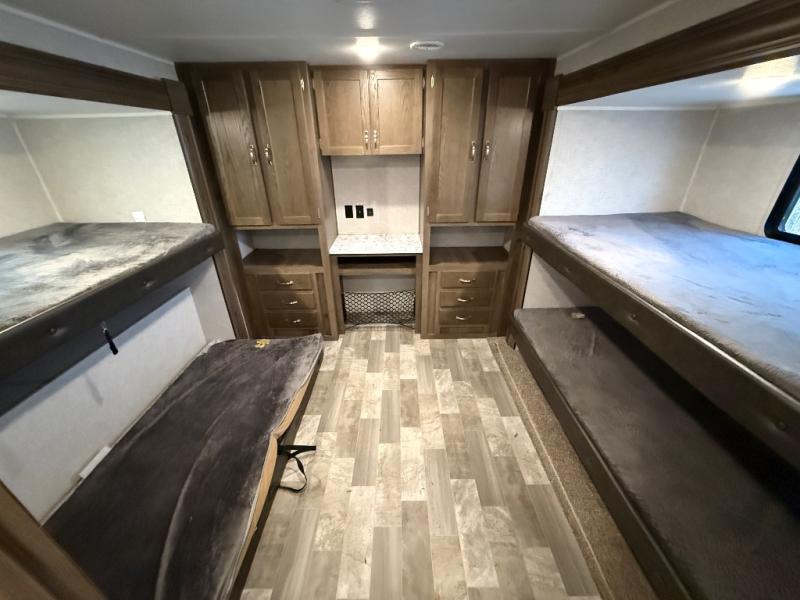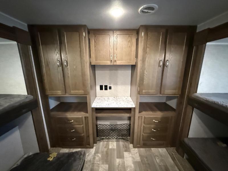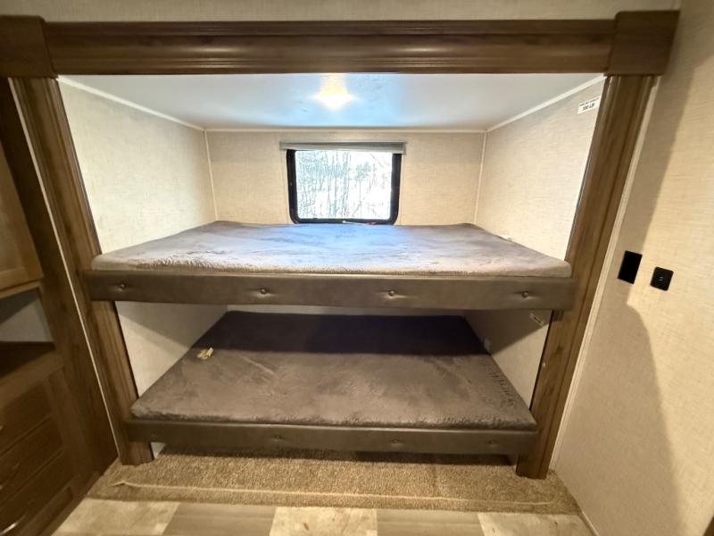 Throughout all of your many adventures, you'll certainly be glad that you chose to bring along this Della Terra travel trailer! This bunkhouse has four bunk beds that rest upon opposing slides so that there is more room to play, and with an entertainment center, a desk, and two wardrobes, the rest of this space is also just as accommodating. You will also find it enjoyable to relax in the main living area because the large slide in there adds more room for you to lounge on the sofa and booth dinette. The cook will love having a full kitchen to make whatever meal they like, plus they might have chosen to add the optional outside kitchen to provide even more choices. Once your day has come to a close, you can head up to the front private bedroom where you will find a king-size bed for your comfort, and the kids can head to the bunkhouse on the opposite side.