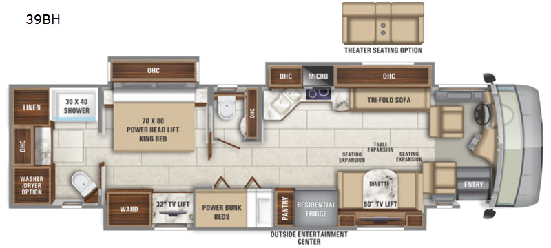 Envision plenty of space for everyone with triple slide outs, power bunks for the kids to have their own bedding, a king size pillow top mattress with a head lift for you to escape to watch your own show, and full kitchen amenities to make holiday meals where ever you decide to set up. You will also appreciate having your own full bathroom with a half bath for the kids and extra guests. You might even choose to add an optional washer and dryer if you plan to travel for long periods of time. The main living and kitchen area offers a unique expanding dinette, and a tri-fold sofa when you decide to relax inside. Come see how this luxury coach will work for your traveling wants and needs.