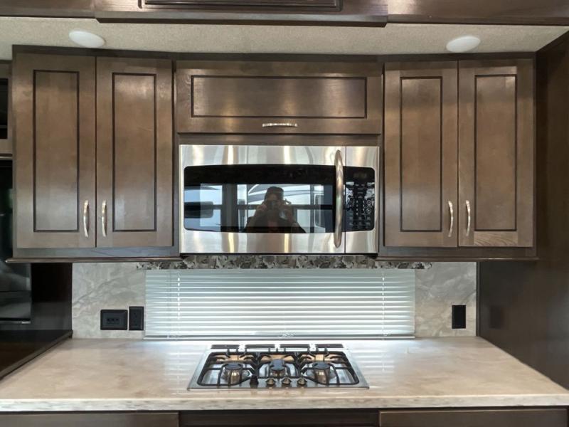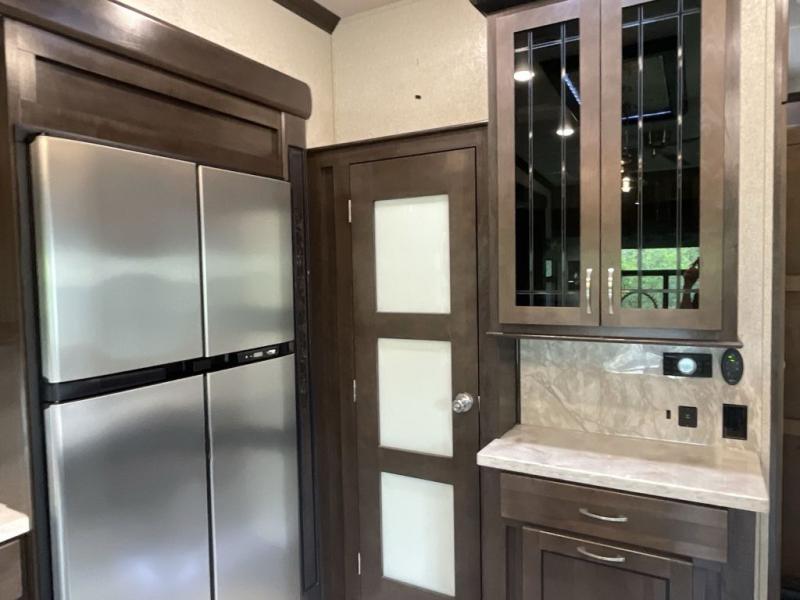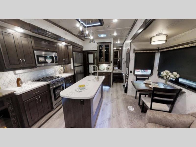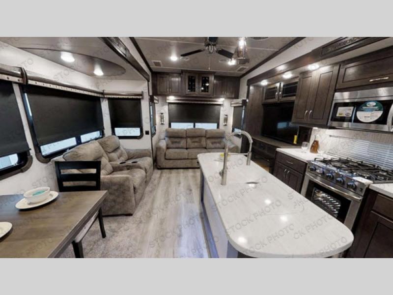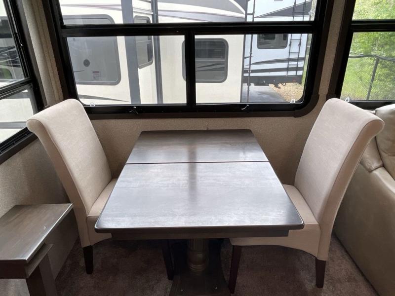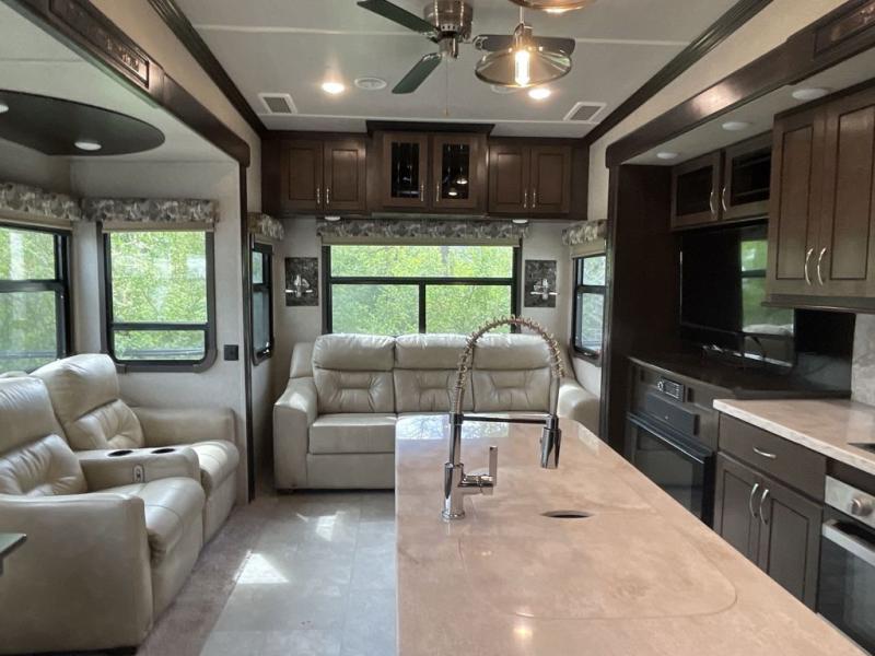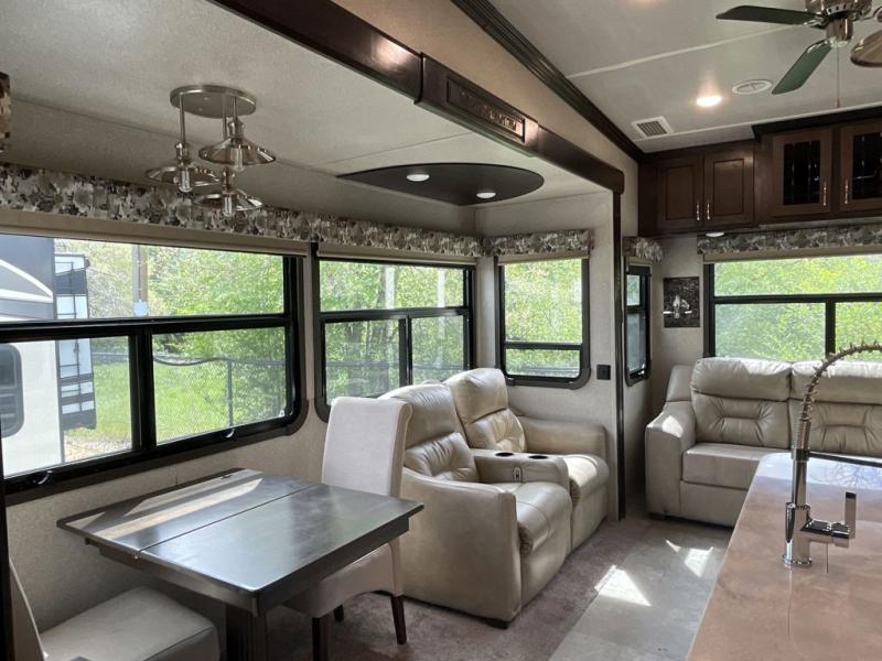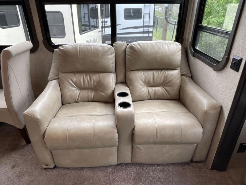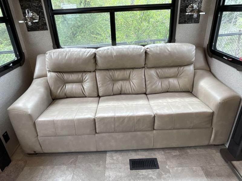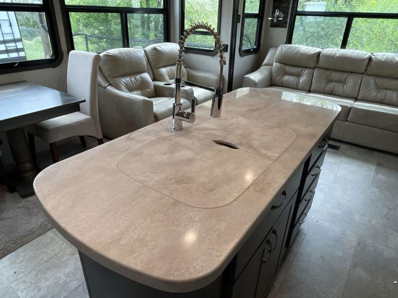 RV living can include all the "must haves" when you own this fifth wheel. Imagine relaxing in the master bedroom with a residential style headboard and luxurious bedding decor, your phones are charging in the USB plug-ins on each side of the king bed, and you are making plans for the day. Someone can be showering in the full bathroom or getting ready using the trough sink with double basin. The living area offers theater seating, a hide-a-bed sofa, and you can work or dine at the free standing table with four chairs. You will enjoy even more features such as the fireplace, the kitchen island, and the option to add an exterior pull-out kitchen with TV, and/or a washer and dryer.