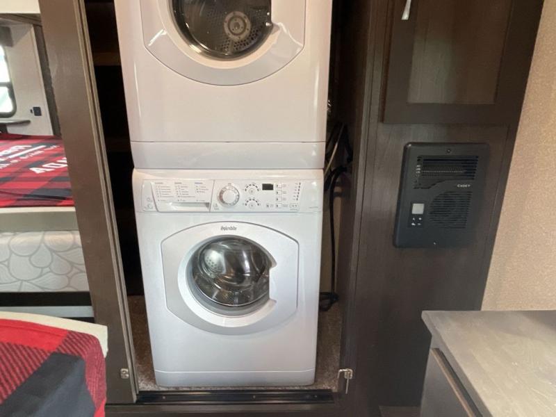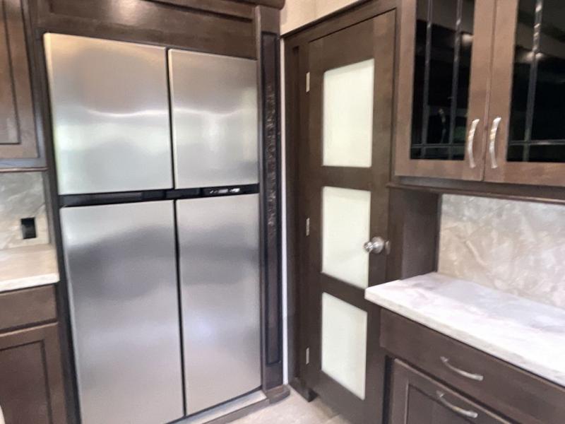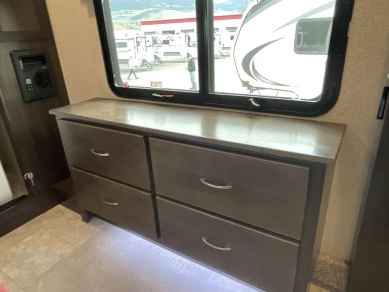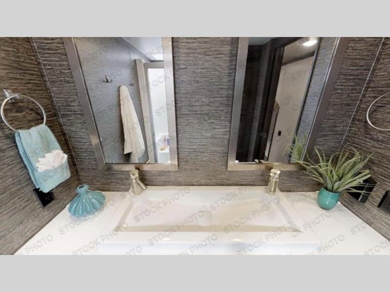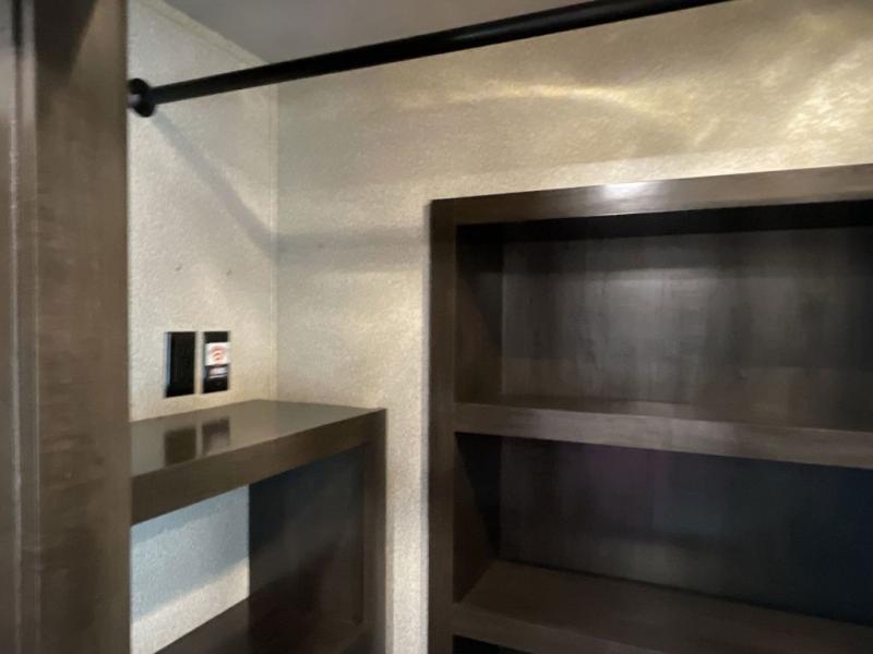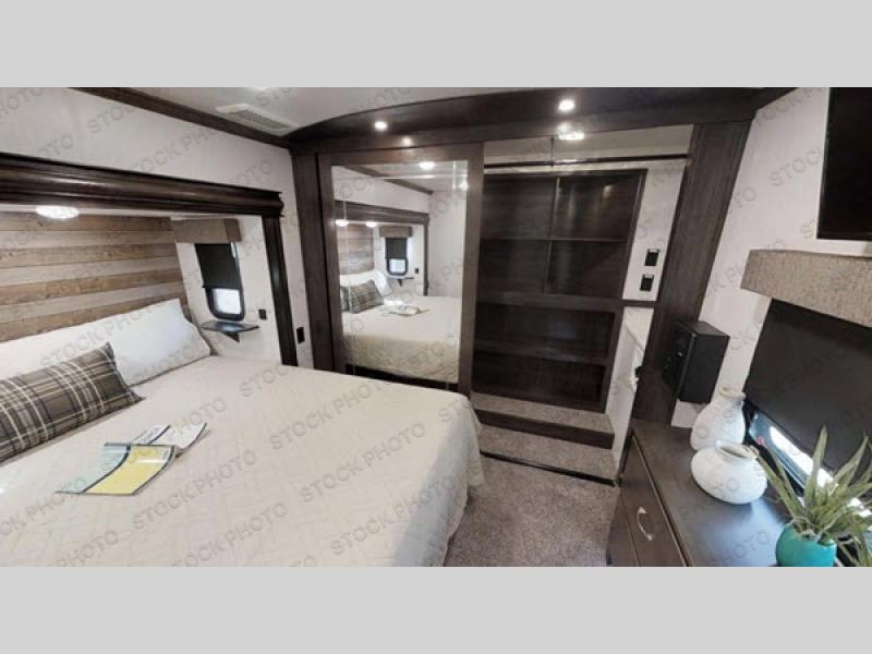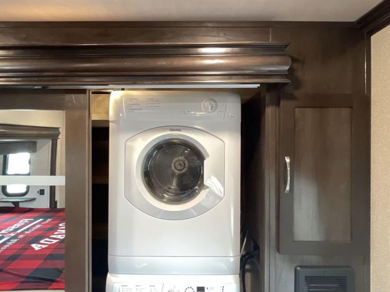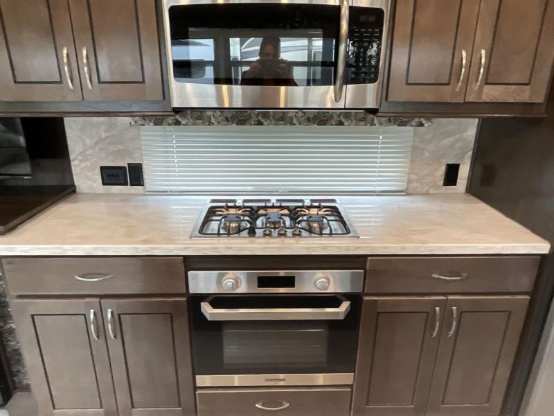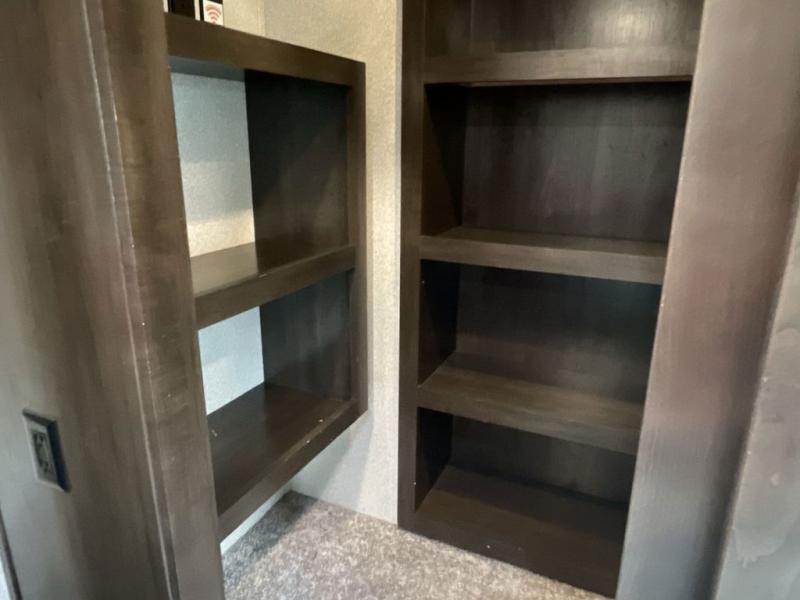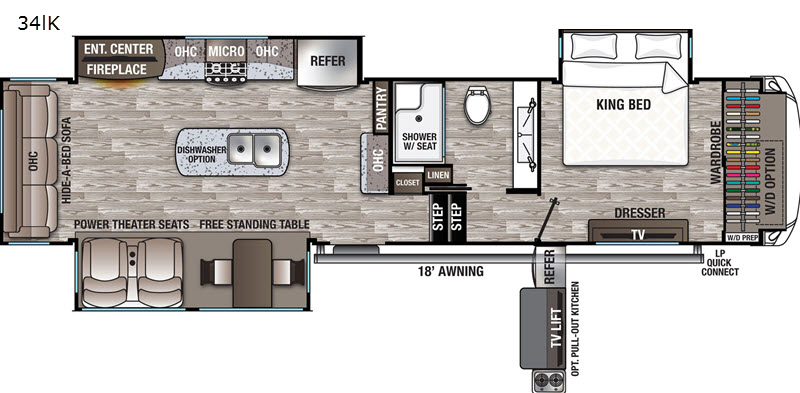 RV living can include all the "must haves" when you own this fifth wheel. Imagine relaxing in the master bedroom with a residential style headboard and luxurious bedding decor, your phones are charging in the USB plug-ins on each side of the king bed, and you are making plans for the day. Someone can be showering in the full bathroom or getting ready using the trough sink with double basin. The living area offers theater seating, a hide-a-bed sofa, and you can work or dine at the free standing table with four chairs. You will enjoy even more features such as the fireplace, the kitchen island, and the option to add an exterior pull-out kitchen with TV, and/or a washer and dryer.