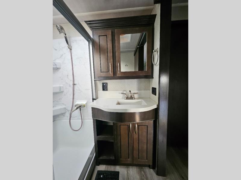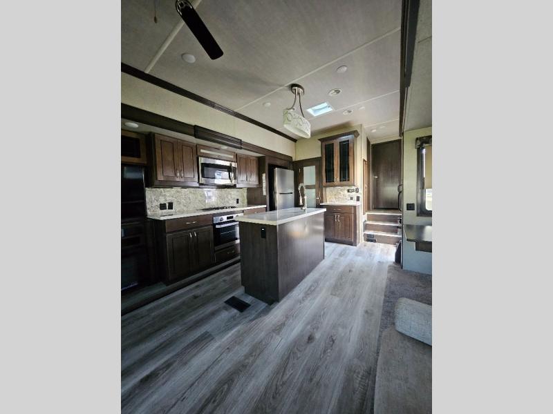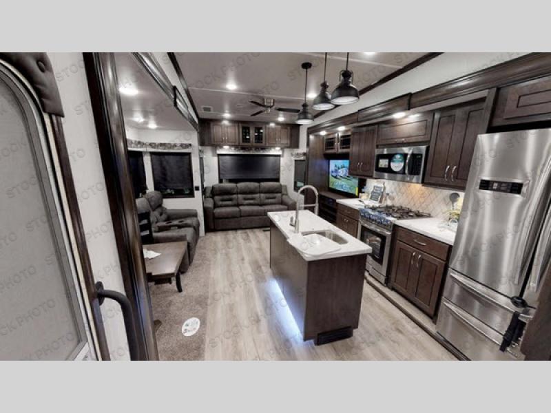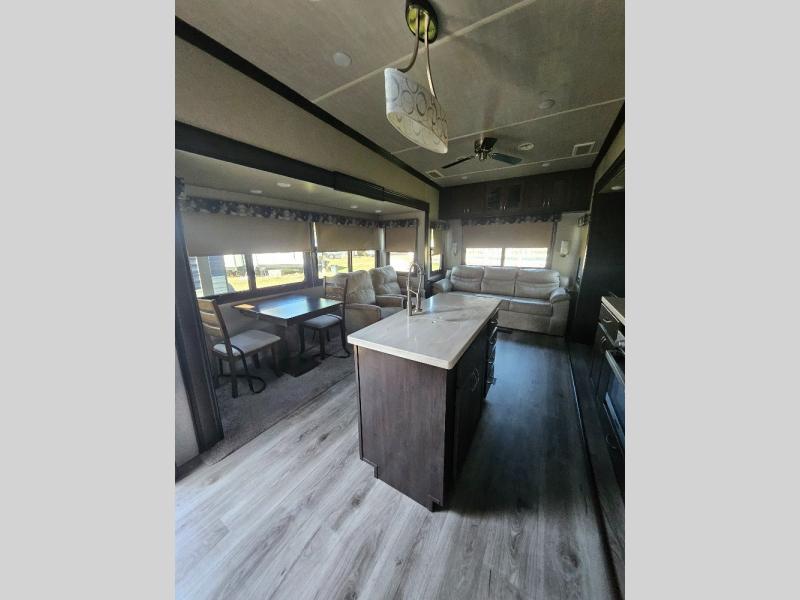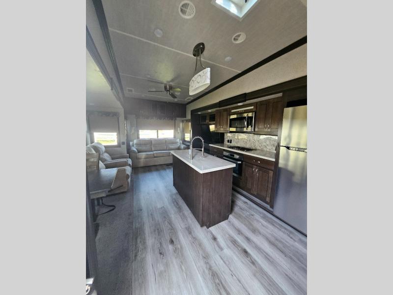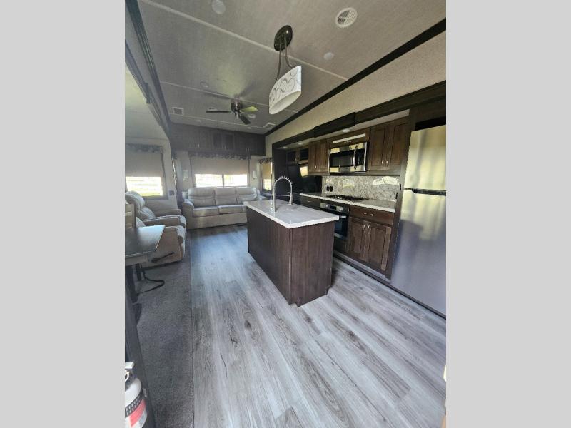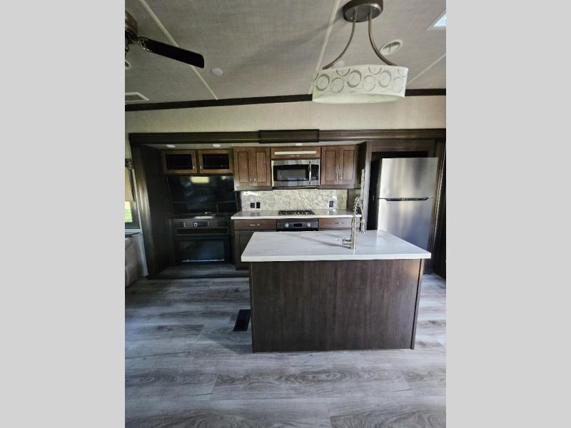 Are you ready to get away for the weekend while still enjoying the luxuries of home? Well then come check out this fifth wheel! It has a convenient kitchen island to provide more counter space and a double bowl sink with a high rise faucet to make clean up a breeze. You will also enjoy relaxing on the sofa or on the power theater seats while you watch a movie on the 50" TV on swing arm. If it's a chilly evening, everyone will love to watch the glow of the fireplace as you reminisce about your day. Mom and dad will love the front private bedroom that features a king bed slide out and a redesigned front wardrobe closet with removable shelves to add a washer and dryer if you choose.