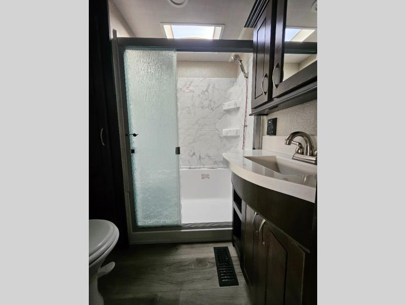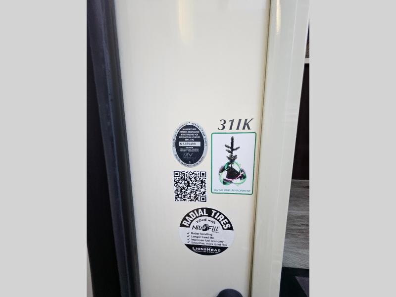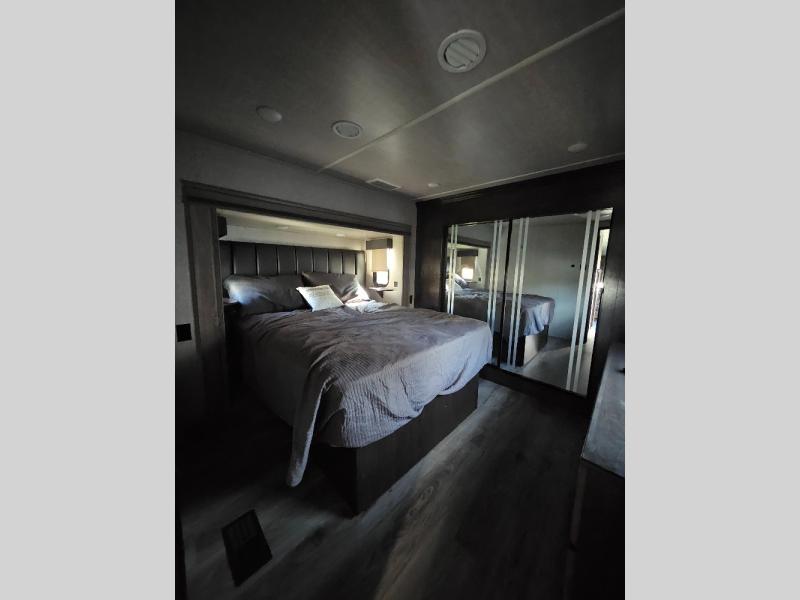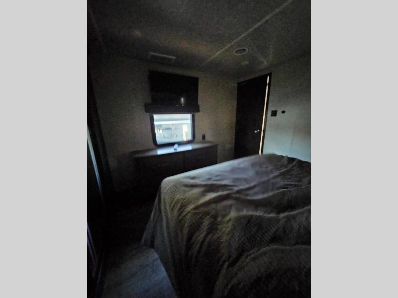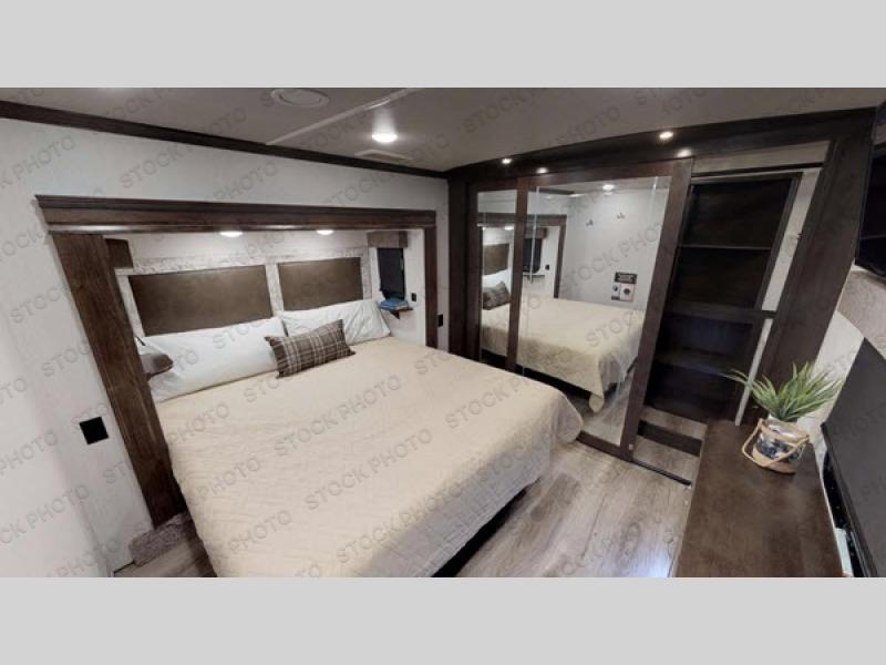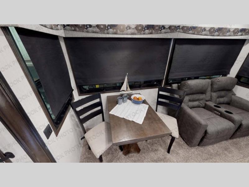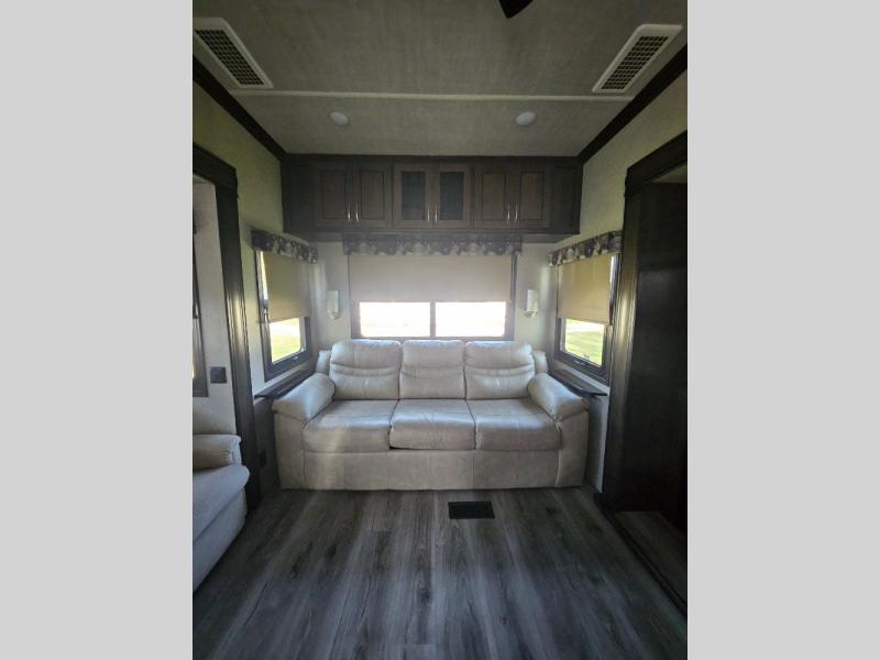 Are you ready to get away for the weekend while still enjoying the luxuries of home? Well then come check out this fifth wheel! It has a convenient kitchen island to provide more counter space and a double bowl sink with a high rise faucet to make clean up a breeze. You will also enjoy relaxing on the sofa or on the power theater seats while you watch a movie on the 50" TV on swing arm. If it's a chilly evening, everyone will love to watch the glow of the fireplace as you reminisce about your day. Mom and dad will love the front private bedroom that features a king bed slide out and a redesigned front wardrobe closet with removable shelves to add a washer and dryer if you choose.