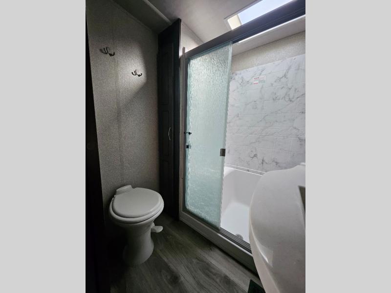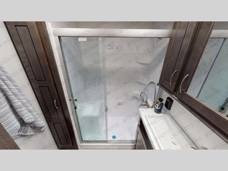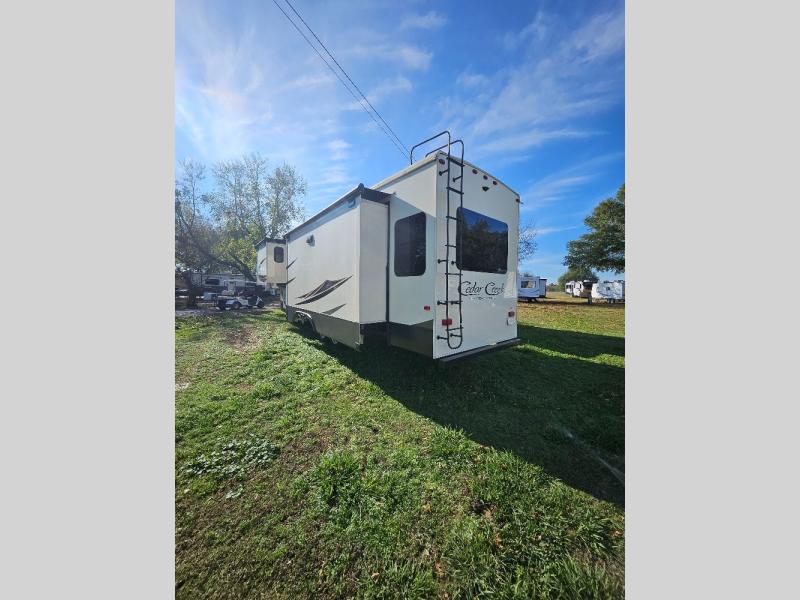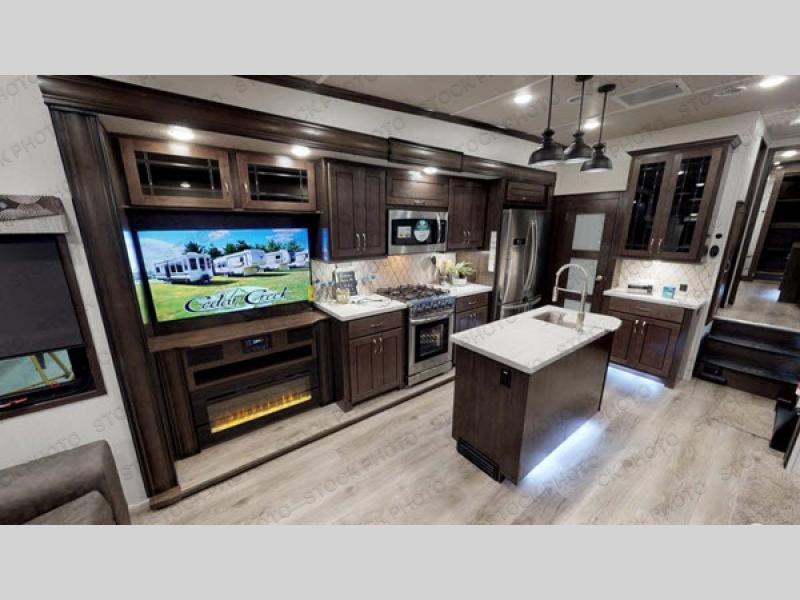 With any Forest River Cedar Creek Silverback Edition fifth wheel you will find Congoleum carefree flooring throughout and in the dining slide there is Shaw carpeting to give an at-home feel. The kitchen has everything that you would expect to find at home, including an Insignia, free-standing 24" four burner gas range, solid surface countertops, a 20 cu.ft. stainless steel refrigerator with an icemaker, and a Fantastic Create-A-Breeze fan with a rain sensor and thermostat. Each model features a fireplace, under-bed storage for all your luggage, a rectangular shower with a large seat and sliding glass doors, plus a space that has been prepped to add a washer and dryer if you choose. These models also include Dexter Heavy Duty Axles with E-Z Lube Hubs, Dexter Nev-R-Adjust Brakes, plus Dexter E-Z Flex Suspension with greased Zerk fittings for a smooth ride each trip!