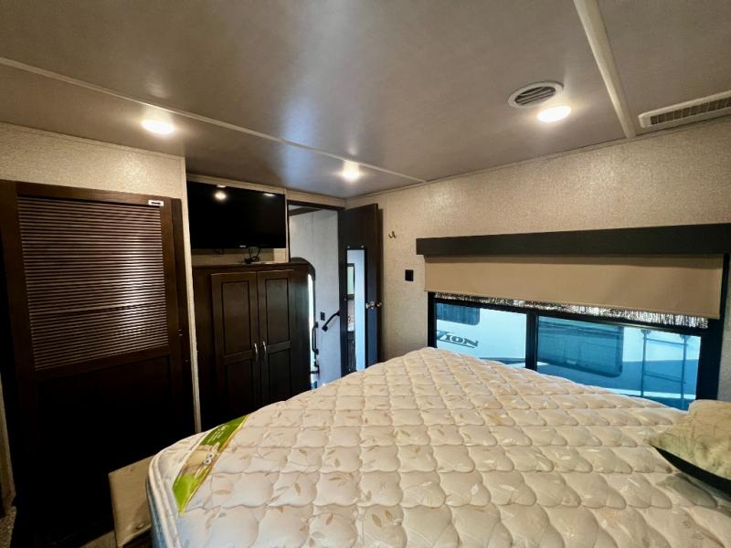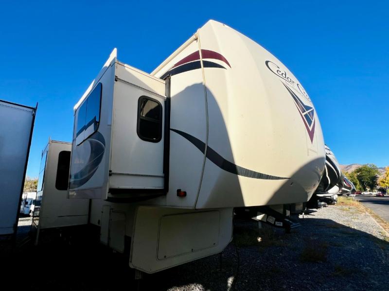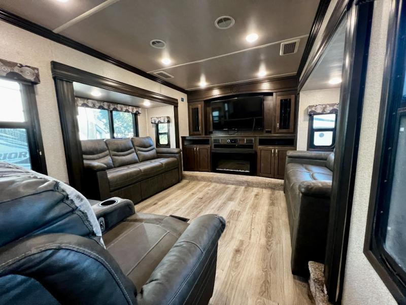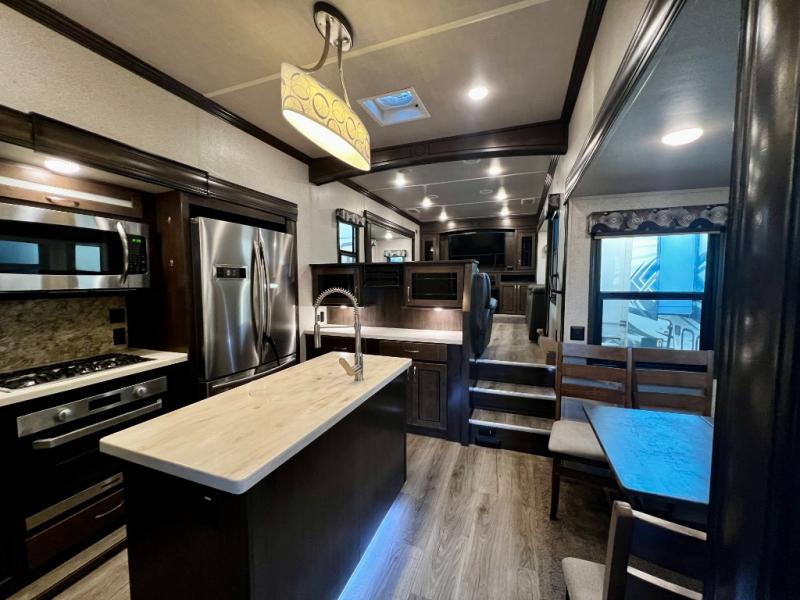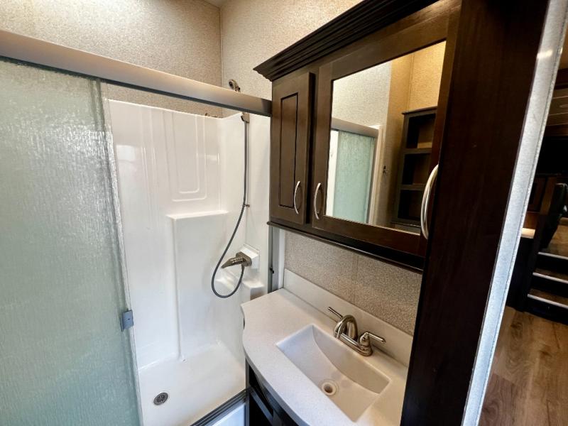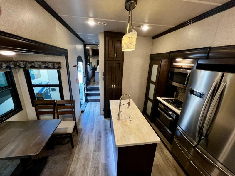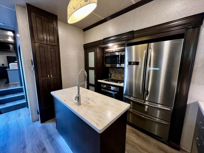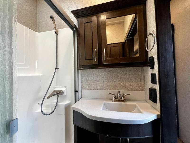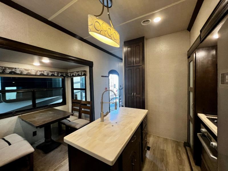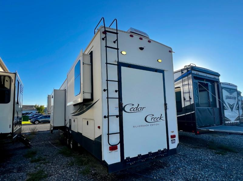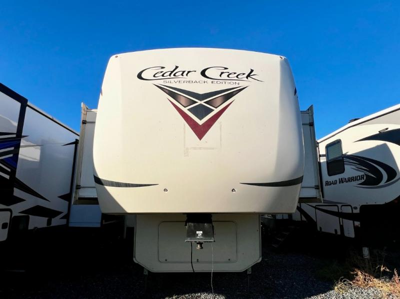With any Forest River Cedar Creek Silverback Edition fifth wheel you will find Congoleum carefree flooring throughout and in the dining slide there is Shaw carpeting. The kitchen has everything that you would expect to find at home and more from the Furrion chef's kitchen with a gas cooktop, to the full panel backsplash, you won’t be disappointed! The 36" electric fireplace, the Jensen 12 volt CD/DVD/AM/FM/MP3/USB stereo system with a smart control app and Bluetooth, and the 50" LED TV with a swing arm in the living room are sure to be crowd pleasers! Each fifth wheel is constructed with Cedar Creek's famous all aluminum super-structure with a radius wrap metal skirt, and a Z-frame. Plus each comes with a Dexter safety and performance package which includes Dexter axles/brakes/suspension, and a Dexter E-Z flex rubber equalization system with bronze bushings and six greased zerks per side. You are sure to love camping in any one of these Forest River Cedar Creek Silverback fifth wheels so come choose your favorite one today!